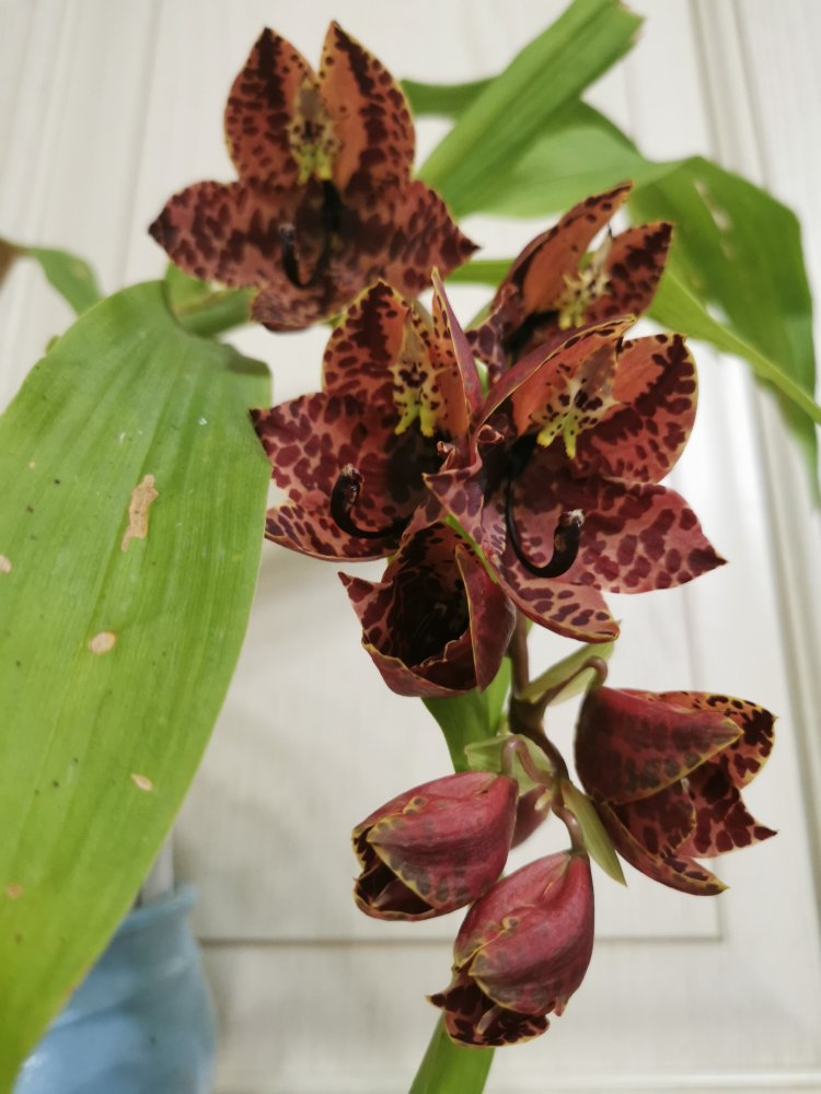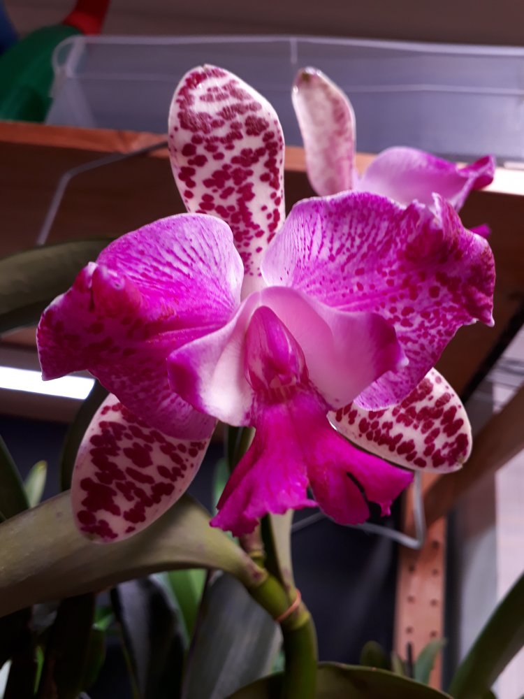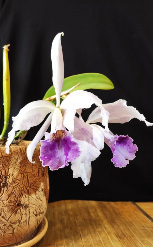 1. Сначала моё разочарование. Самый первый раз в моей жизни у меня зацвела каттлея. Красотка приехала из Австралии. Редкий гибрид, мне прислали его заменой, сама бы ни за что на тот момент не заказала, не могла даже представить, насколько он красив. От EzigroOrchids, декабрь 2017. Приехала взрослая каттлея, цветшая, сразу укоренилась, росла и радовала, вырастила две бульбы у меня, с одной - вырастила чехол, со второй двойной чехол - и из него зацвела двумя цветами. Невероятно изящная, цветы по 18 см, с запахом, пахнет лилией и розой... Цвет, какой я хотела, форма цветка - покорила моё сердце, иначе нельзя сказать... Почему разочарование? Растение оказалось вирусным. На одном листе уже по приезде были вдавленные черные кольца пятнистости. Я подумала, что погрызены... Но когда цветок распустился - поняла, что это не погрызы. Очень характерное нарушение однородности окраса цветков... Увы(( вирус(((