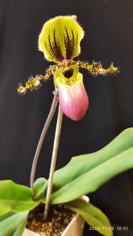 4. Paphiopedilum chamberlianianum - 4n. От Miki. Приехал в июне 2018, вместе с малышкой-каттлеей. Этот башмачок приглянулся мужу. Своими завитыми мохнатыми "усами". Он просил подарить ему на день рождения такой башмачок. Очень неторопливое растение, вот что могу сказать. Очень. Приехало о пяти листьях, такого же размера как и сейчас, с хорошей корневой - рабочие корни, заняли половину горшка точно. Два года степенно наращивал новые листья, адаптировался, сбрасывал старые... цвести не хотел. Так что это первое цветение. Очень нежно выглядит цветок. Ну, и искажает камера цвет всё-таки. Цветок не такой жёлтый. Он более салатовый.