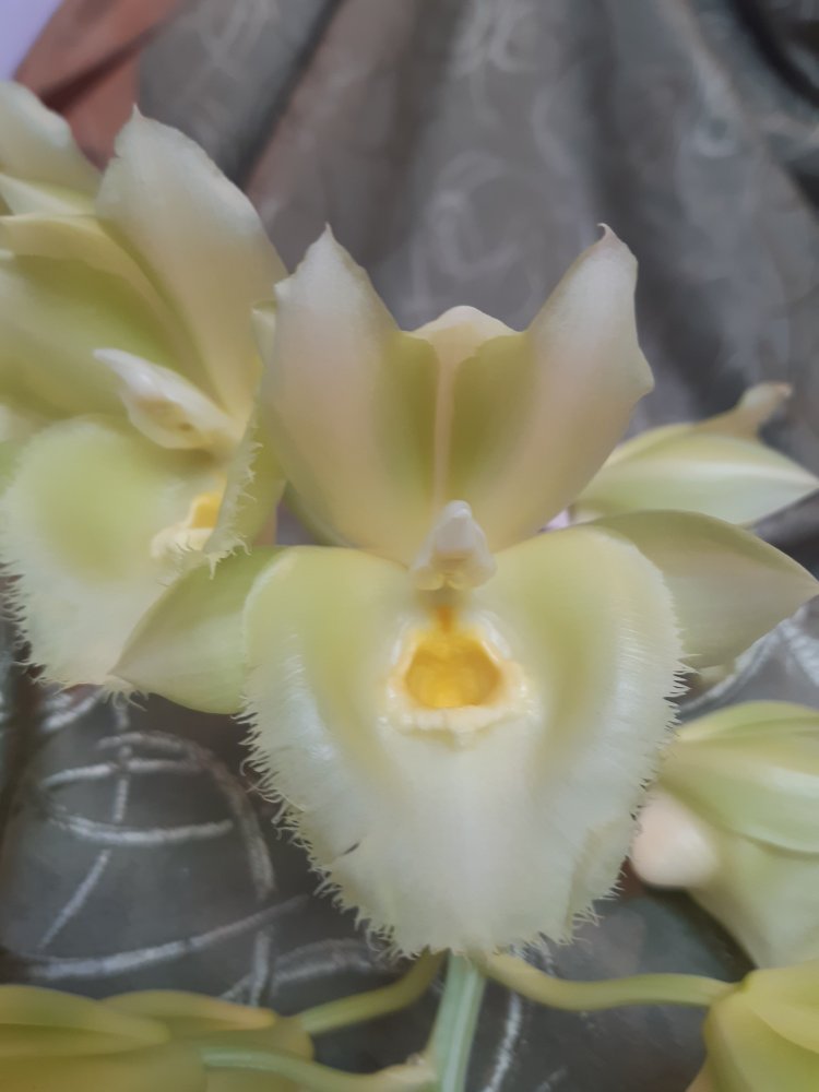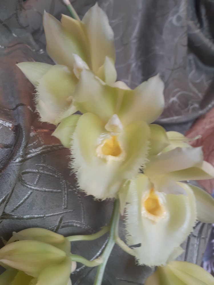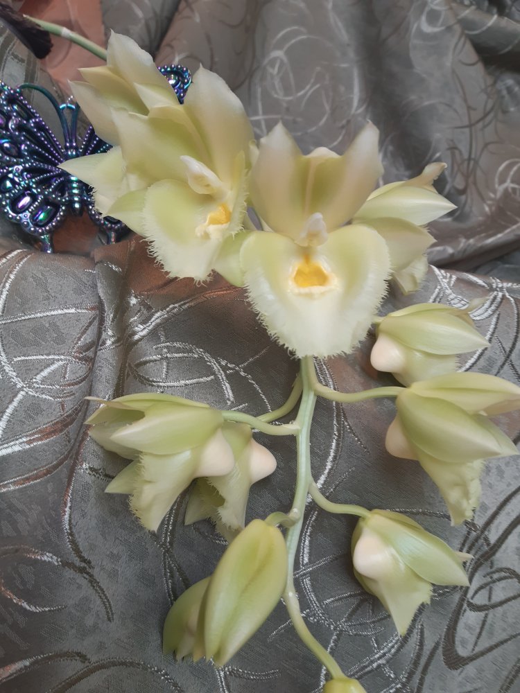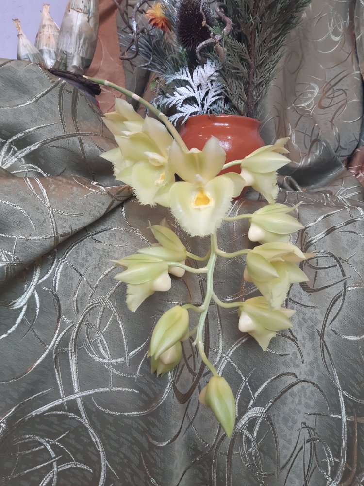 Clowesetum Jumbo Glory 'Jumbo Golden Elf', цветок 7*8 см, пахнет микстурой от кашля с примесью цветов. Приятно.