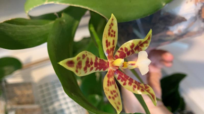 Первое цветение P.Micholitzii x P. Pantherina (Yaphon, получен был сыном подруги 20.08., у меня оказался уже 09.2019). Красивый! Лаковый, не пахнет (мне это важно). Цветок размером см.5. Пришел с двумя цветоносами и на обоих с конца нашей израильской зимы начал наливать бутоны.