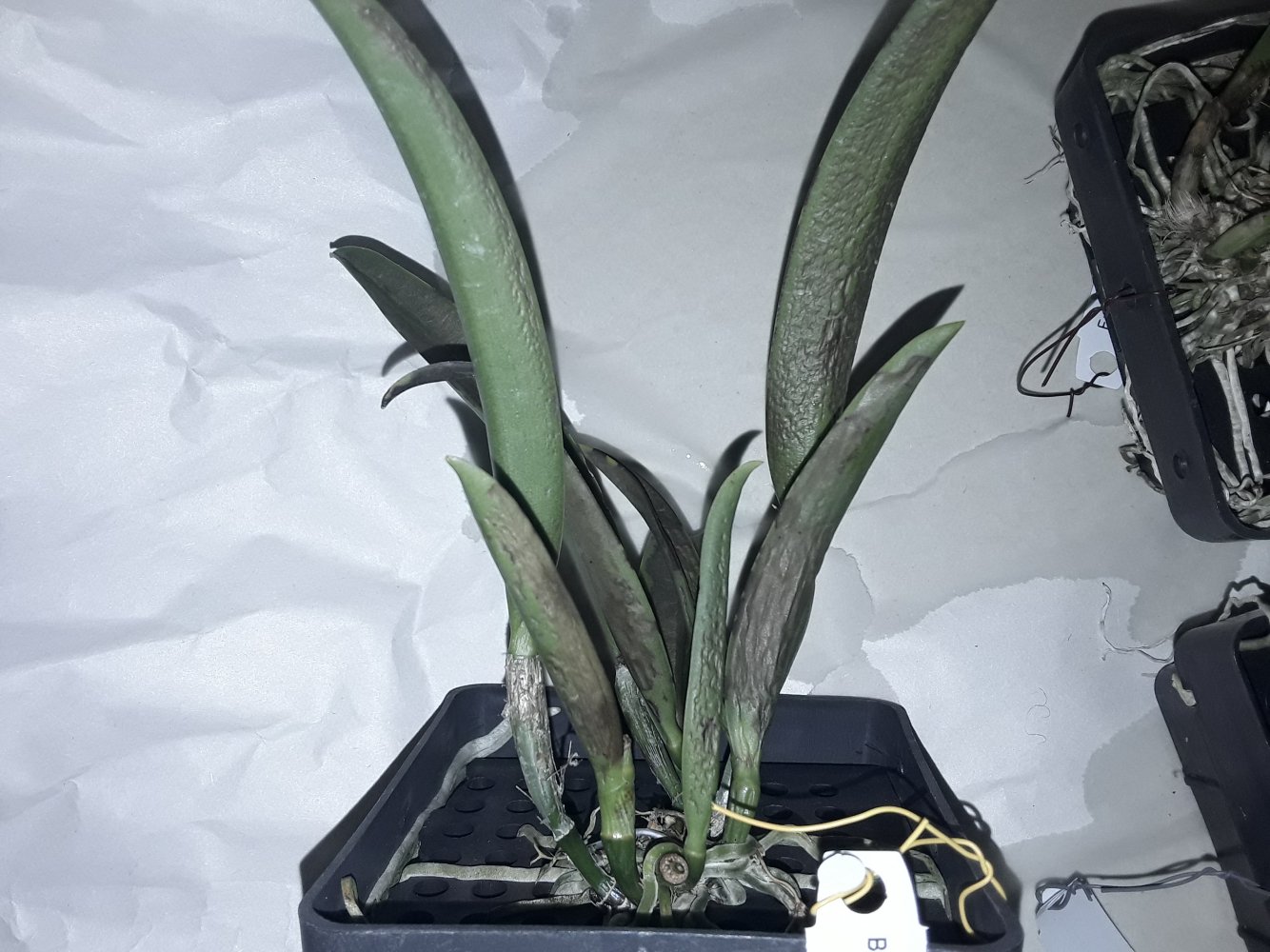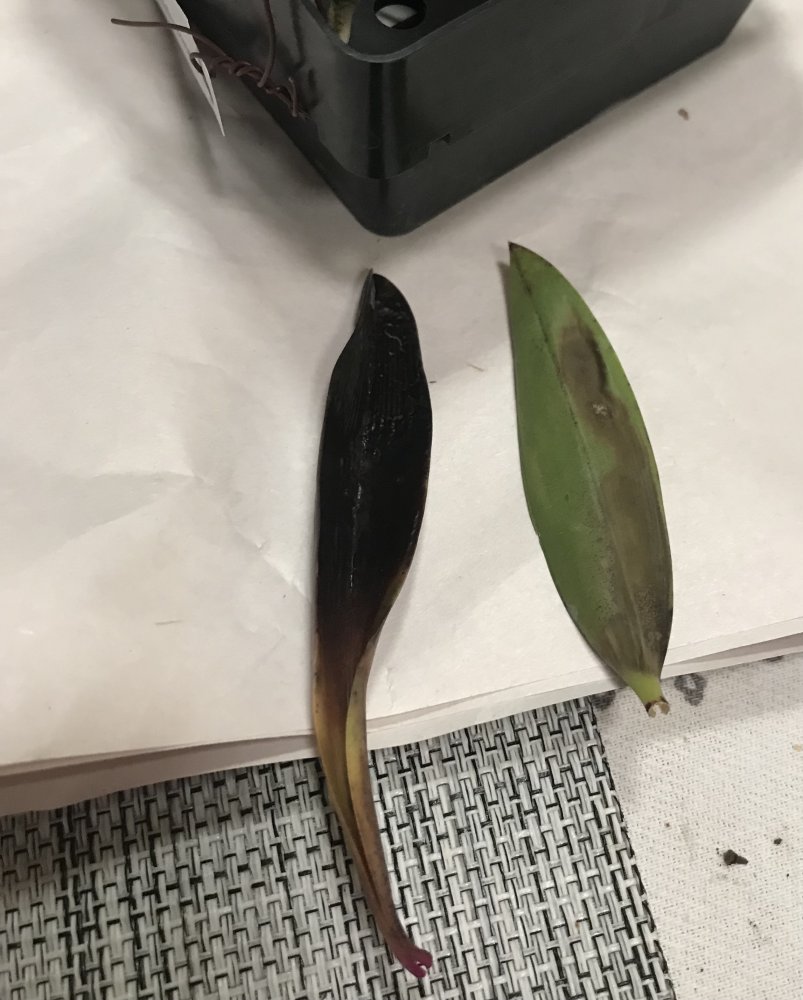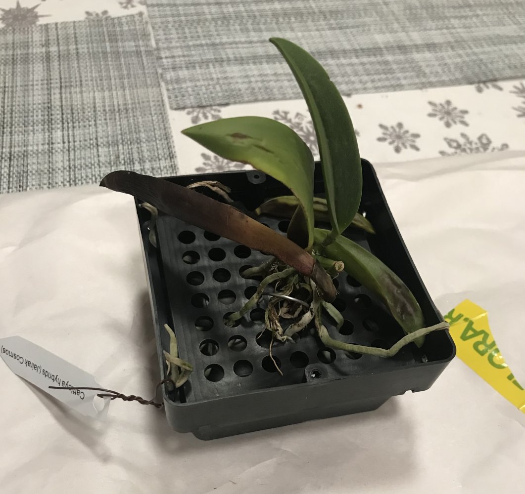 Cattleya Jairak Cosmos. Себе покупала несколько катлей, на листьях потеки коричневого цвета. Но листья плотные не мягкие, только цвет изменился.