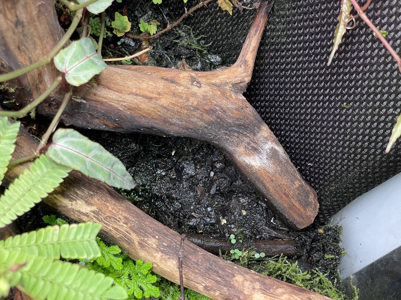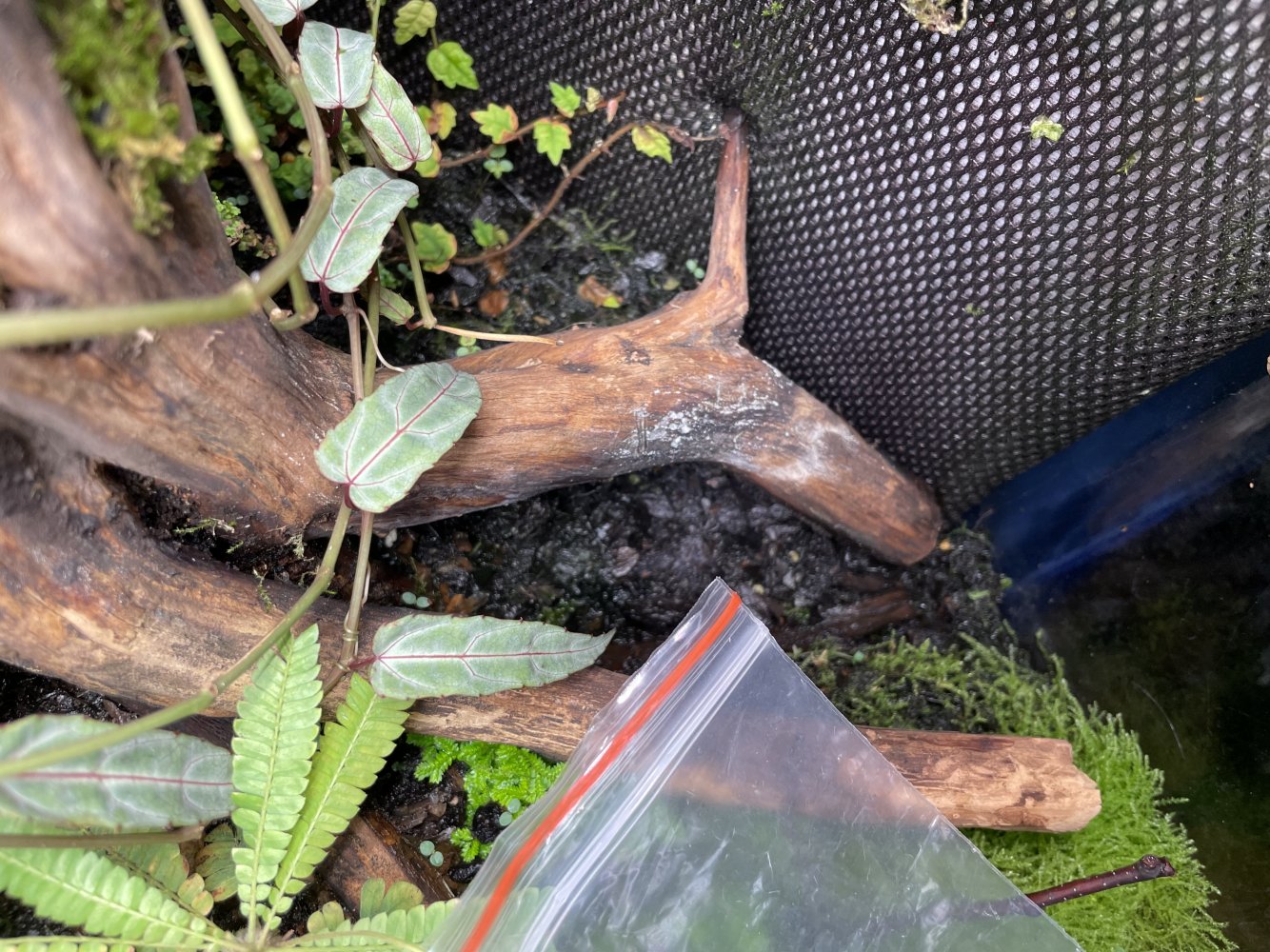 Плесень образуется на разлагающихся частях растений, коряг и тп, на "новичках" и при низкой температуре воздуха (меньше 20 градусов). Поэтому при появлении плесени, сначала убедиться, что ничего не гниет (из растений), проверить температуру и постараться ее увеличить. На корягах - если все гниющие части убрать, продезинфицировать, то потом можно уже не обращать внимания, плесень сама со временем уйдет. Особенно когда аквариум будет густо заселен мхами, они будут поддерживать микроклимат, препятствующий образованию плесени. Можно в этих же целях дополнительно подселить туда обычный живой мох сфагнум. У меня маленький аквариум, вверху круглое отверстие ддя проветривания с крышкой. Вот эту крышку никогда не закрываю, всегда держу открытой. Другого проветривания нет. Поливаю тоже из помпы (осмосом) всех прямо поверх как дождем, вода и на стенках остается, и на дне около 1 см. Закрываю сразу и все. Плесени нигде нет. Но всегда сразу убираю отмершие листики от растений и тп. Кстати, лучшее средство от плесени для растений - чеснок. Попробуйте натереть заплесневевшую корягу, например, долькой чеснока, посмотрите на результат)). Также тертый чеснок можно класть на субстрат к орхидеям для избавления от плесени и даже протирать им части орхидей. Им совершенно никакого вреда не будет, а плесень исчезнет если не навсегда, то очень надолго.