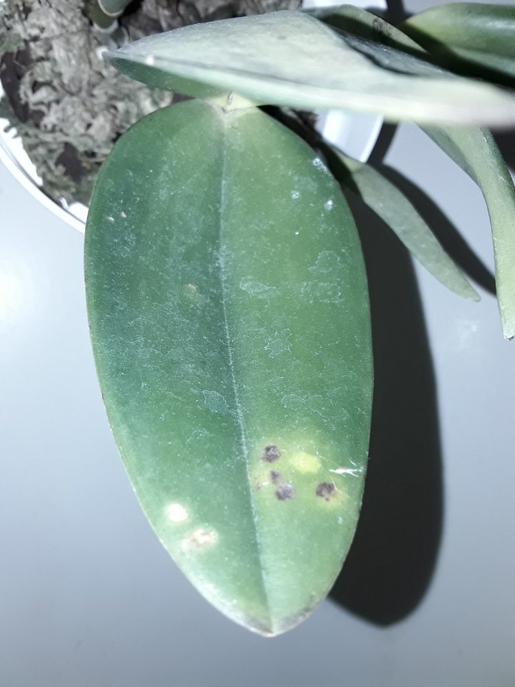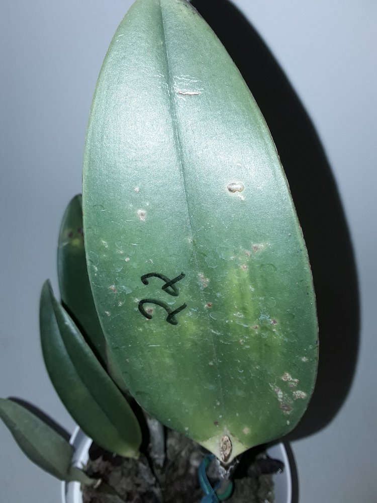 До вчерашнего дня никаких вредителей на этих орхидеях не видела. Перед посадкой всех замачивала полностью в Актаре в сильном растворе (ну и промывала теплым душем до посадки). Прижились какие то лучше, какие то хуже. Одна погибла сразу, лелия Пурпурата (какой то варитет) - выкупала из наличия, оказался отвратительный экземпляр, было бы ее фото, никогда бы такое не купила. Две каттлеи, также выкупленные из наличия без фото, но не дешевые, оказались подрощенными сеянцами, но вроде бы приживаются потихоньку. Также если б сразу написали их размер, никогда бы не взяла (посмотрела на цену, и поэтому решила, что будут близко к взрослым). Одна каттлея - Дуриган Ирис, все это время "болела" - то лист какими то пятнами пойдет, то пожелтеет моментально и отвалится. Осматривала ее пристально многократно за это время - не могла понять, чем болеет. Все остальные тоже проверяла, у них такого нет. Сейчас жара установилась, и "причина" выползла наружу. Это щитовка. Все это время она где то сидела на растении в местах, где ее глазом не увидеть, и только с наступлением жары выползла уже на сами листья и закрепилась на них. Получается, что обработка Актарой после получения, не убила всех, и часть осталась и жила все это время на растении. Следы ее присутсвия я видела, но не связала их со щитовкой. Это локальные желтые пятна на листьях, которые впоследствии покрывались грибком (чернели). Также сразу при получении на тыльной стороне пораженного сейчас листа были старые "проколы", которые по краям зарубцевались и стали жесткими. Также при получении не связала их наличие с работой щитовки. Ну и поскольку обработала очень тщательно Актарой, потеряла бдительность. Вобщем, вчера при поливе обнаружила уже на листе обосновавшуюся там щитовку. На других каттлеях и моих, и тогда полученных вместе с этой, никого нет. Поэтому настоятельно рекомендую проверить каттлеи из той поставки. И если будут обнаружены вторичные признаки ее присутствия (выше описала и будут на фото ниже) - проверить такие каттели с особой тщательностью.