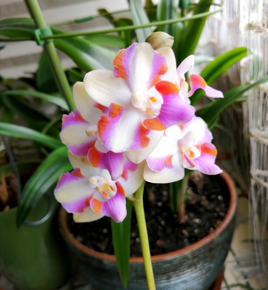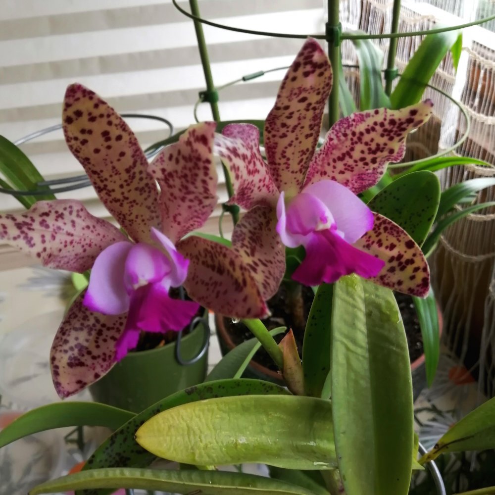 Распустилась изумрудная Королева (Green Emerald “Orchid Queen”), аромаааатная. Этот рост и листву красивую выдал, крапчатую, наверное жара повлияла. Одно фото со странного ракурса-показать губу сверху. 😇 И почти полный роспуск Pulcherrima 4N-никак не нарадуюсь на окраску и плотность посадки цветков. И это первое цветение! Цветки 4,5-5см, не пахнут.