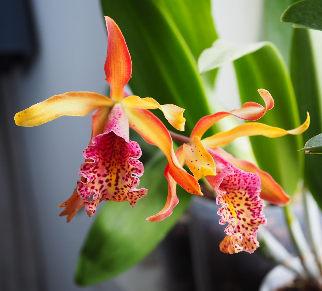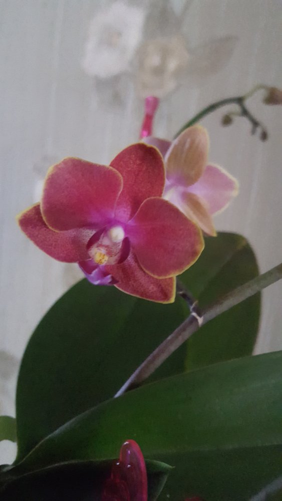 На одном цветоносе у цветов разная "губа"!!! У одного оранжево- красная, у других- жёлтая!!!...