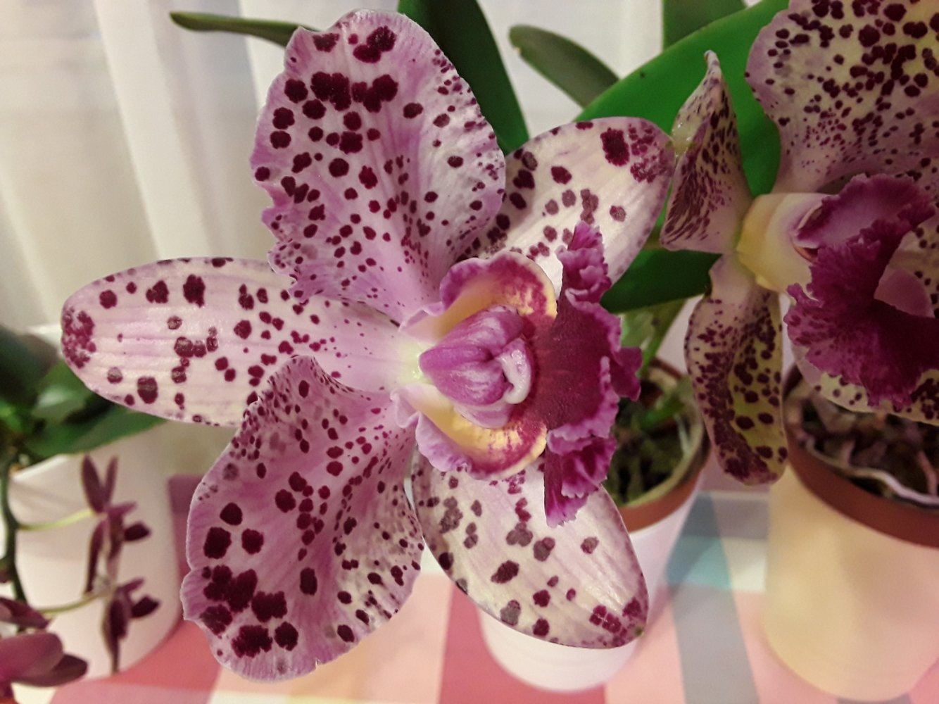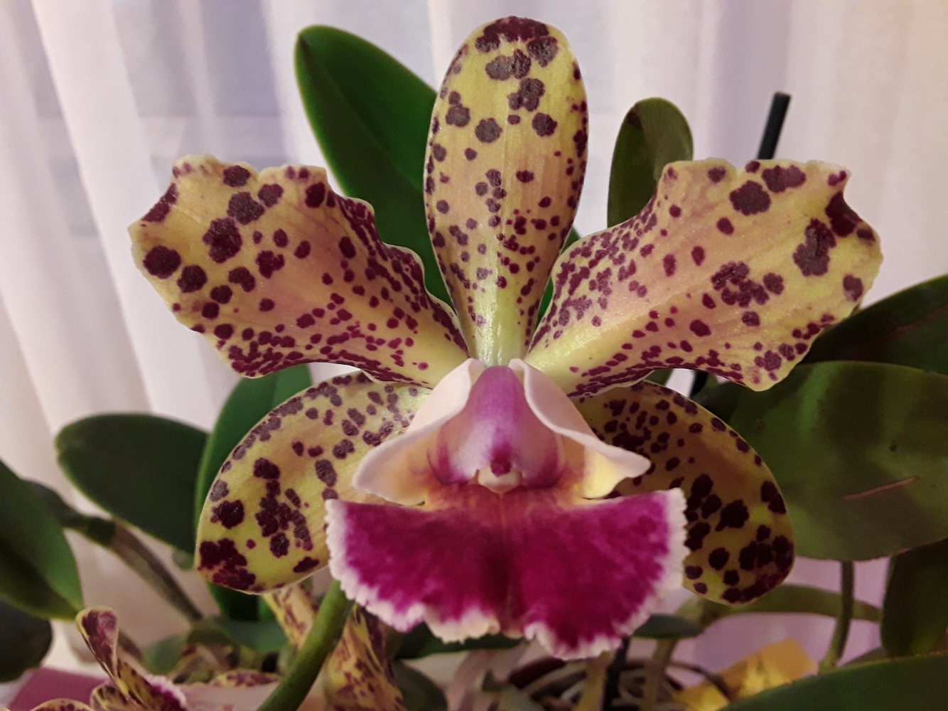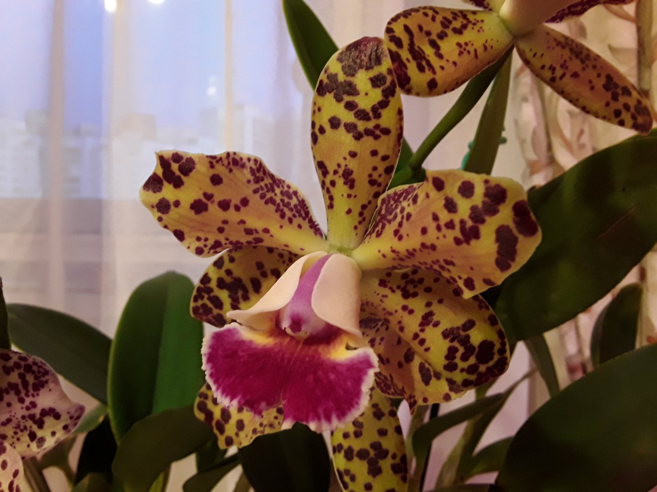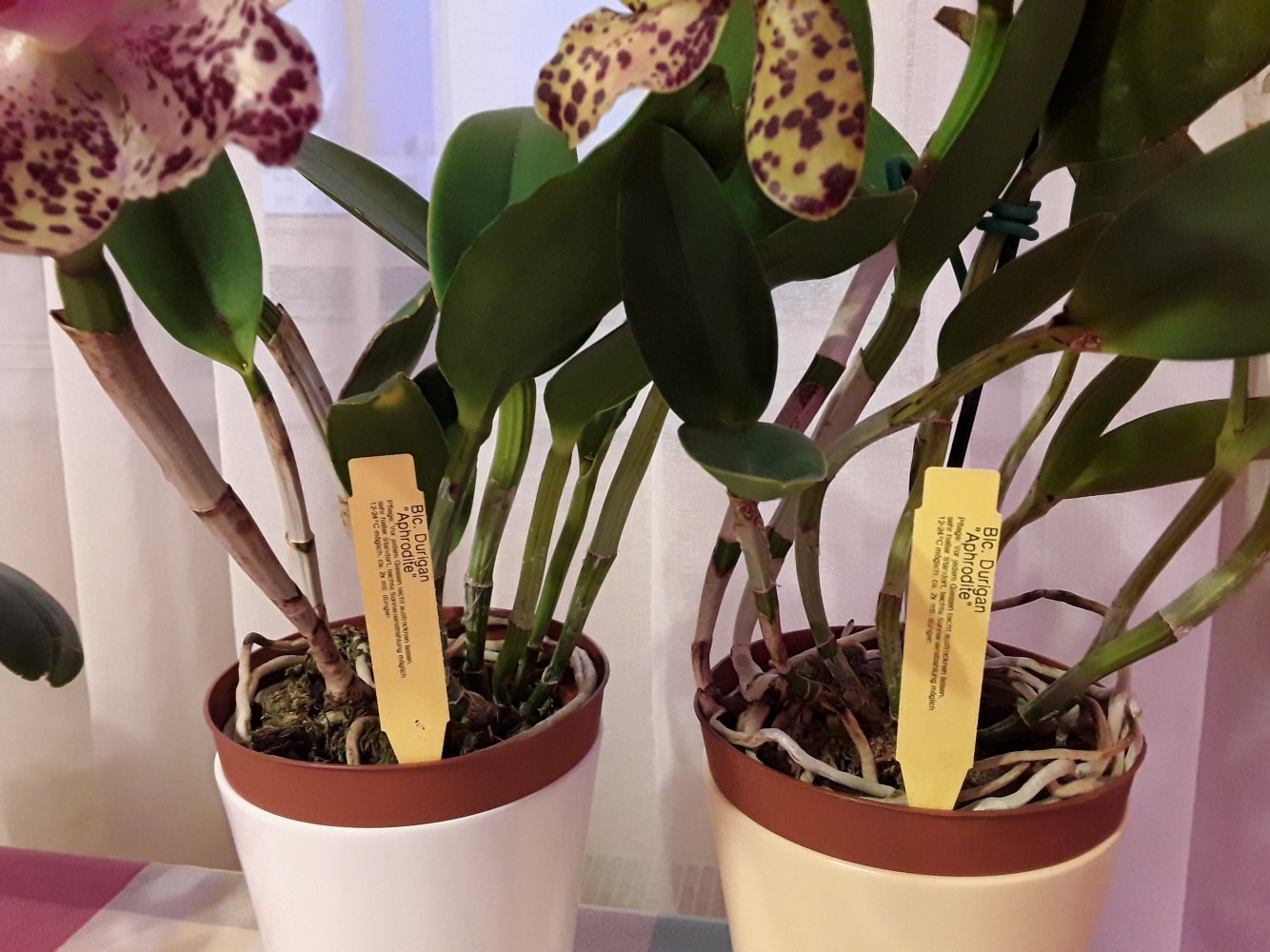 Распустились каттлеи Дуриган Афродита от Люке. Обе из одной партии, получены были вместе год назад. Заказала сразу две, т.к. в первый раз ее у Люке расхватали настолько быстро, что не успела купить. Поэтому когда она снова у него появилась, сразу две схватила, на случай, если одна не выживет при адаптации. Одна сразу была повыше, другая пониже. Обе прижились быстро и хорошо, росли прямо "ноздря в ноздрю". Зацвели с третьего выросшего уже у меня нового роста. Не знаю, насколько это Афродита, Дуриган - да...Но нравятся обе, даже очень рада, что они разные. С первыми лучами солнца начинают сильно ароматить, на все помещение. Аромат гиацинтов. Примерно к обеду стихают. Цветы крупные, восковые.