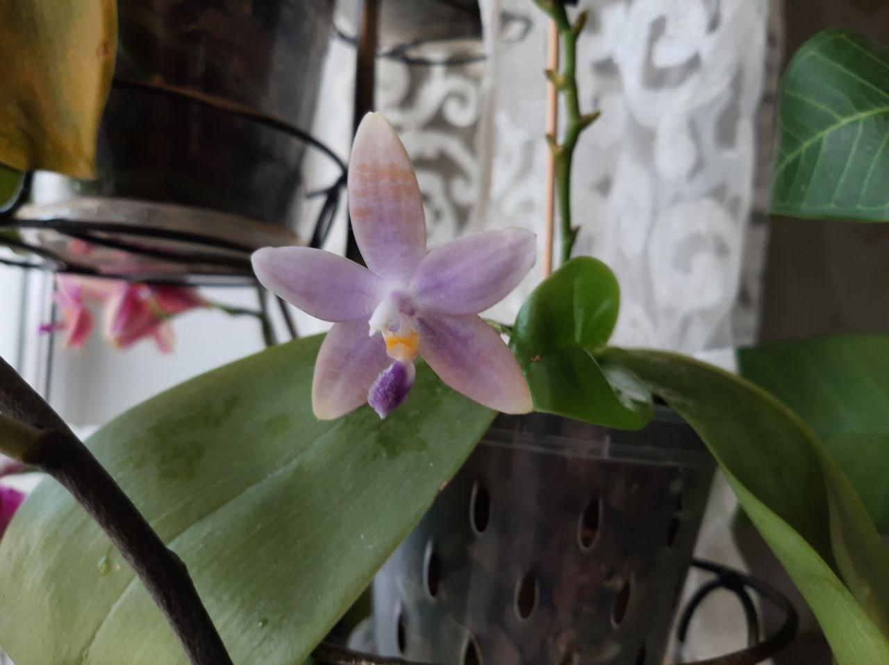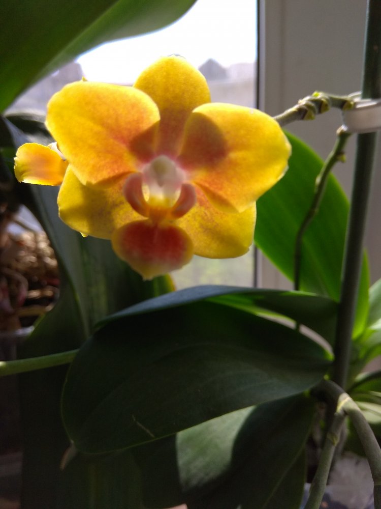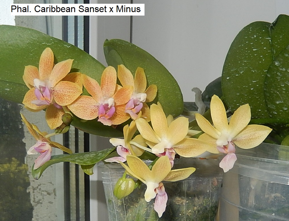 Цветут уже давно со срезанных при отправке цветоносов Phal. Caribbean Sanset х Minus, неплохие, взяла два и цветут по разному, один чуть с рыжинкой и больше крапушек, второй жёлтенький и крапушек меньше, стоят рядом, пока не пересаживала. Но хотела/мечтала именно о таком, что погиб (третье фото)