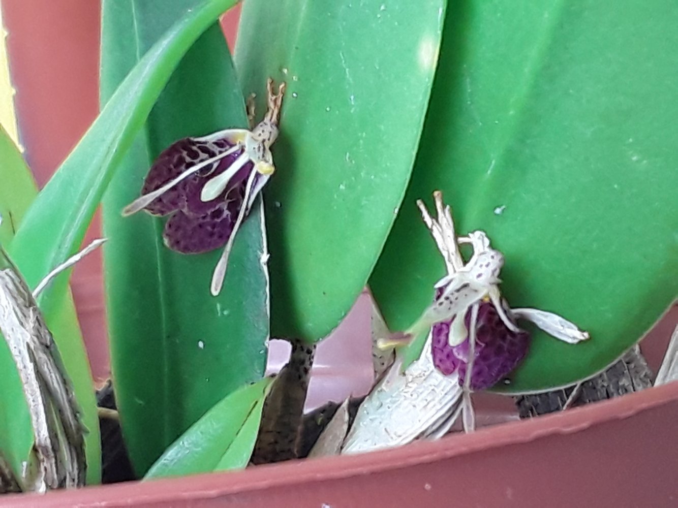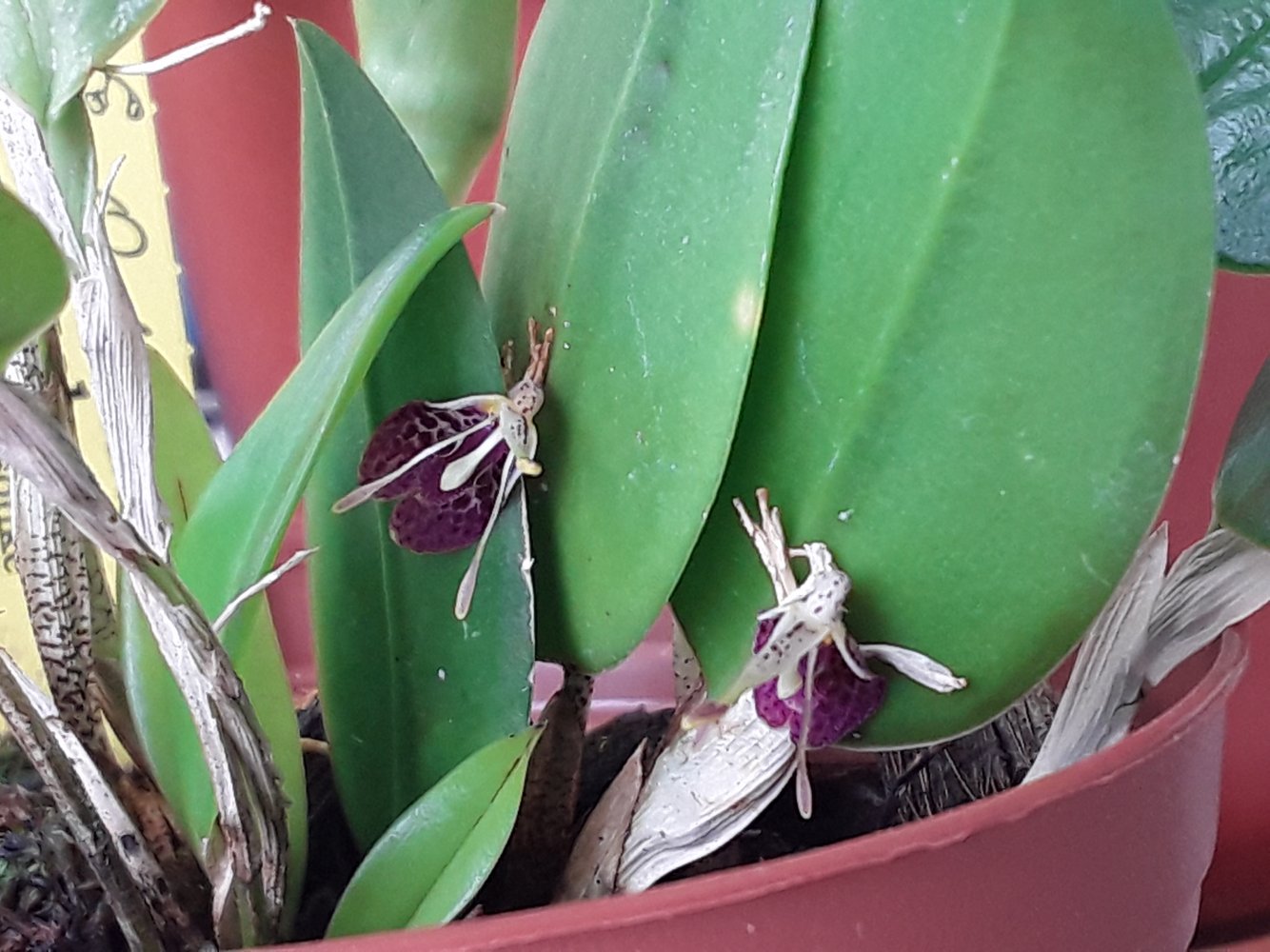 Забыла показать еще одну малюську от Люке, рестрепию вот эту https://passiflora.ru/product_info.php/products_id/cPath/2956_2959/products_id/362303 Отзыв в каталоге, кстати, тоже мой)). Цвела уже пару раз, но цветы обнаруживала при поливе уже отцветшими и сухими. Цветение всего сутки- двое макисмум. Удалось хоть как то сфотографировать, пока застала цветы раскрытыми. Очень маленькие, всего 0,5 см. Поэтому не судите за качество фото. Но они в точности, как на фото в каталоге. Приходит полностью взрослое, укорененное растение размера цветения. Кому хочется попробовать, но боится - просто не трогать его после получения и растить как есть, единтсвенное его требование - полив без просушек субстрата и тень (можно яркая), солнце не переносит ни в каком виде.