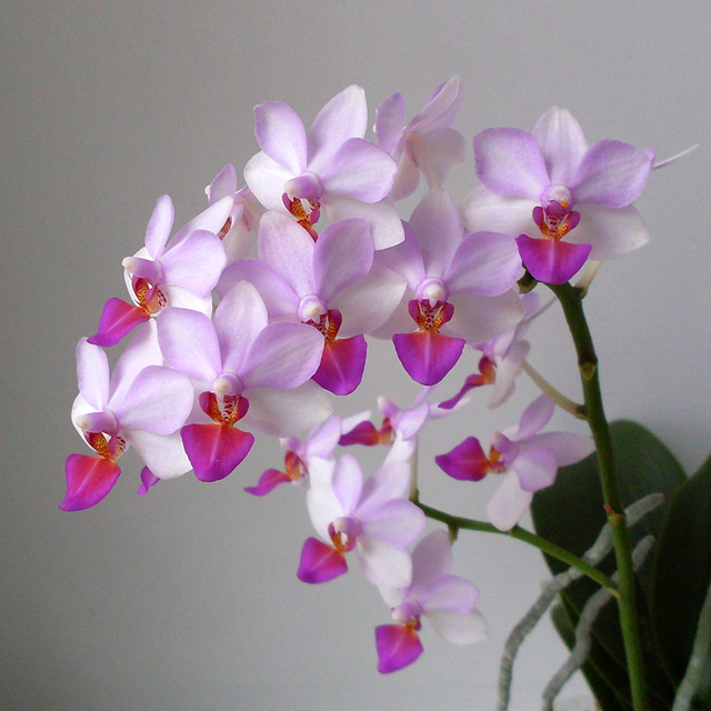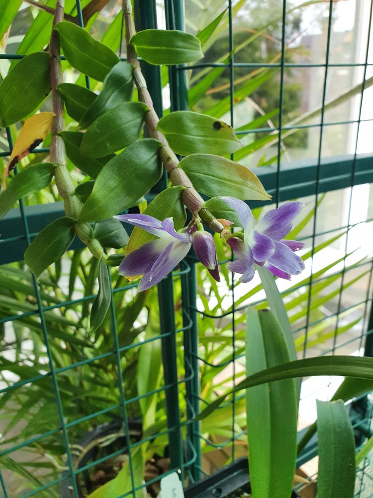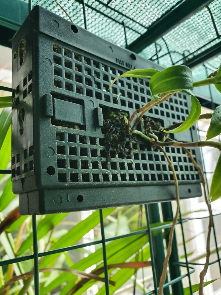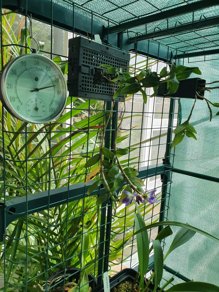 Очередной Dendrobium victoria-reginae расцвел. Растёт на пластиковом блоке со сфагнумом внутри. Покупался как маленький сеянец около года тому назад. Такая посадка наиболее выгодно подчёркивает особенности роста растения, интересно наблюдать как растут ветви сначала вверх а потом постепенно опускаются вниз под собственной тяжестью. Содержится почти круглый год на балконе с довольно сильным применением, кроме самых жарких месяцев.