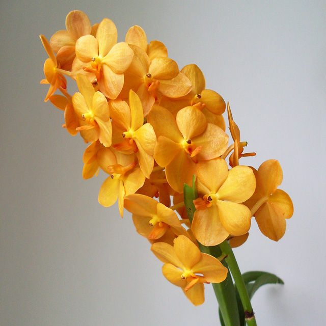 Яркая солнечная Vanda Natcha Magic Orange снова процвела. Цветение длилось больше месяца. Ну очень рад, что это растение стало моей первой вандой! Послушная неутомимая цветунья с ровными рядами листьев, аккуратным обильно украшенным цветоносом и голой корневой в стеклянной вазе выглядит очень эффектно и невероятно красиво!