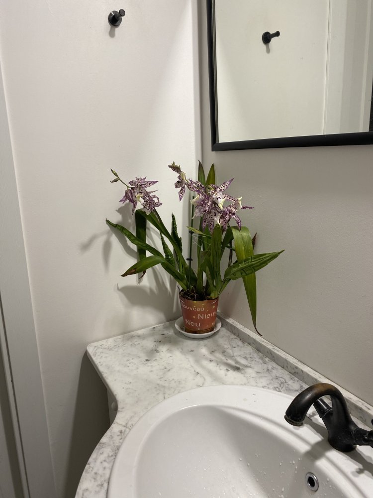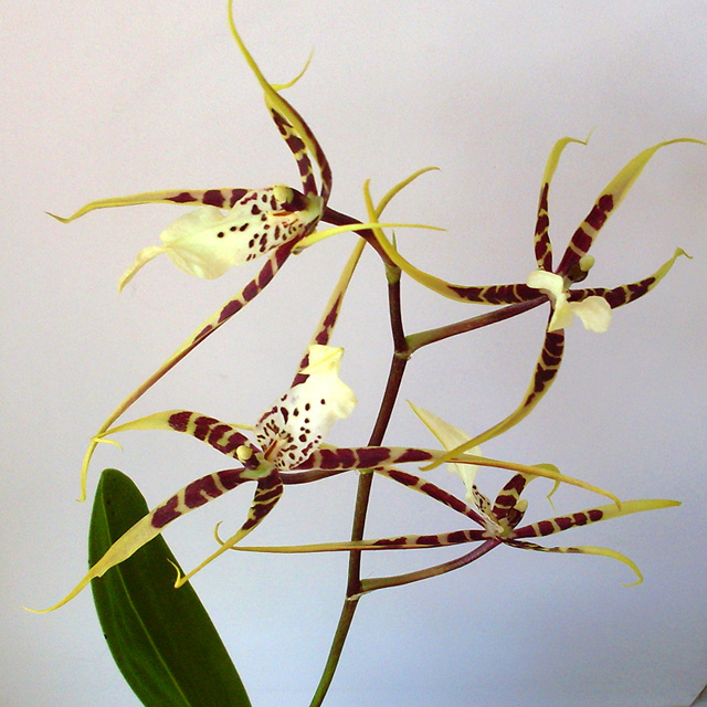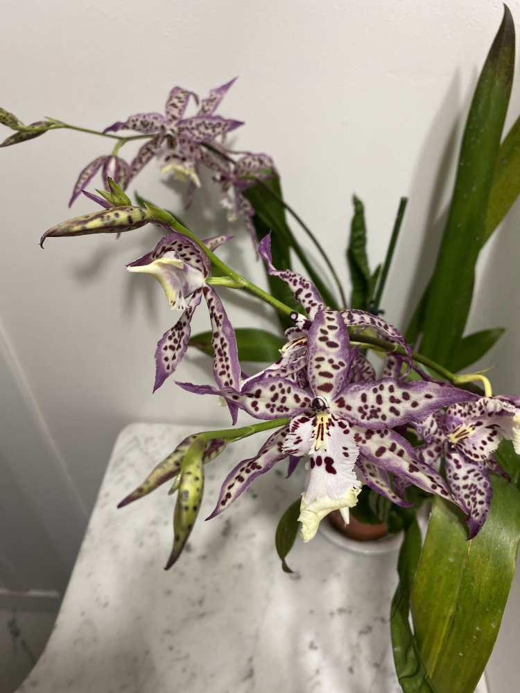 Brassidium Spider Star 'Toscana' растёт лесенкой. Каждая следующая псевдобульба шагает вверх на полтора-два сантиметра, зависает в воздухе, плохо отращивает корни и становится мельче предыдущих. Поэтому в марте растение было поделено и пересажено. Делёнки из передних и задних бульб посадил в один горшок с желанием получить растение, которое будет цвести чаще и/или обильнее.