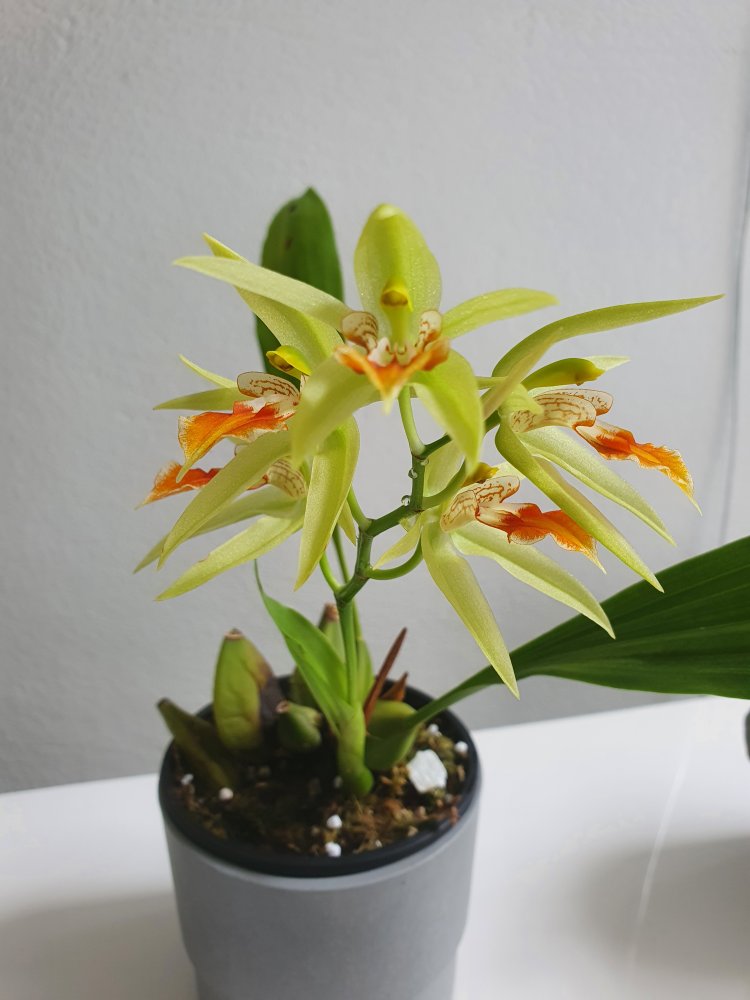 Coelogyne salvaneraniana в полном роспуске. Итого 5 цветков по 7 см каждый.