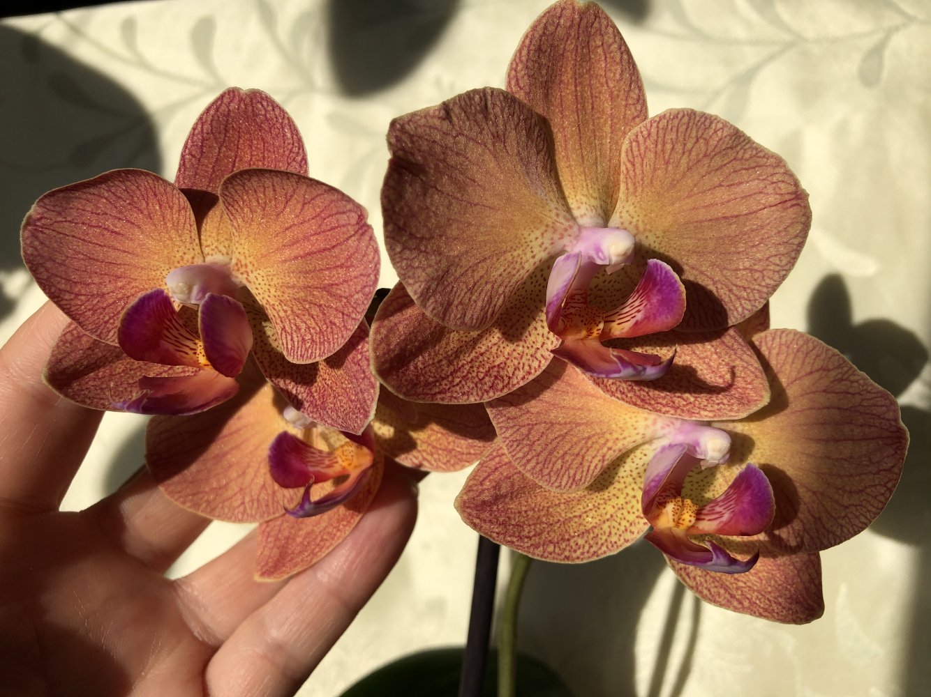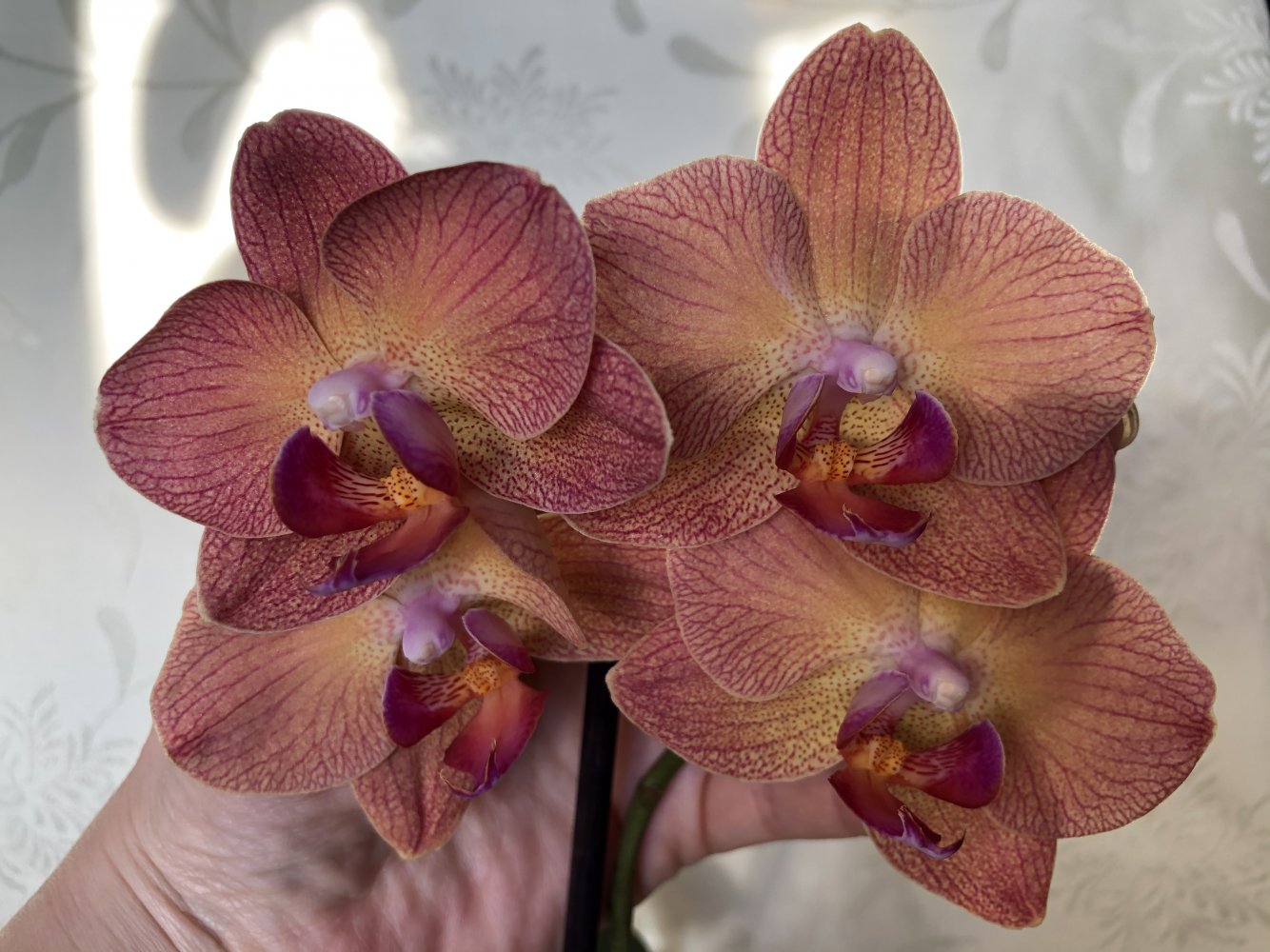 Про единичные орхидеи - у подруги тоже Клубично-молочный Коктейль цветёт. По возрасту - постарше моего. И цветение обильнее.