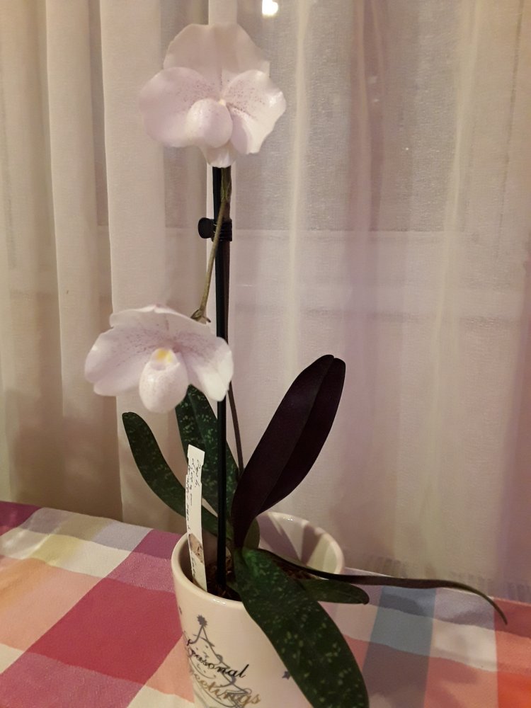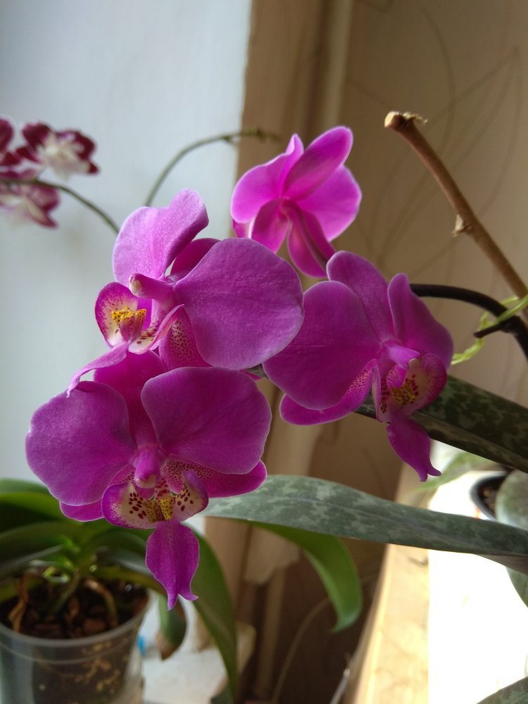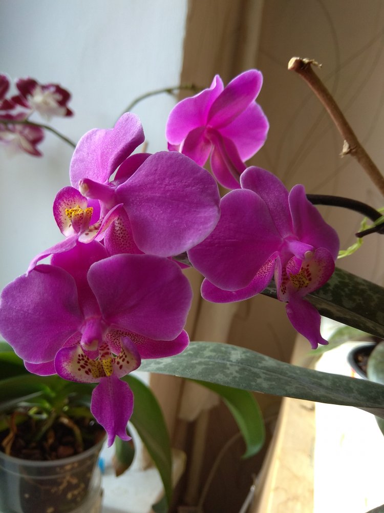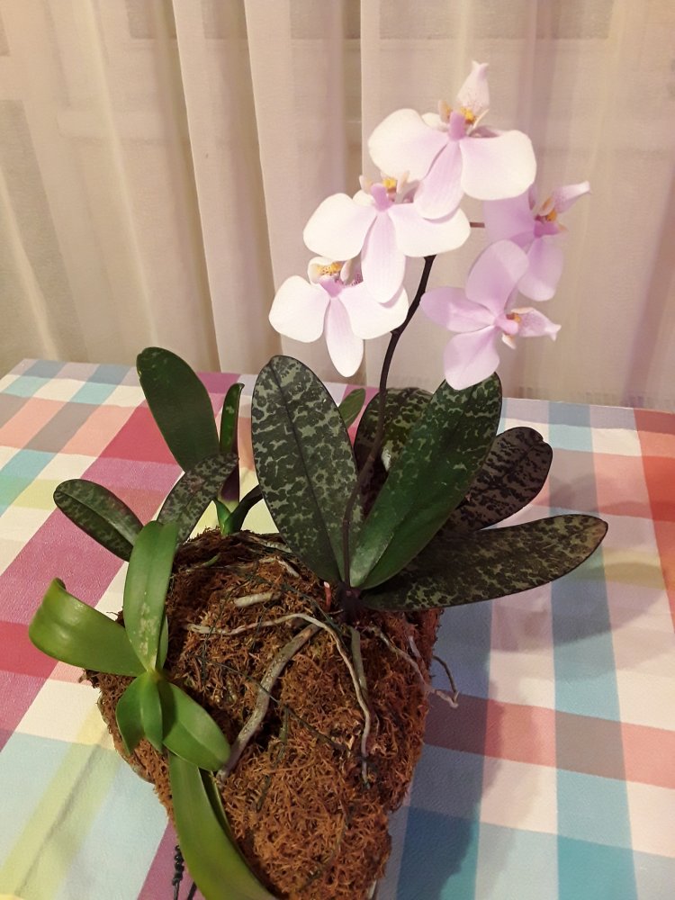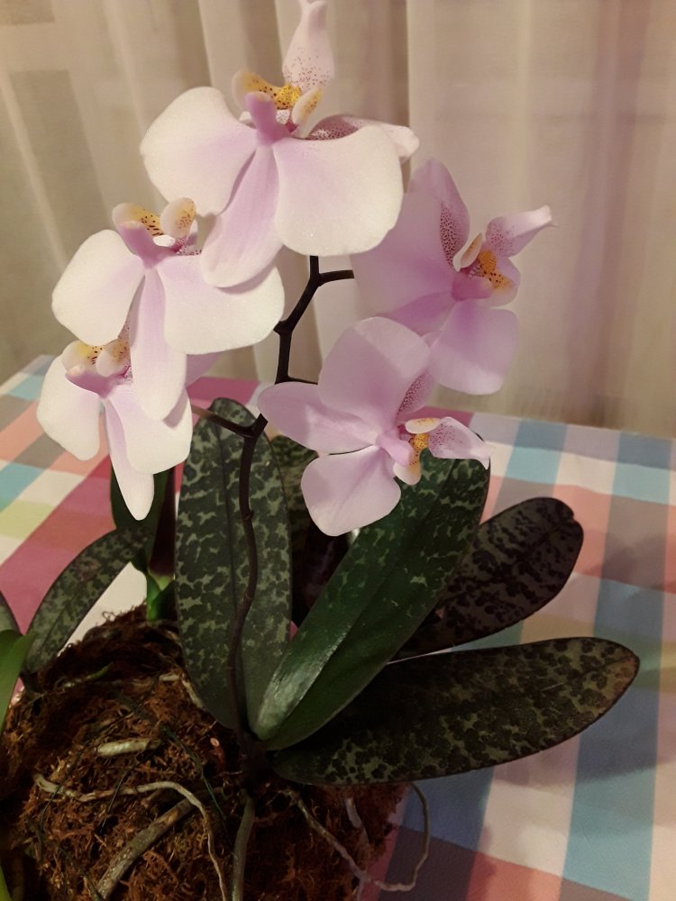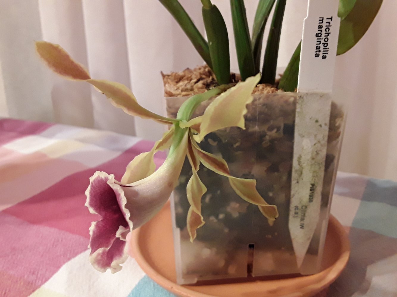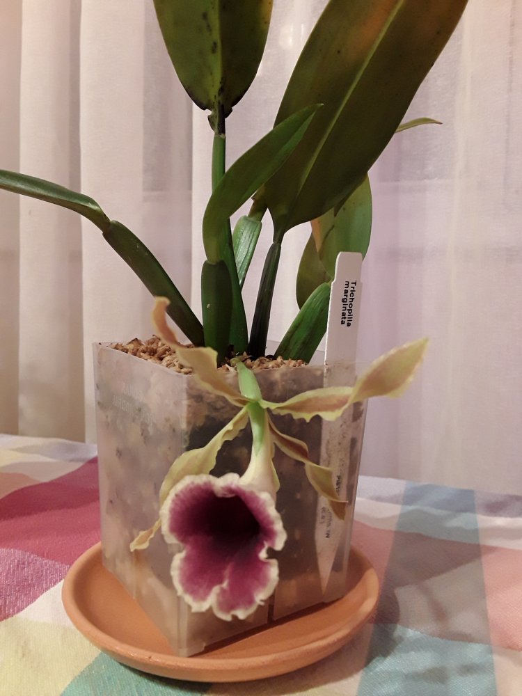 Trichopilia marginata, Ecuagenera. Второе домашнее цветение, получена больше 2 лет назад. Хотя на сайте поставщика цветение такое же, больше похожа на гибрид с tortilis. Растение достаточно миниатюрное, простое для домашнего выращивания. Адаптировалась после получения быстро и без особых проблем. Условия - теплое содержание, высокая влажность воздуха приветствуется, но проживет и без нее, частый полив и отличное освещение. В летний период растет на улице в яркой тени. Цветок крупный, около 7 см. Ароматная, очень напоминает аромат родстенницы - suavis, но его едва слышно вблизи цветка.