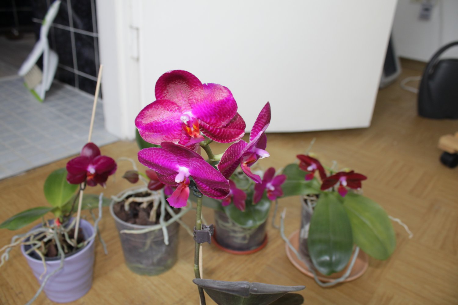 Тут все кучкой для сравненияи размеров и цвета, слева направо Phal. Sogo Grape, Phal. Fushengs World, Phal. Zheng Min Quetzalcoatlus (как правильно пишется, не знаю) и Phal. Mituo Sun x P. LD’s Bear Queen (цветочки смотрят вниз, поэтому сфотографировать толком трудно).