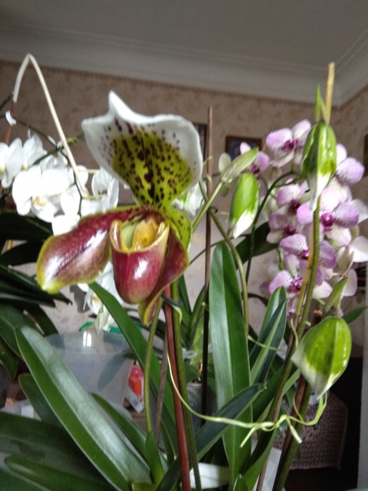 Полный роспуск первого цветочка лже Paph. Rosy Dawn Hibride. Очень хотела белый фарфоровый цветок!!! И у Карге, к сожалению, бывают пересорты... Но цветок мне все- таки нравится! Пока это первый паф с домашним цветением!