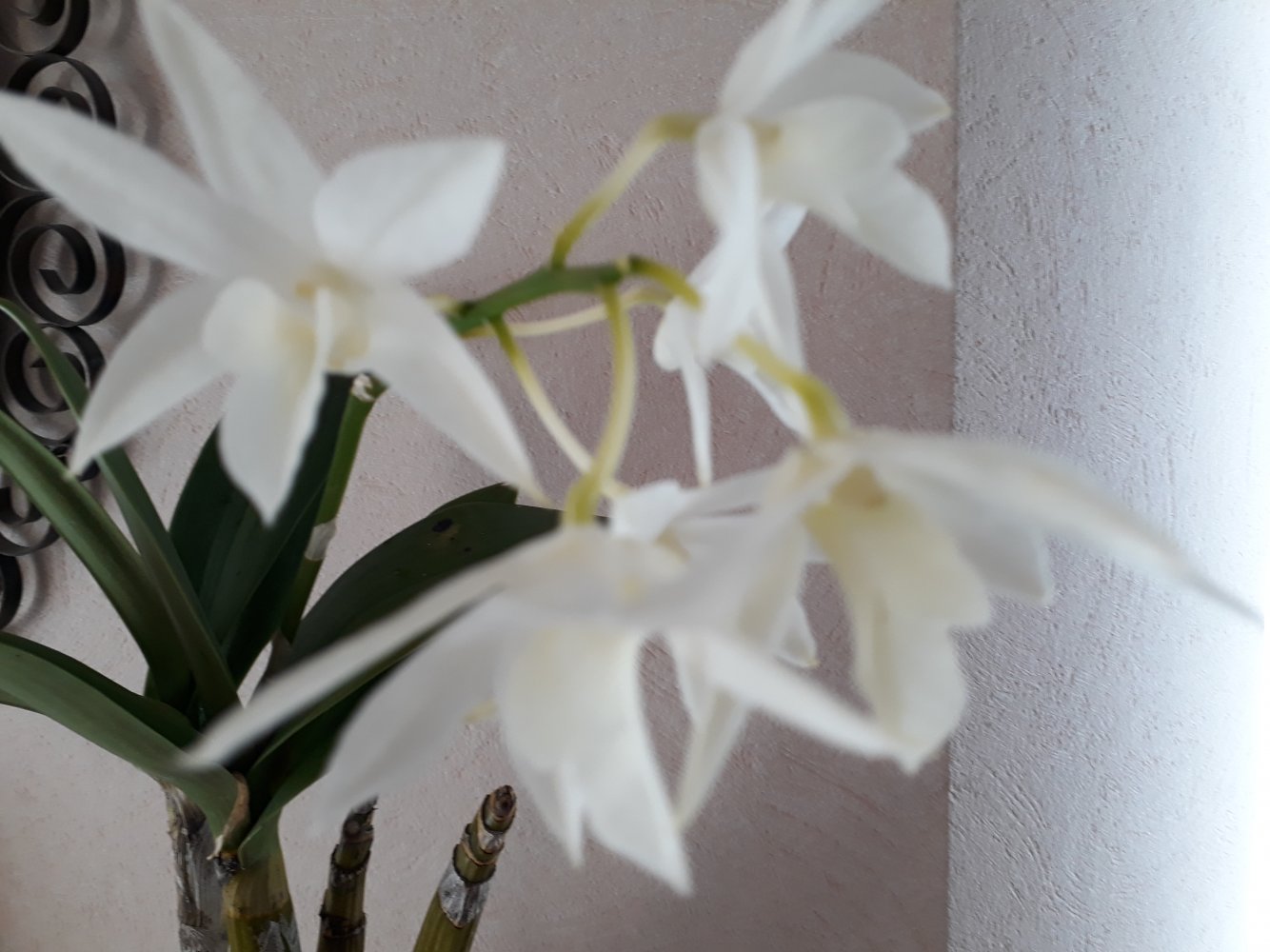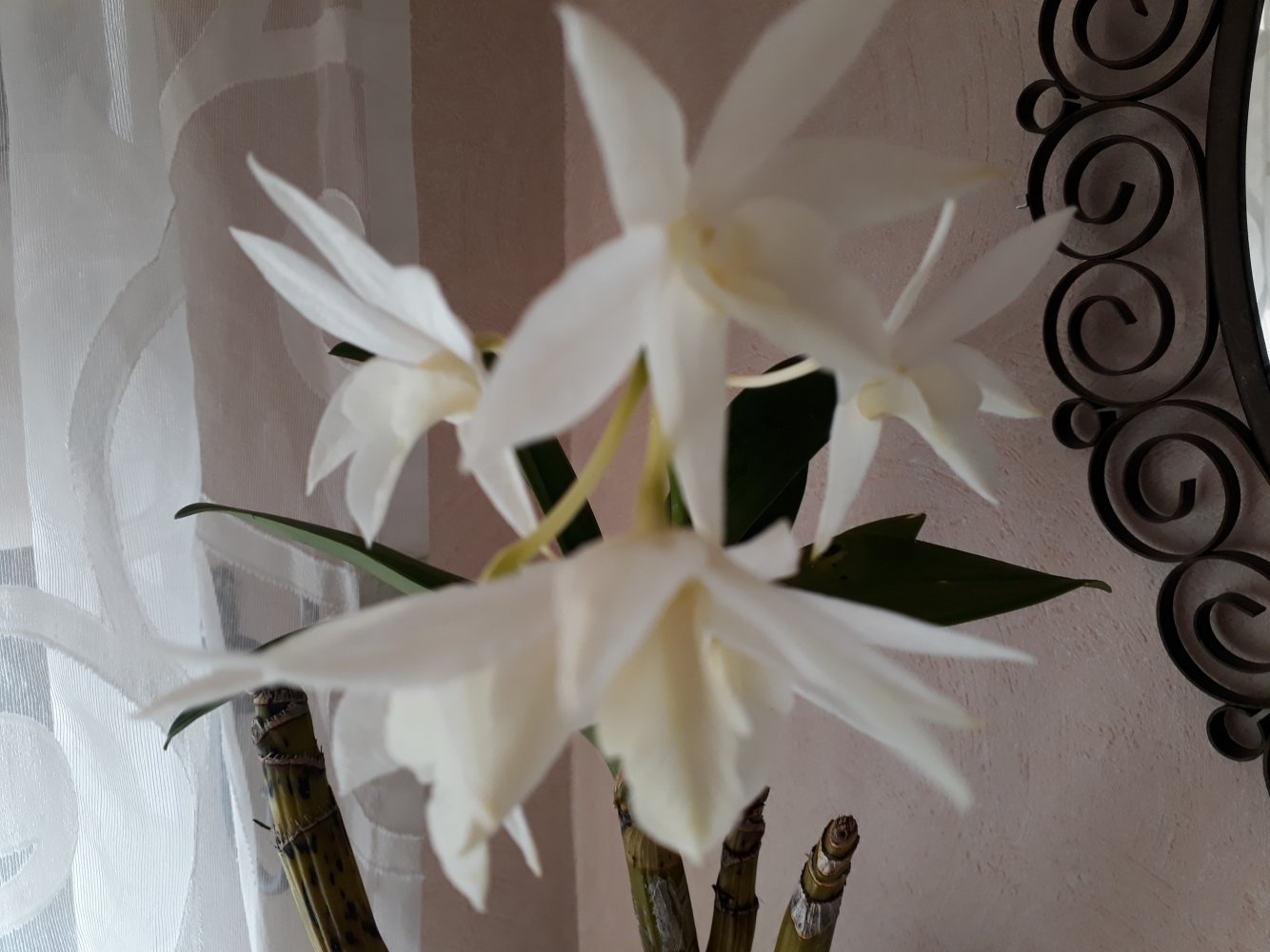 Расцвел Den. White Grace 'Sato' BM/JOGA (Den. Fiftieth State x Den. speciosum). Первое домашнее цветение, не разочаровал! Крупная кисть немелких белоснежных и красивой формы цветов (6,5 см) . 20210317_145207.jpg20210317_145225.jpgАромата нет.