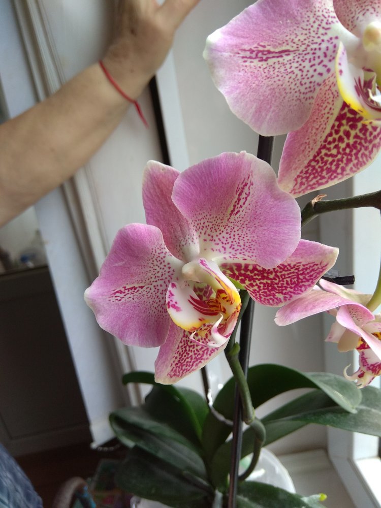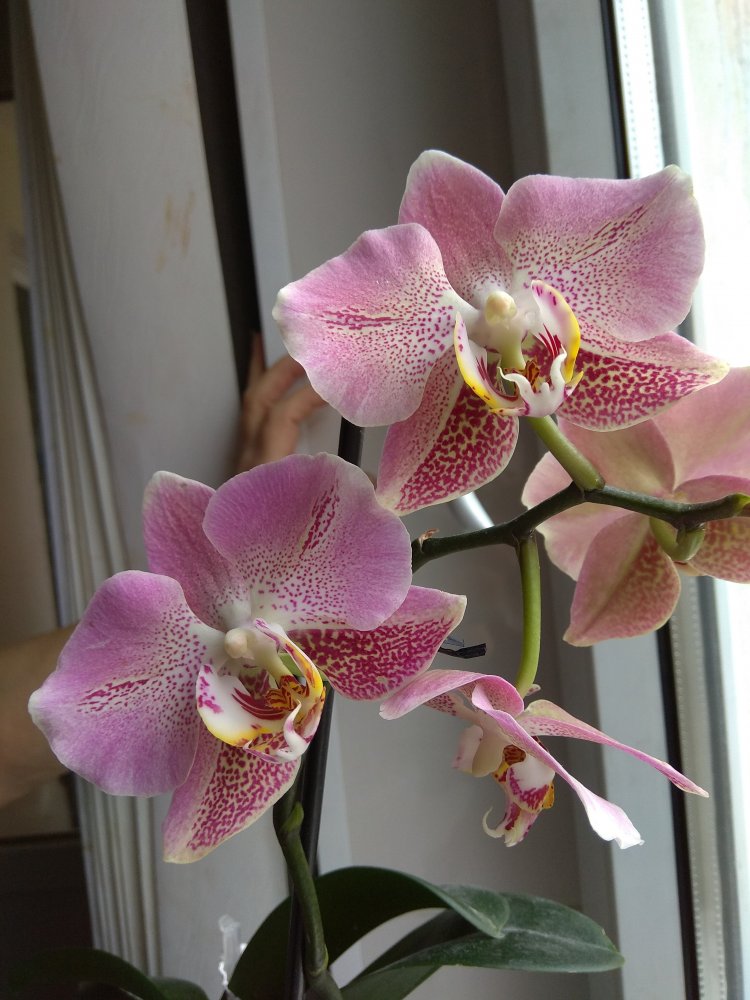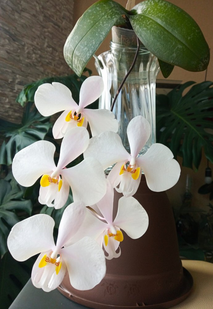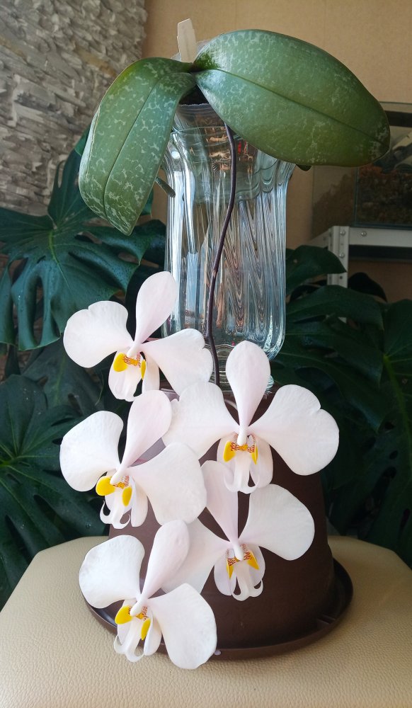 А поскольку подруга так же, как и я, покупала растение с рук - про возраст фаленопсиса, цветшего впервые (сужу по отсутствию старых цветоносов), сказать ничего не могу.