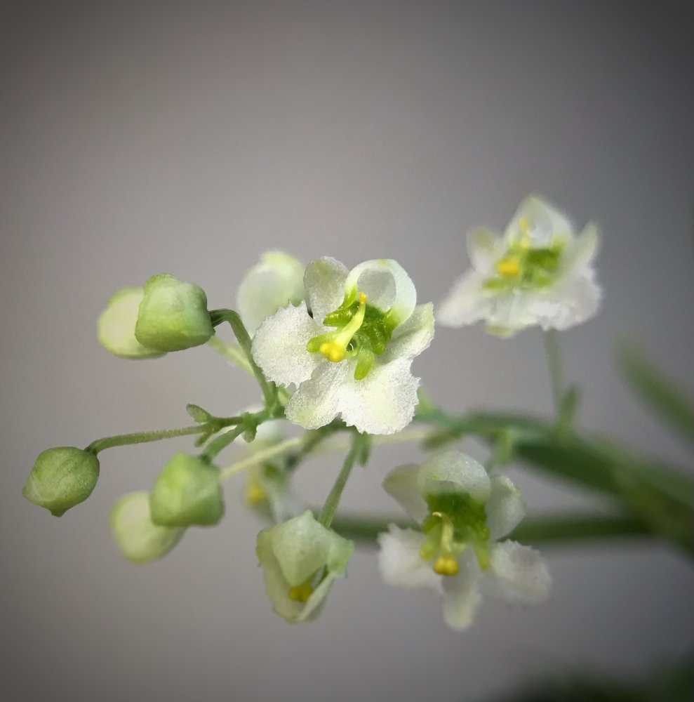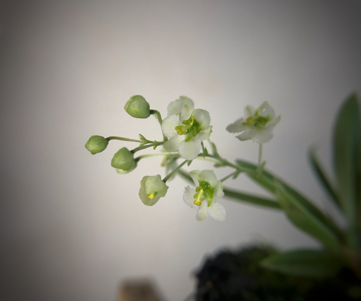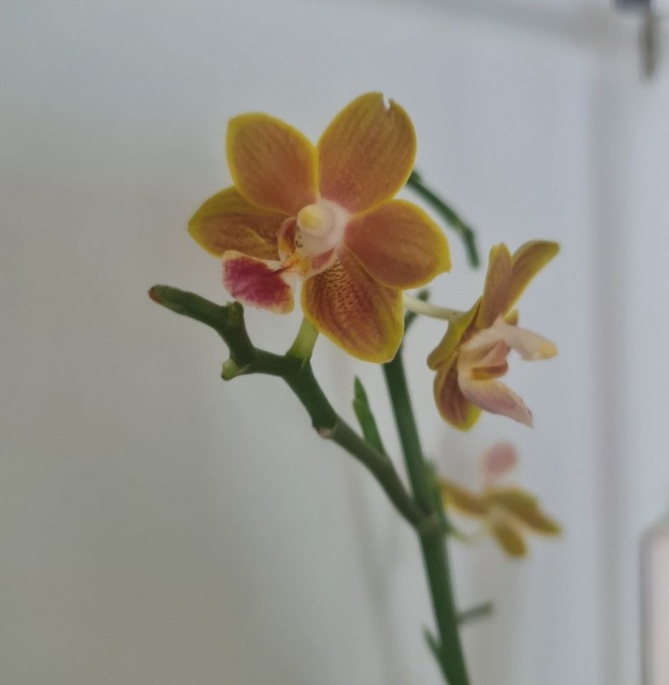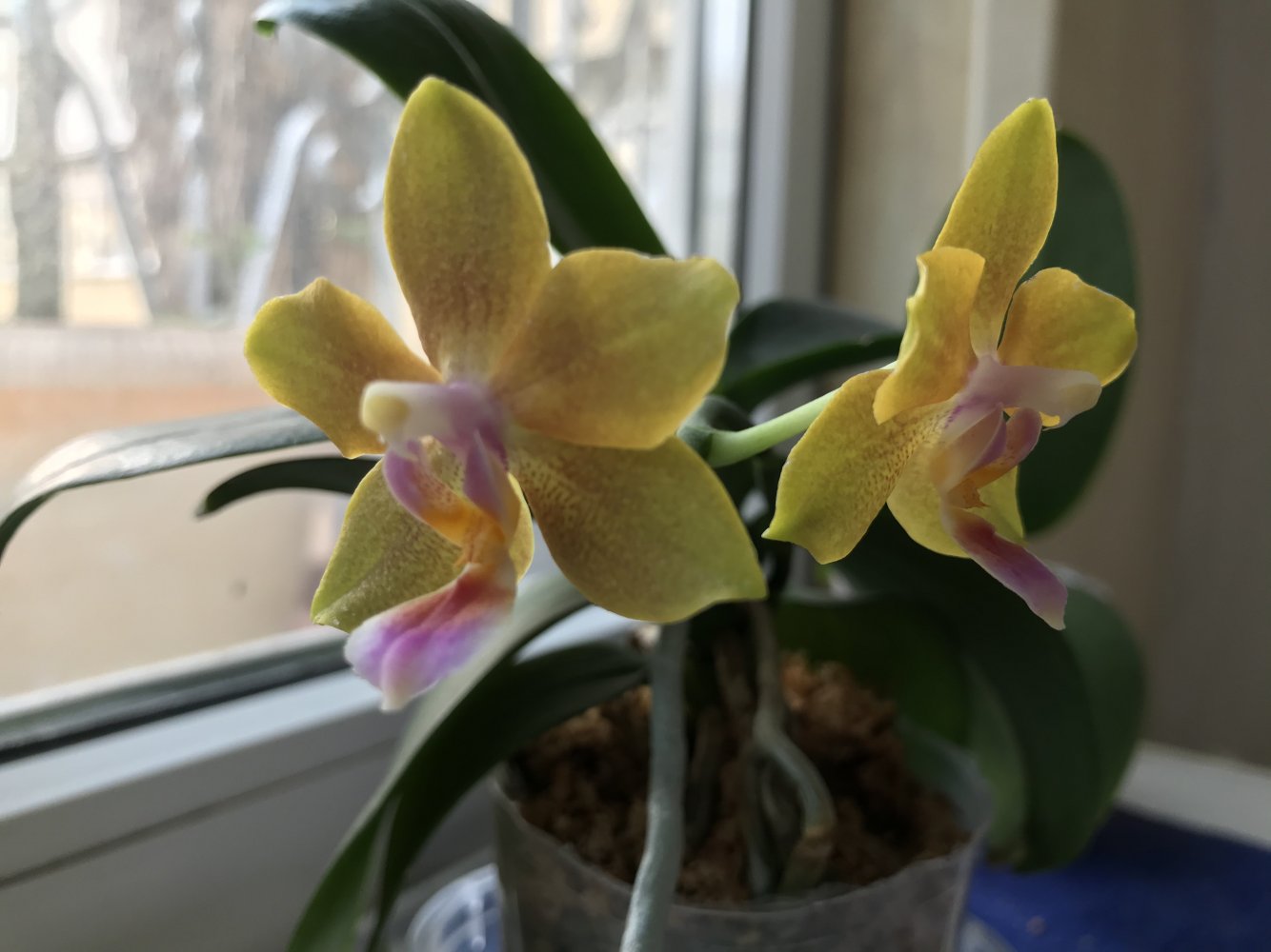 Распустились три цветка на полученном из Yaphon KS Balm x Yaphon Perfume. Цветок 3,5 см, на зеленом фоне коричневые точки и пятна, слабый запах специй и иногда проскальзывает сладкая нота. Это под лампами. Из трёх цветоносов один засушил, на остальных наращивает новые почки. Жаль только, что была чернота на стволе, так что пришлось удалить два нижних листа и замазать фундазолом. Может, и не стоило листья убирать, и я напрасно паниковала - не знаю.