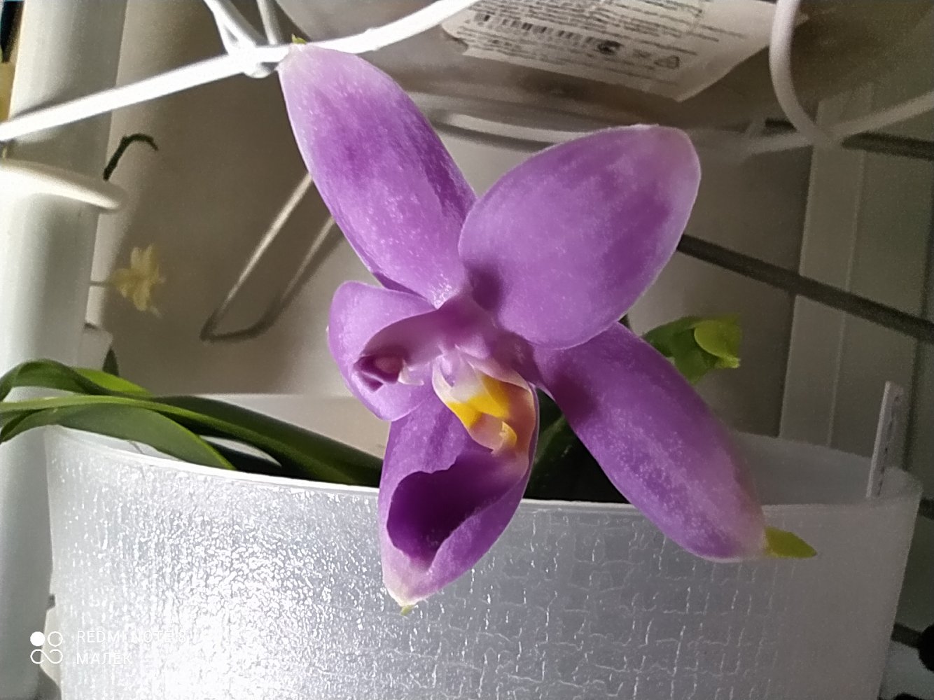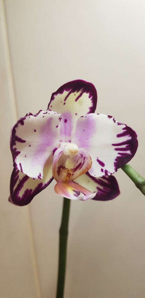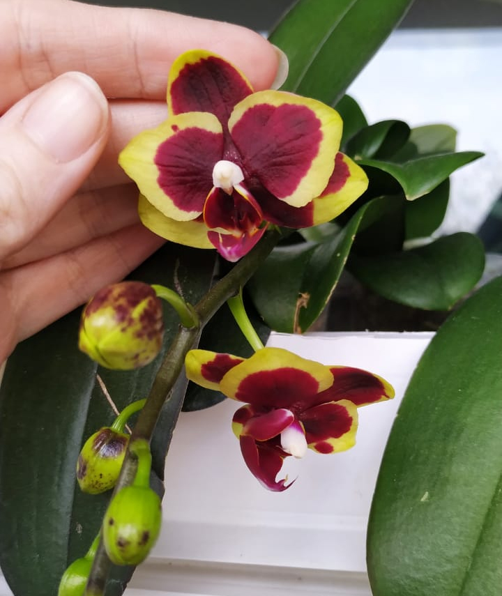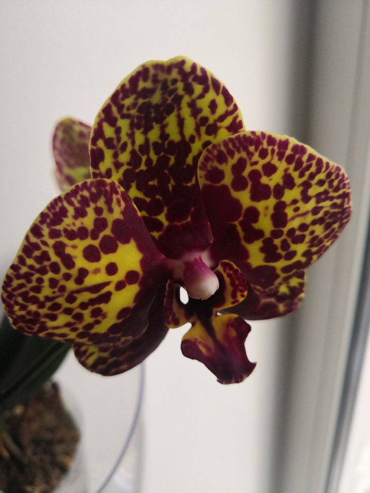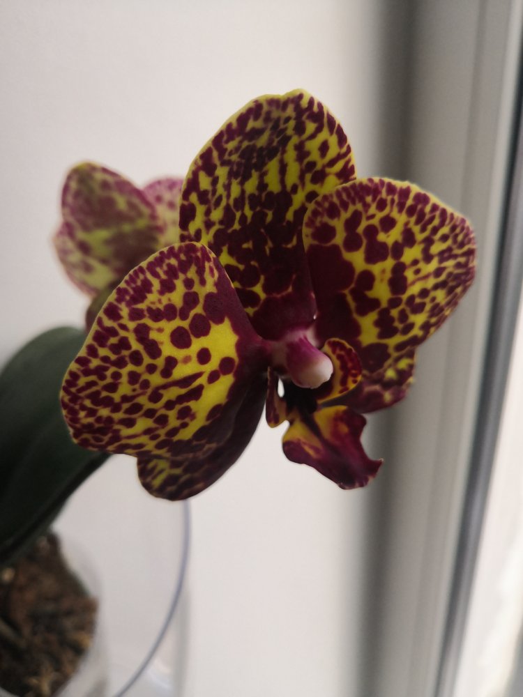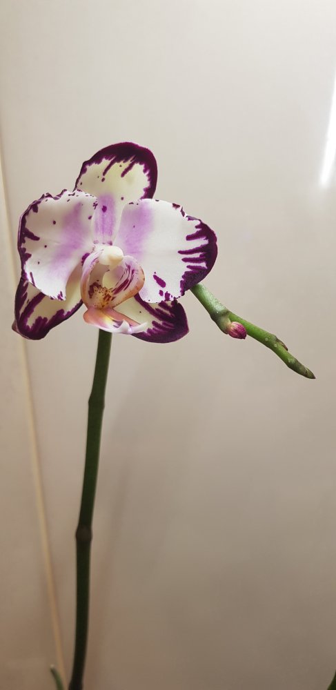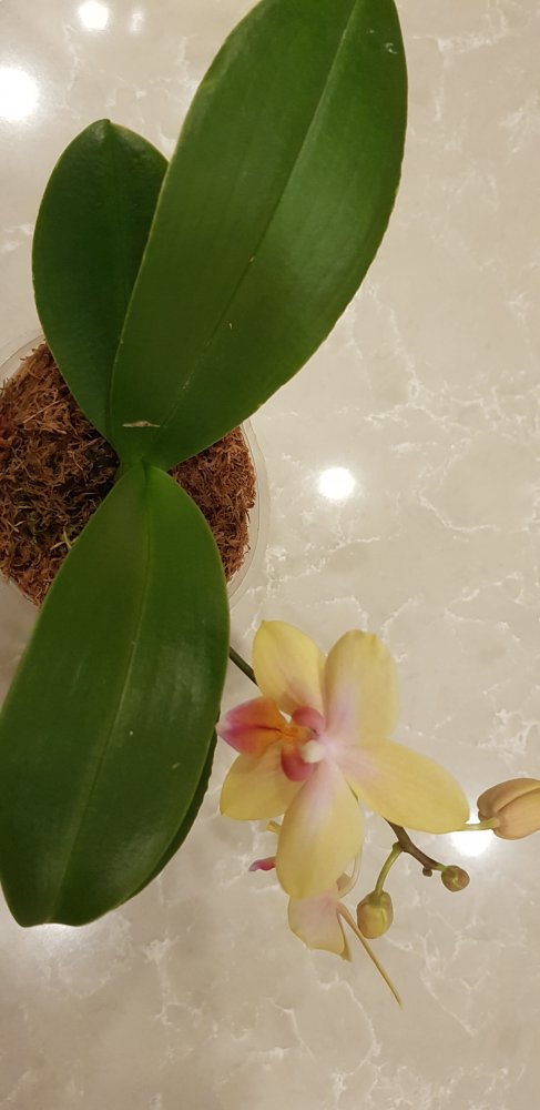 Получен 2 апреля 21г с цветоносом. Первое цветение. Нижний цветок забрал питание у 2х других бутонов, они отпали. Это при влажности 60%. Новые корни тоже наросли в горшке.