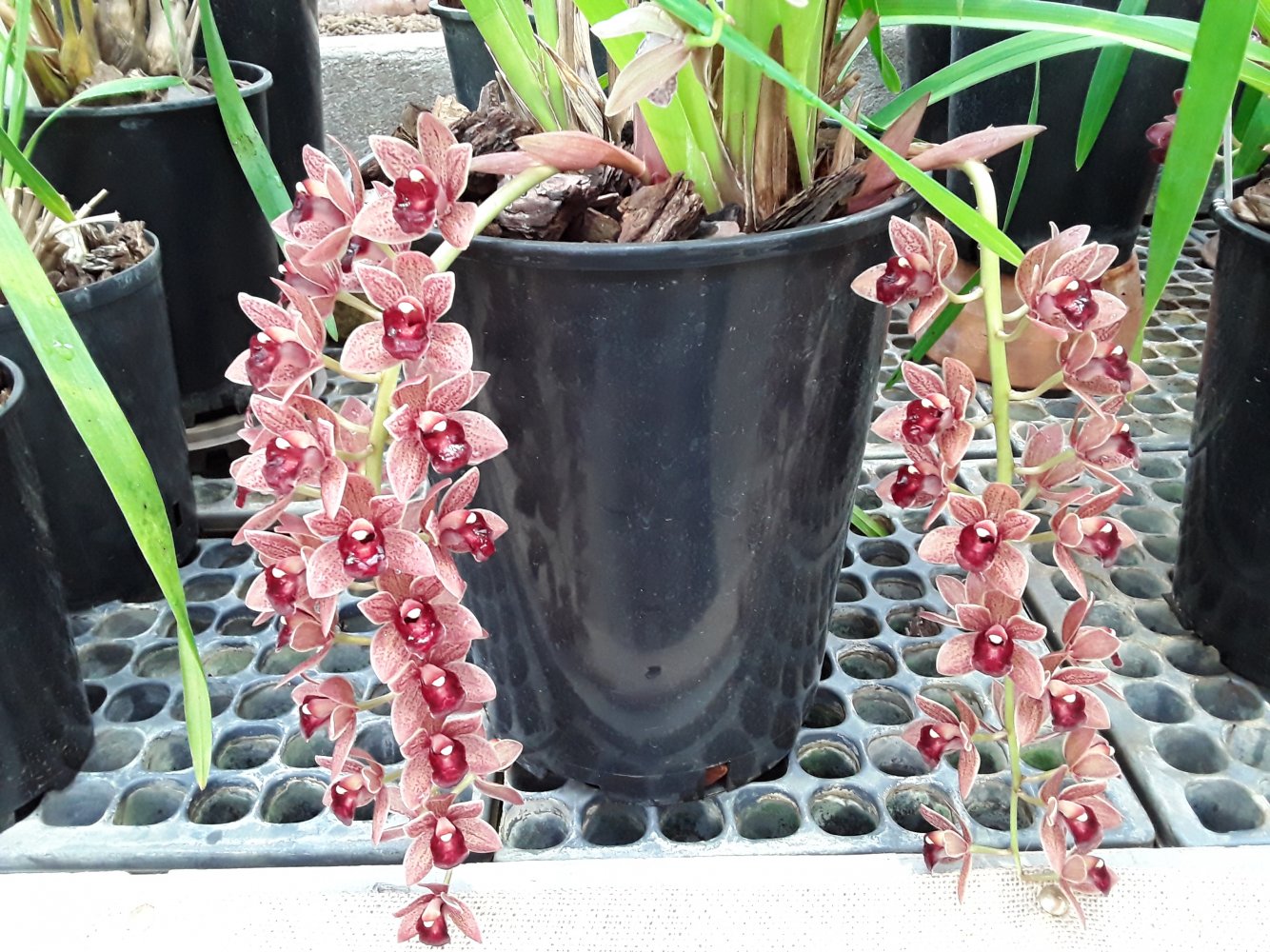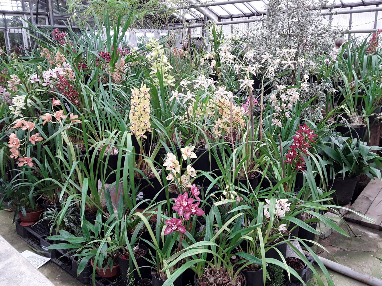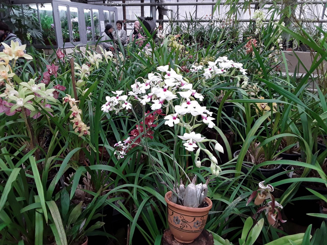 В основном представлены цветущие цимбидиумы, небольшое колличество пафиопедилюмов и фрагмипедиумов, остальные орхиедеи в единичных экзеплярах.