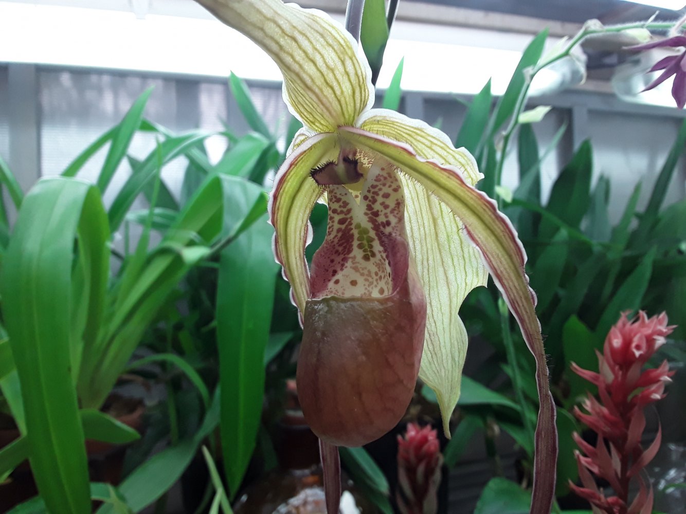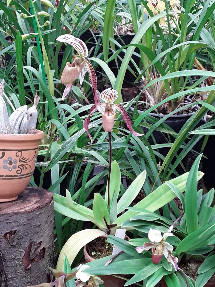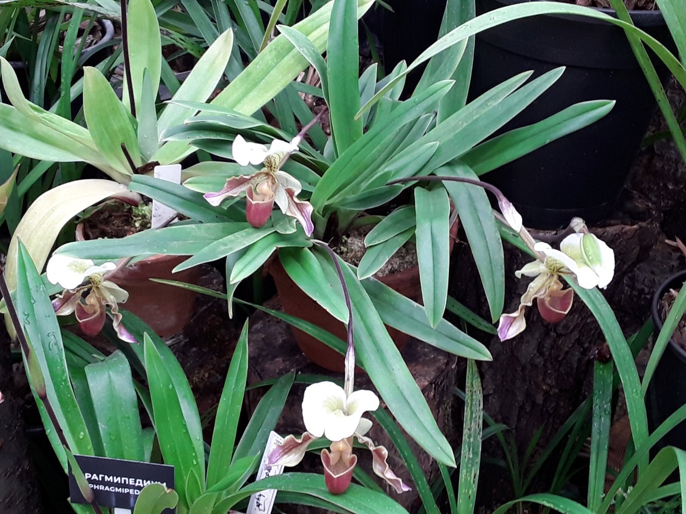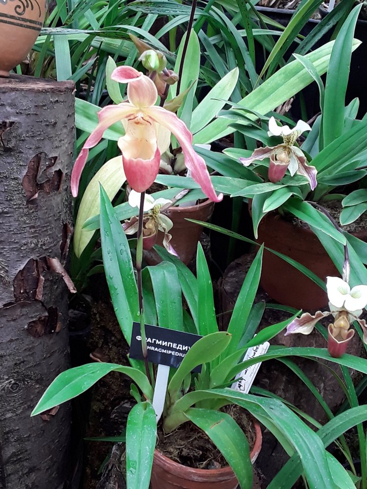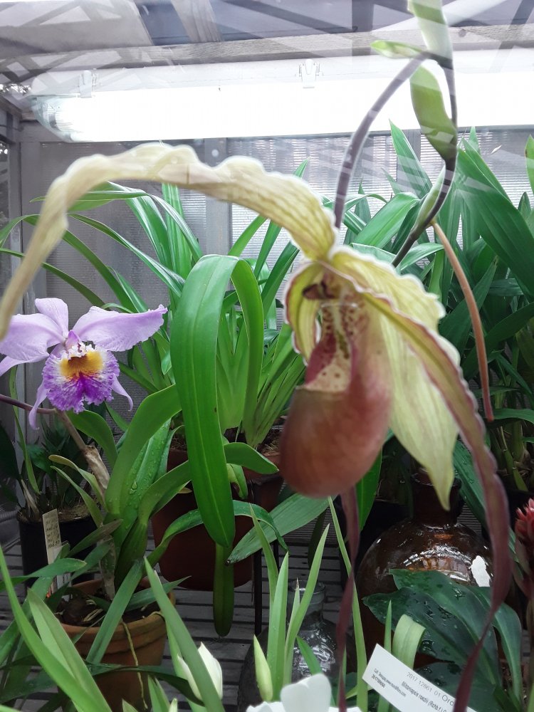 Также было представлено несколько цветущих фрагмипедиумов, но все были подписаны просто hybr. Эта группа орхидей поразила изумительным состоянием самих растений, что для ботсадов большая редкость. Очень крупные экземпляры, с идеально здоровыми листьями. Посажены все в огромные глиняные горшки в смесь обычной лесной сосновой коры и лесного мха. С учетом, что поливаются там все орхидеи водопроводной водой из старейшего (по состоянию) водопровода, а везде пишут, что это категорически делать нельзя, лично у меня эти два факта вызвали удивление.