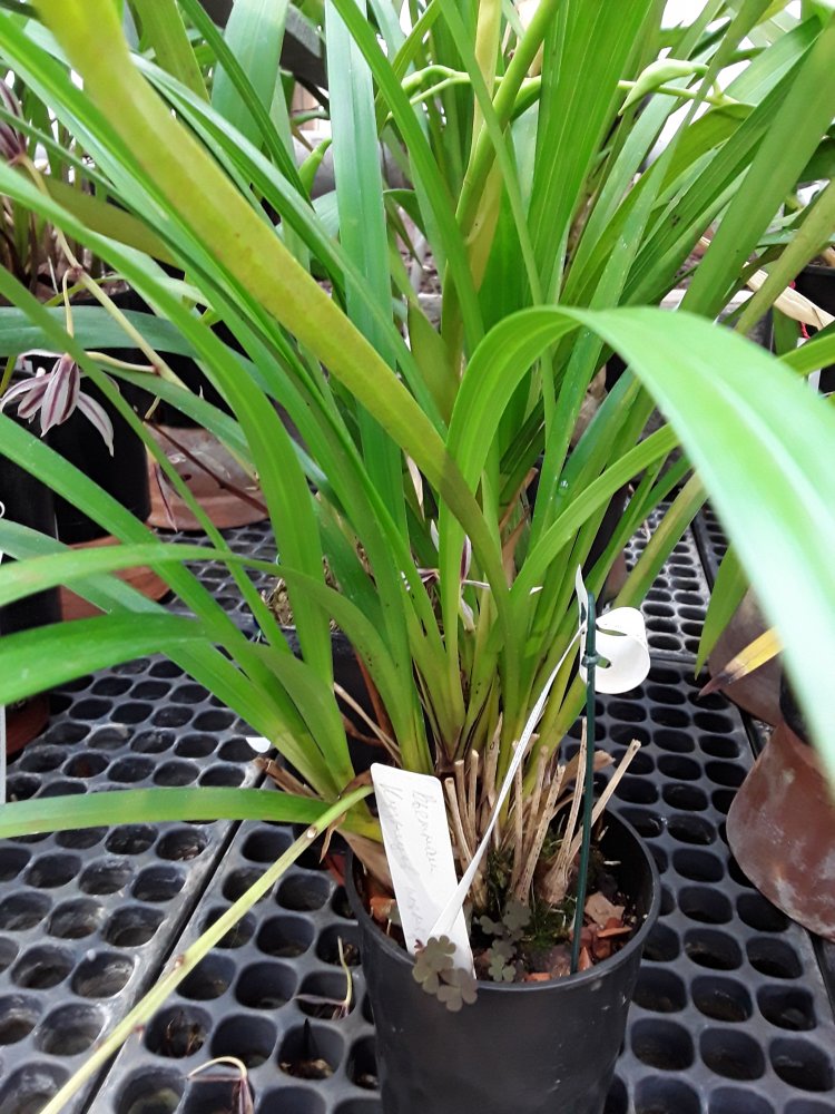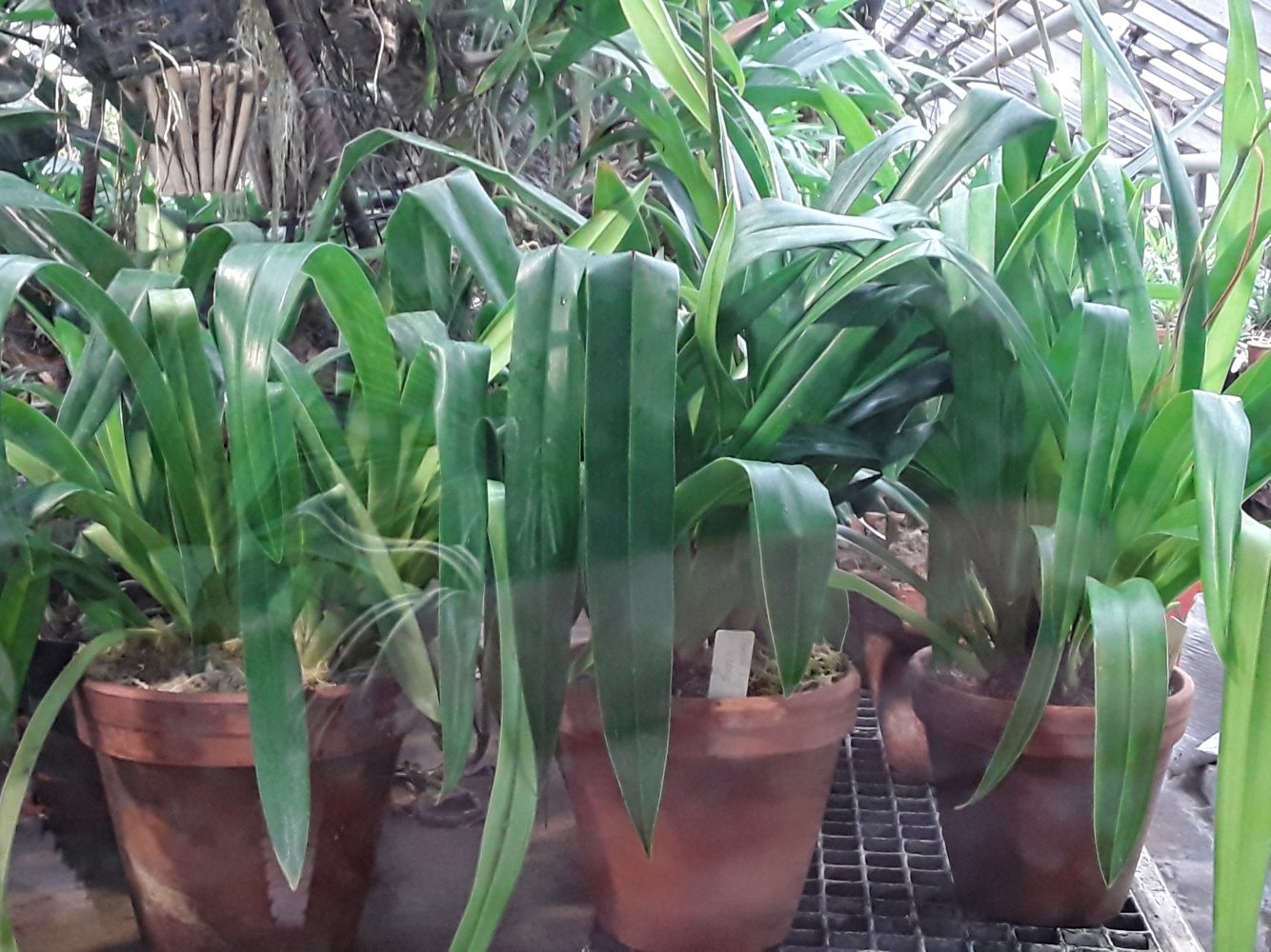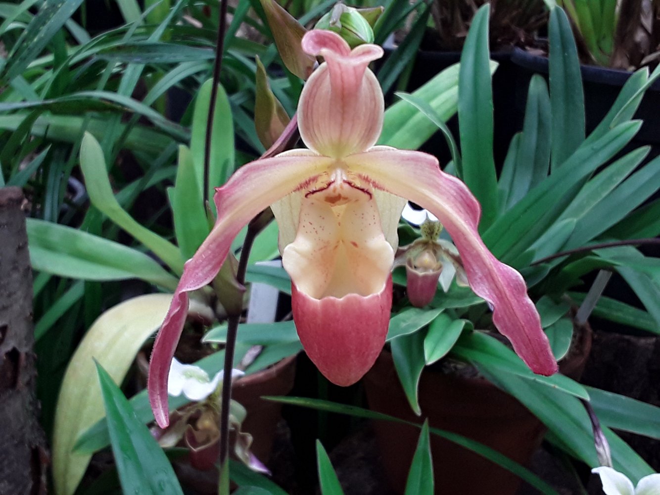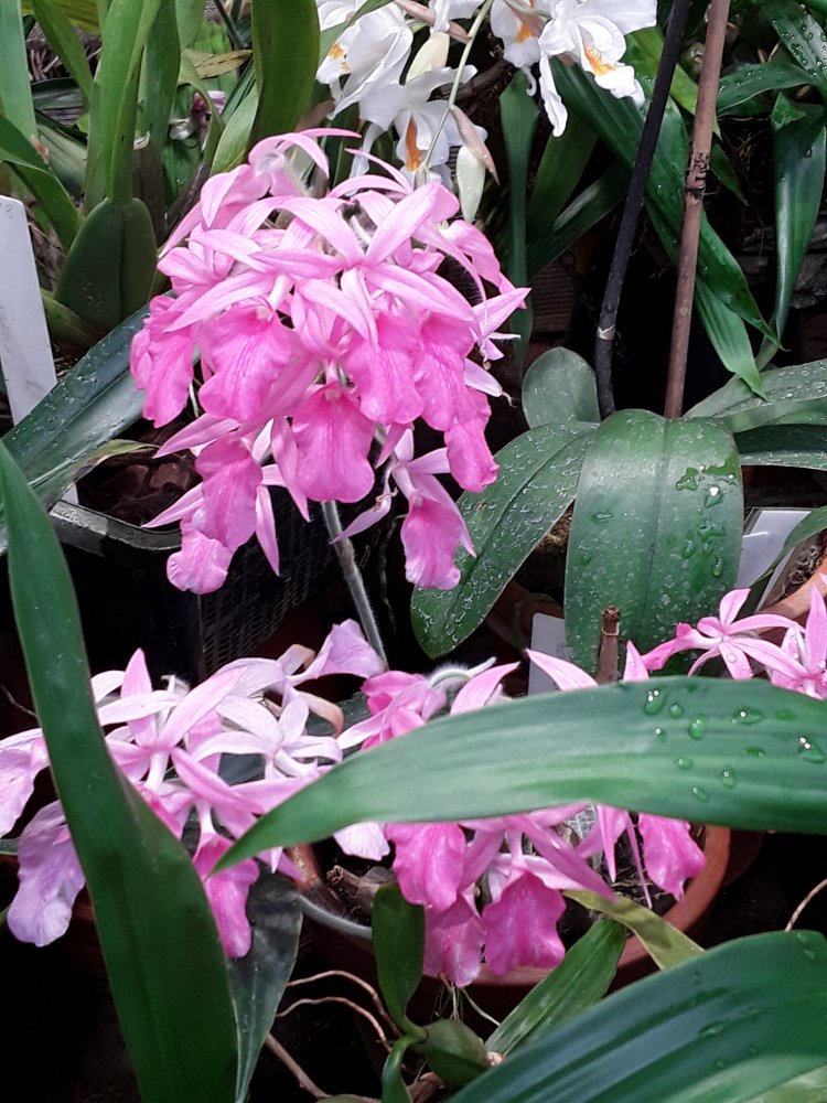 Также было представлено несколько цветущих фрагмипедиумов, но все были подписаны просто hybr. Эта группа орхидей поразила изумительным состоянием самих растений, что для ботсадов большая редкость. Очень крупные экземпляры, с идеально здоровыми листьями. Посажены все в огромные глиняные горшки в смесь обычной лесной сосновой коры и лесного мха. С учетом, что поливаются там все орхидеи водопроводной водой из старейшего (по состоянию) водопровода, а везде пишут, что это категорически делать нельзя, лично у меня эти два факта вызвали удивление.