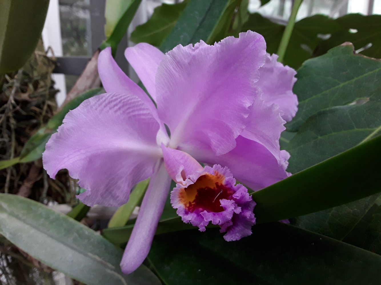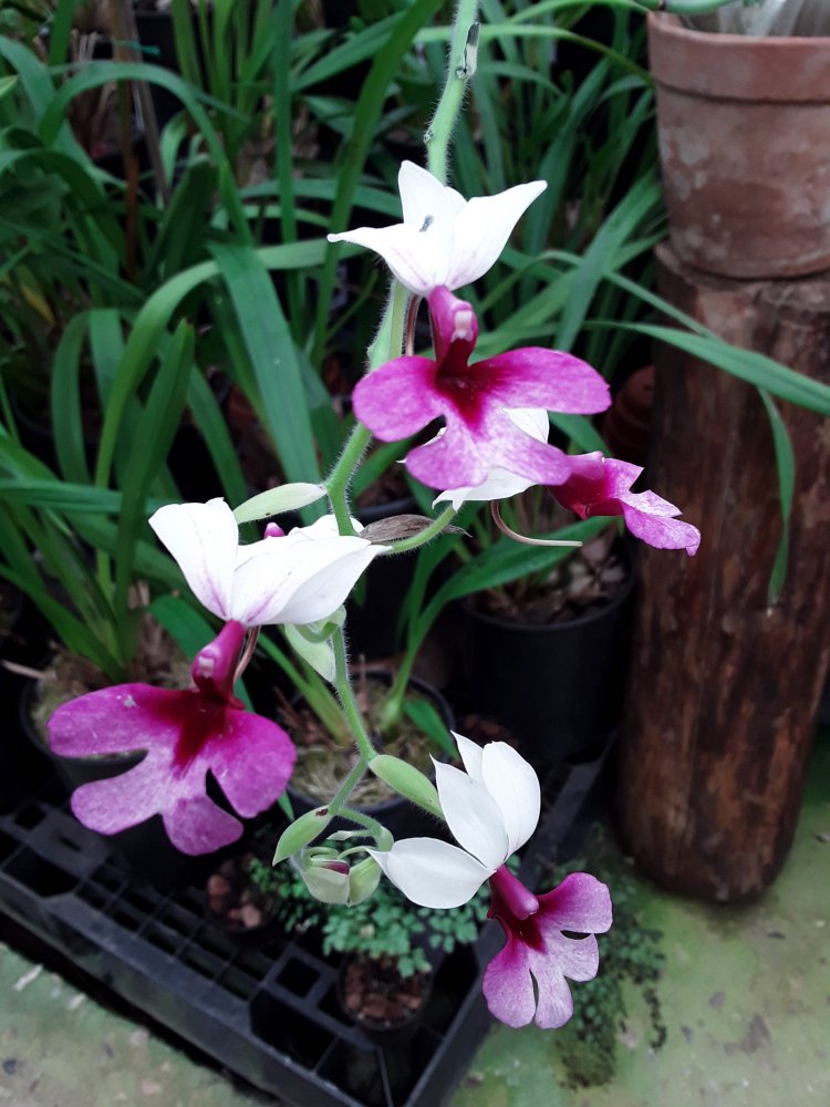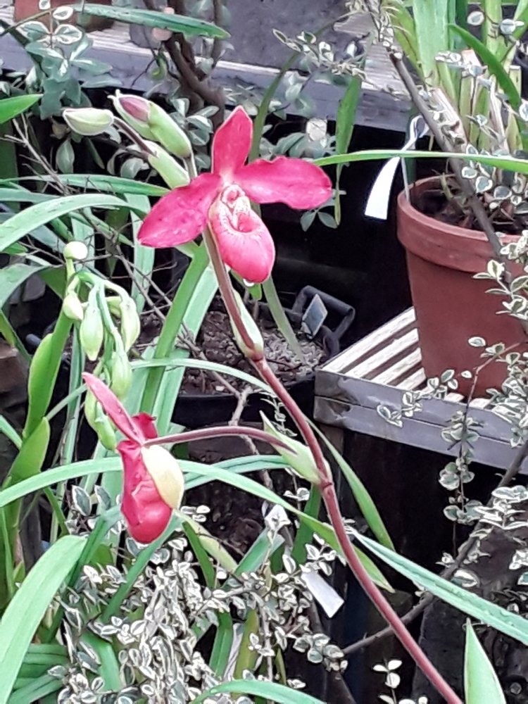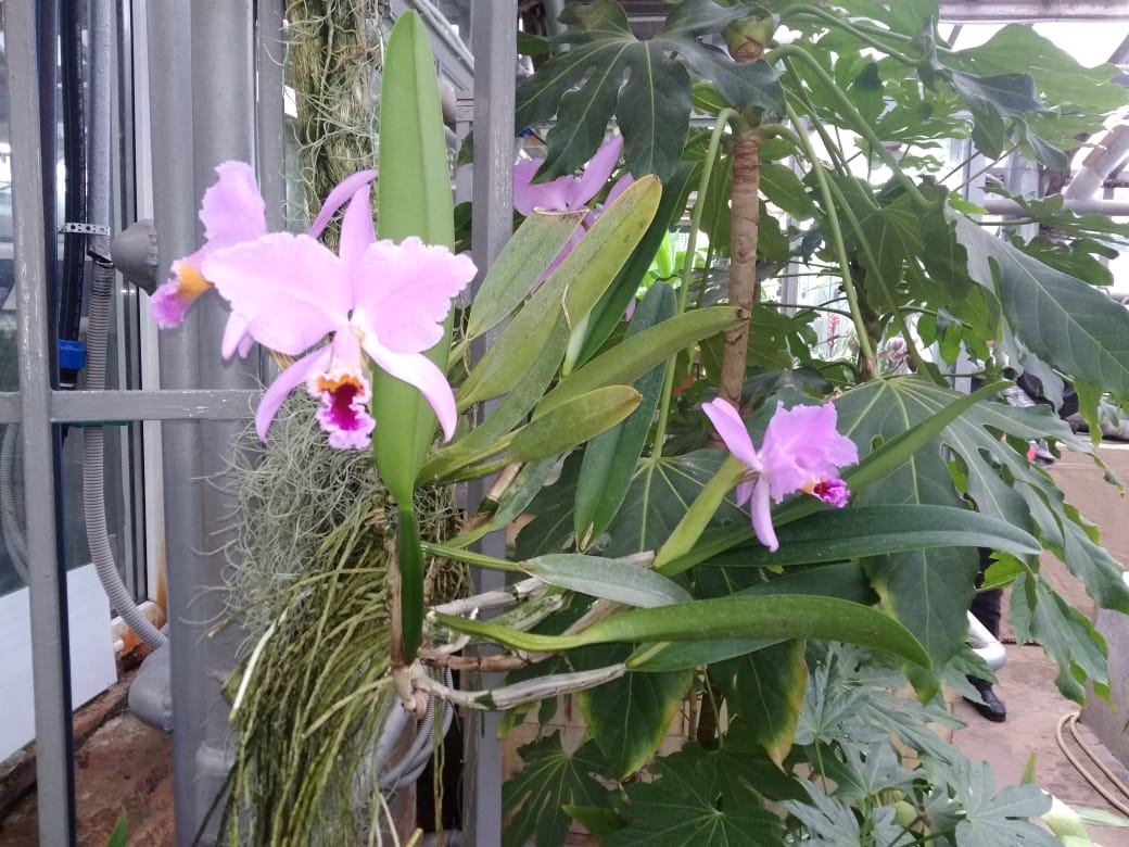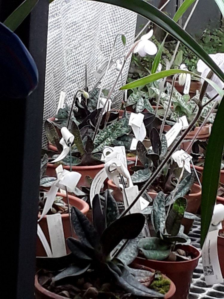 Также было представлено несколько цветущих фрагмипедиумов, но все были подписаны просто hybr. Эта группа орхидей поразила изумительным состоянием самих растений, что для ботсадов большая редкость. Очень крупные экземпляры, с идеально здоровыми листьями. Посажены все в огромные глиняные горшки в смесь обычной лесной сосновой коры и лесного мха. С учетом, что поливаются там все орхидеи водопроводной водой из старейшего (по состоянию) водопровода, а везде пишут, что это категорически делать нельзя, лично у меня эти два факта вызвали удивление.