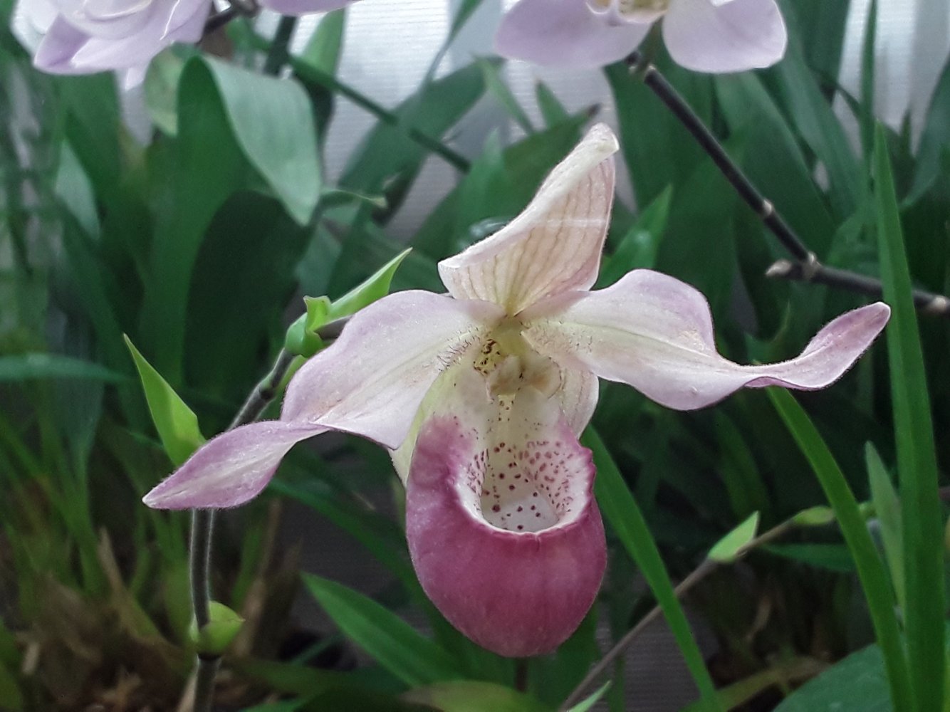 Paphiopedilum Leeanum (первичный гибрид Paphiopedilum spicerianum × Paphiopedilum insigne) - был огромный экземпляр из 5 цветущих розеток, крупное растение.