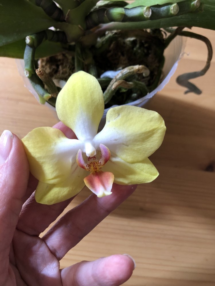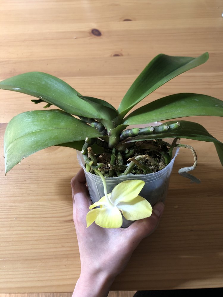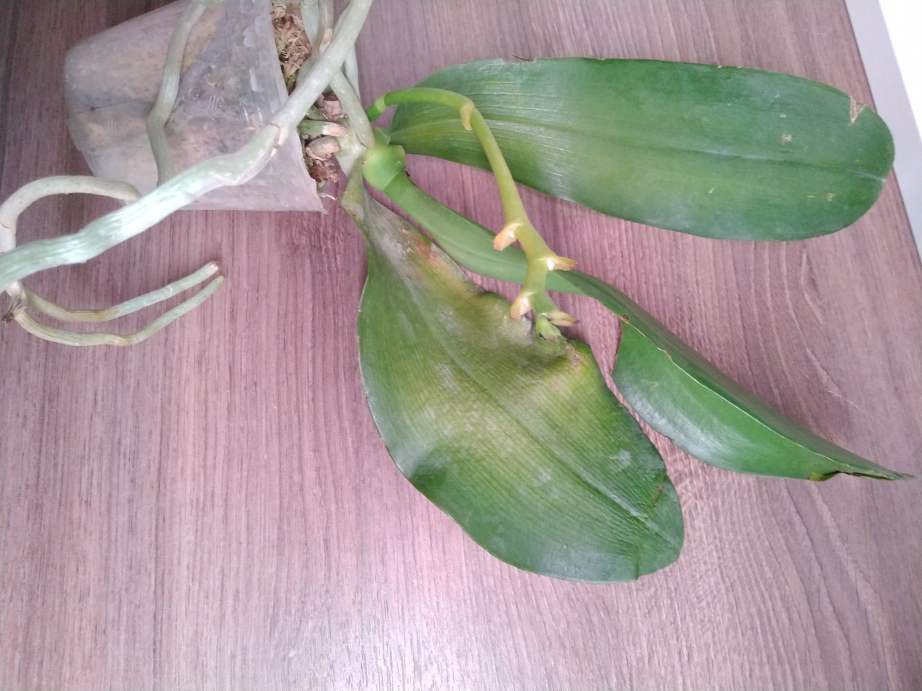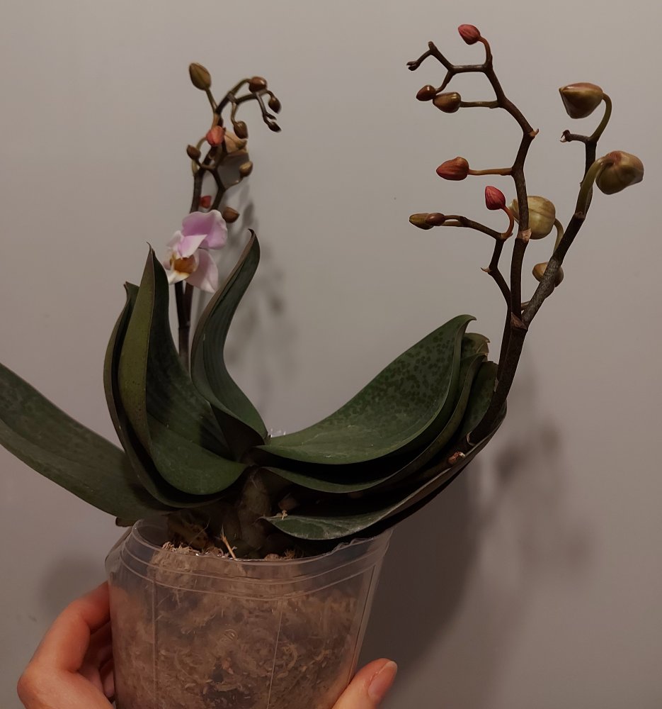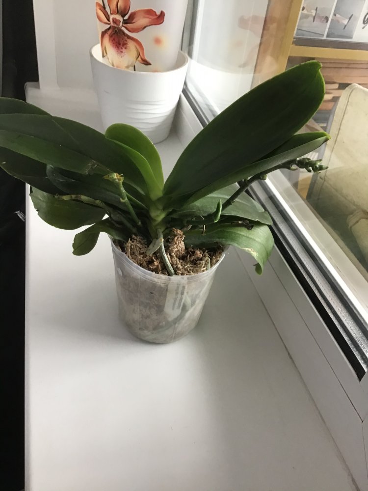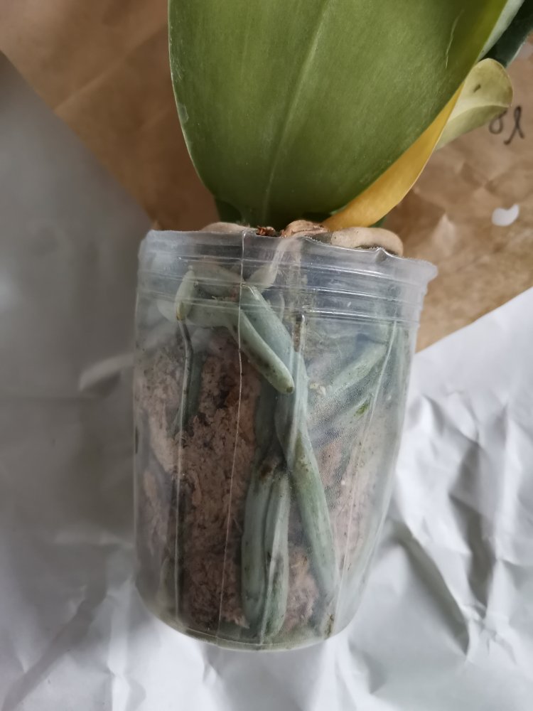 Отправлено прекрасное растение, к сожалению, в дороге корни подгнили, у края горшка живых нет, тургор снижен. Немного полила, надеюсь внутри остались живые корешки, очень не хочется срезать цветоносы.