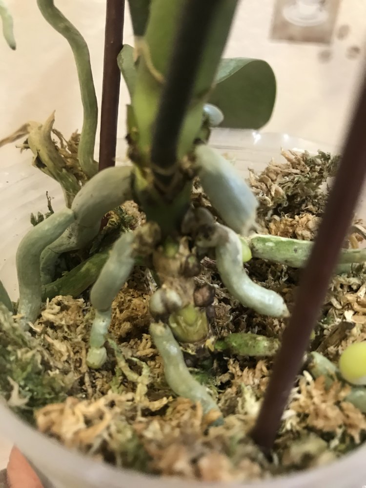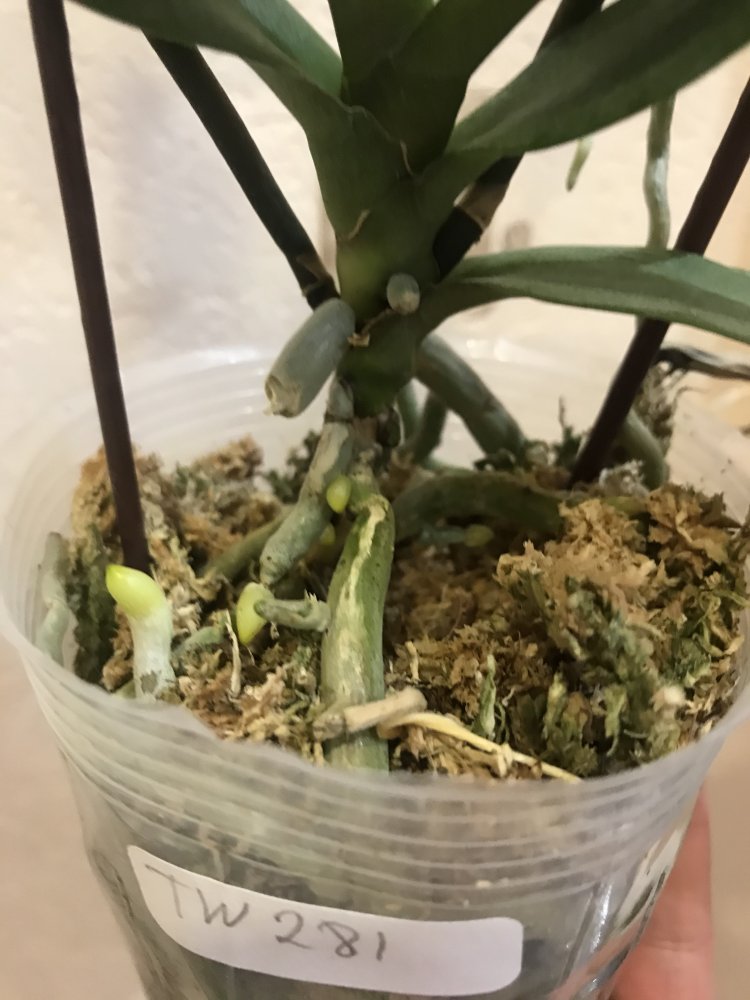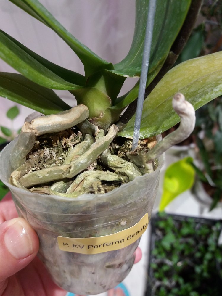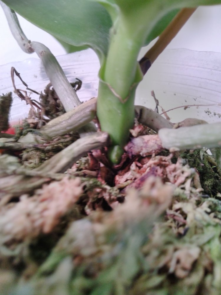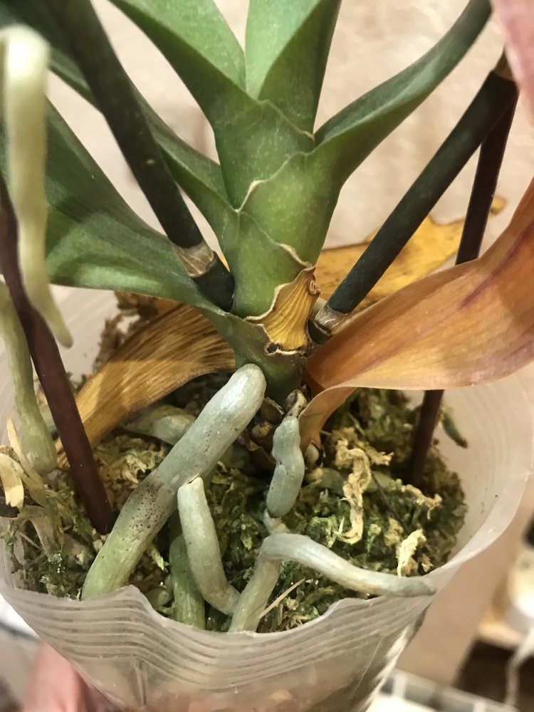 Потеря тургора также минимальная, листовая розетка небольшая, много корней особенно воздушных. Мох влажный. Один цветонос засушен, виден проклюнувшийся второй. Общее состояние отличное.