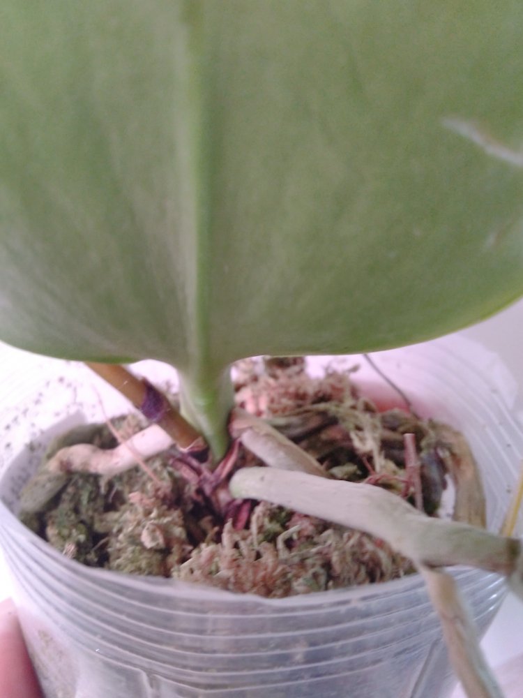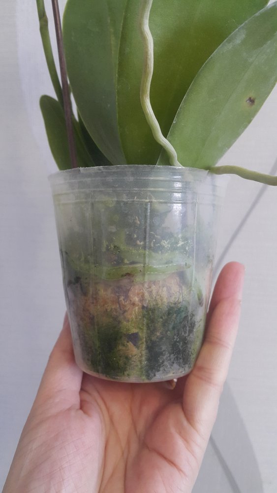 Мох влажный, растение абсолютно здоровое, много корней, растущий листик, на цветоносе сохранились очень красивые цветочки небольшого размера, камера совершенно не передала красоту.