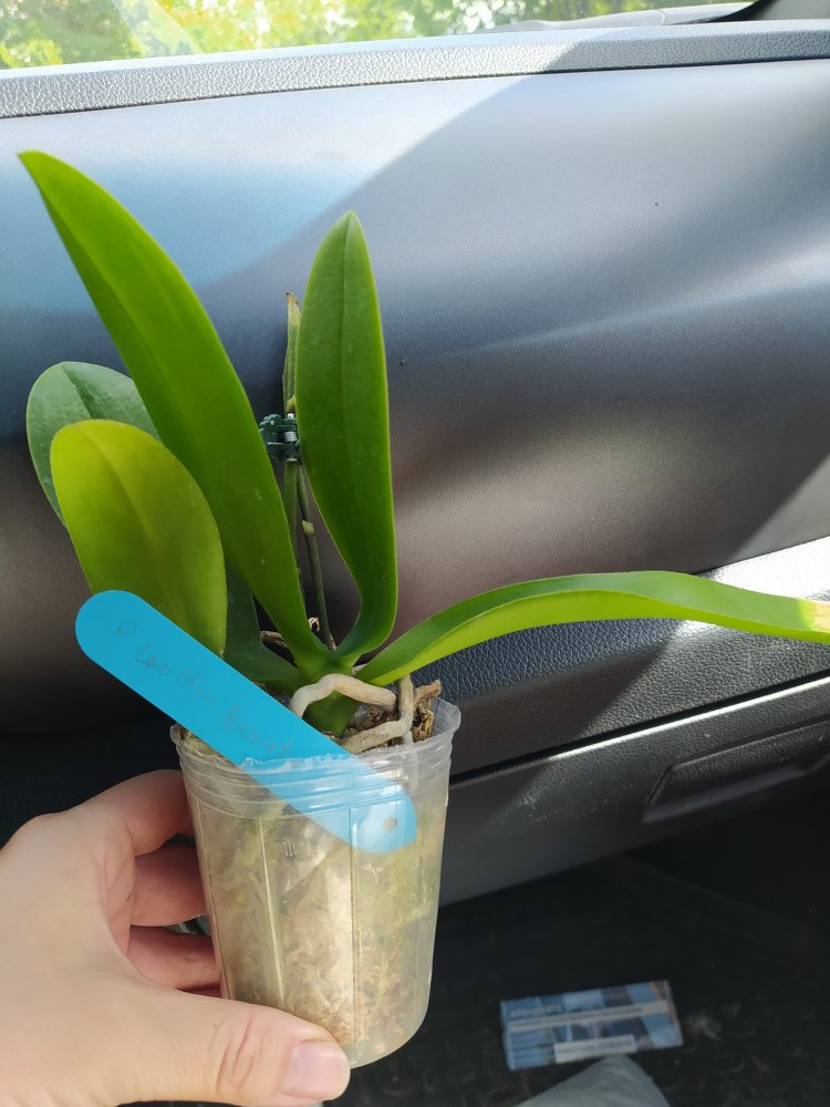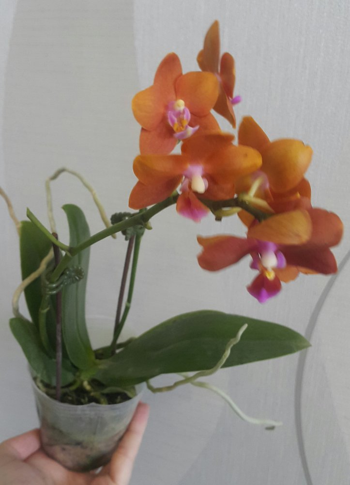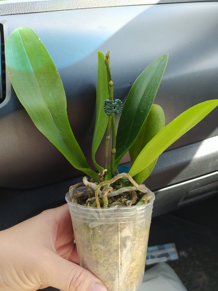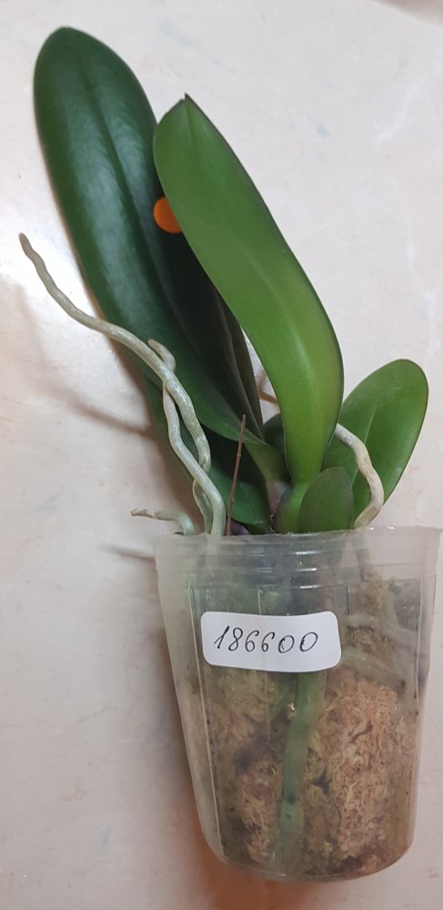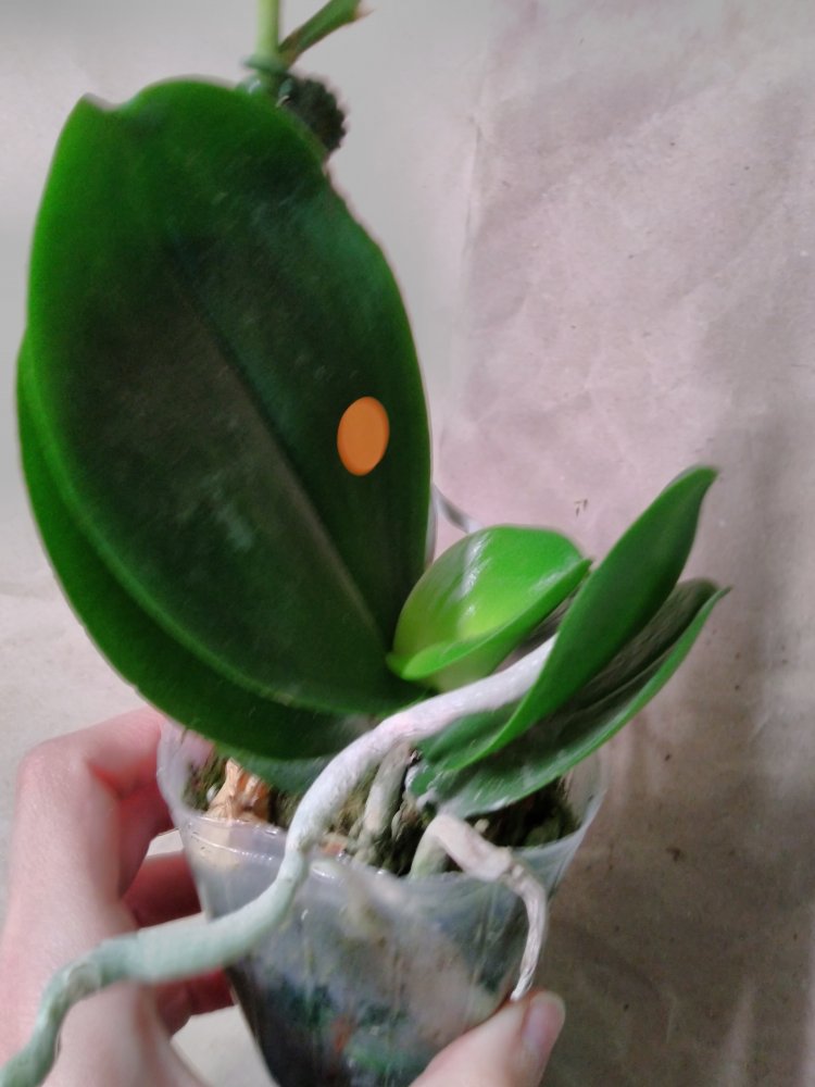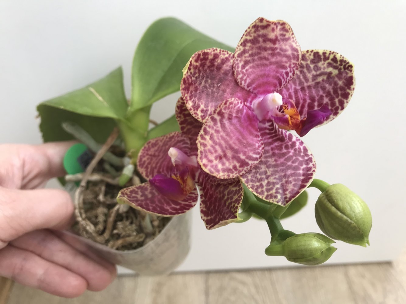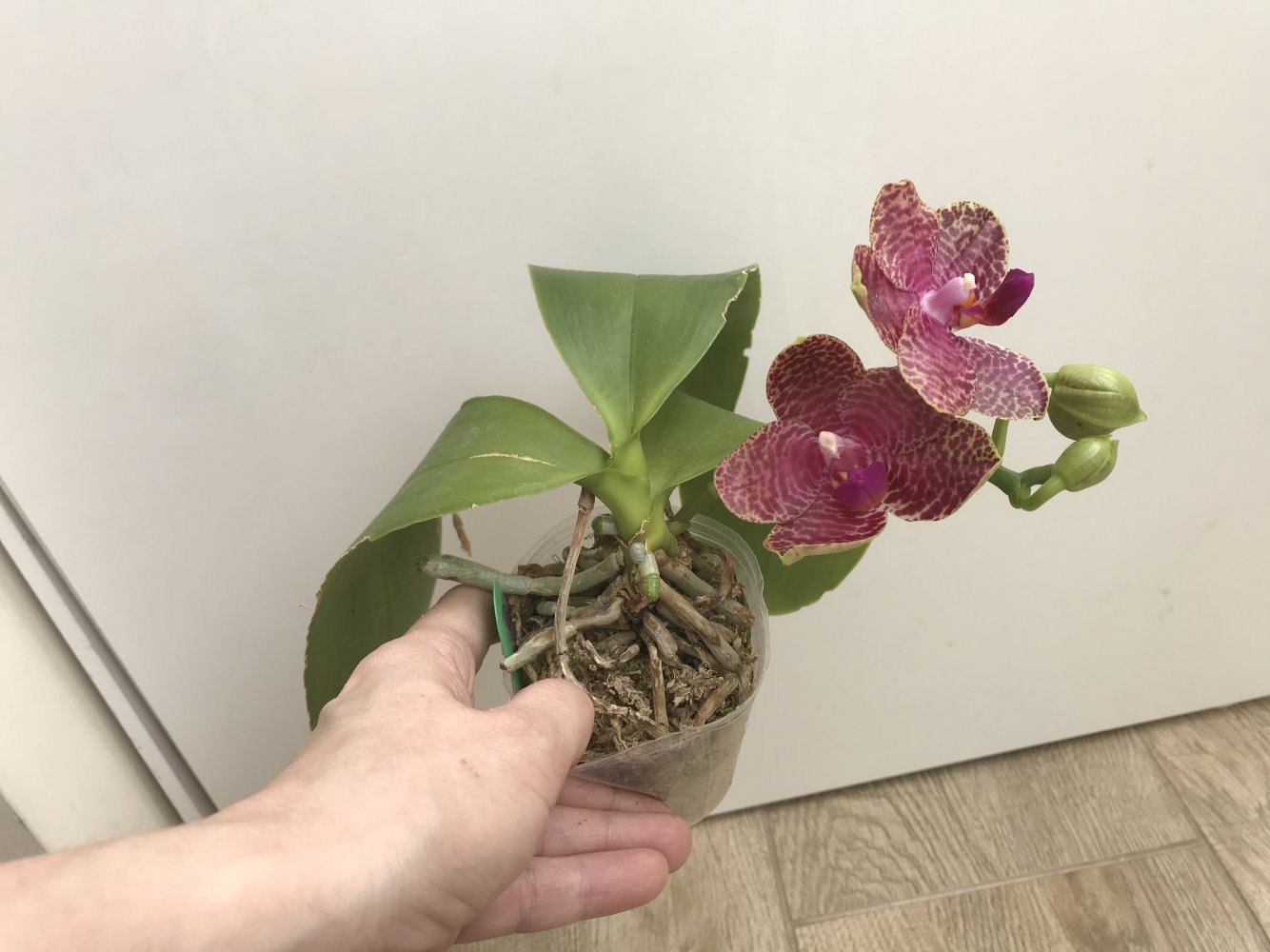 Отличный подросток,размер полноценный 2,5. Мох влажный, но ни корни, ни листья не пострадали, доехал в хорошем состоянии. Листья в тургоре, корешки живые, цветочки не все завяли) Цветочки размером 4,5 см,цвет в реальности обалденный, давно такой хотела! ❤️ Спасибо огромное за чудесное растение!!! И отдельное спасибо за возможность увидеть цветы, жаль что в первой поставке с охоты цветоносы были срезаны.