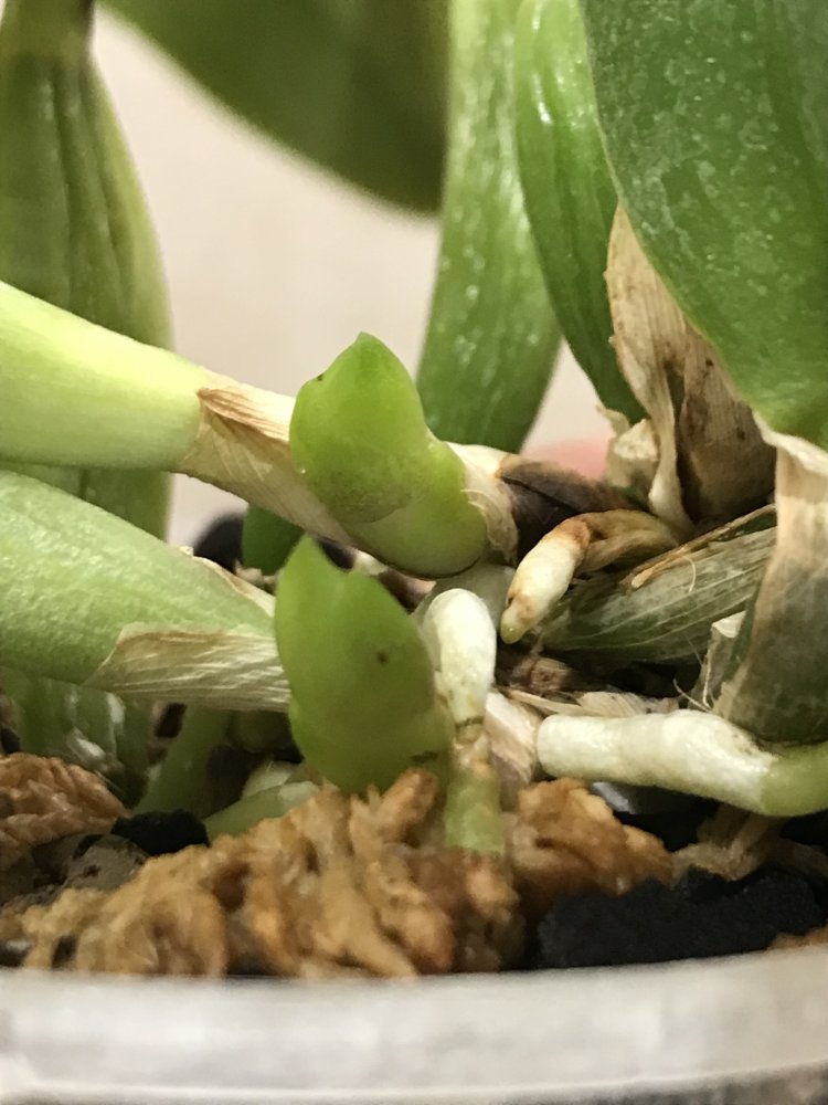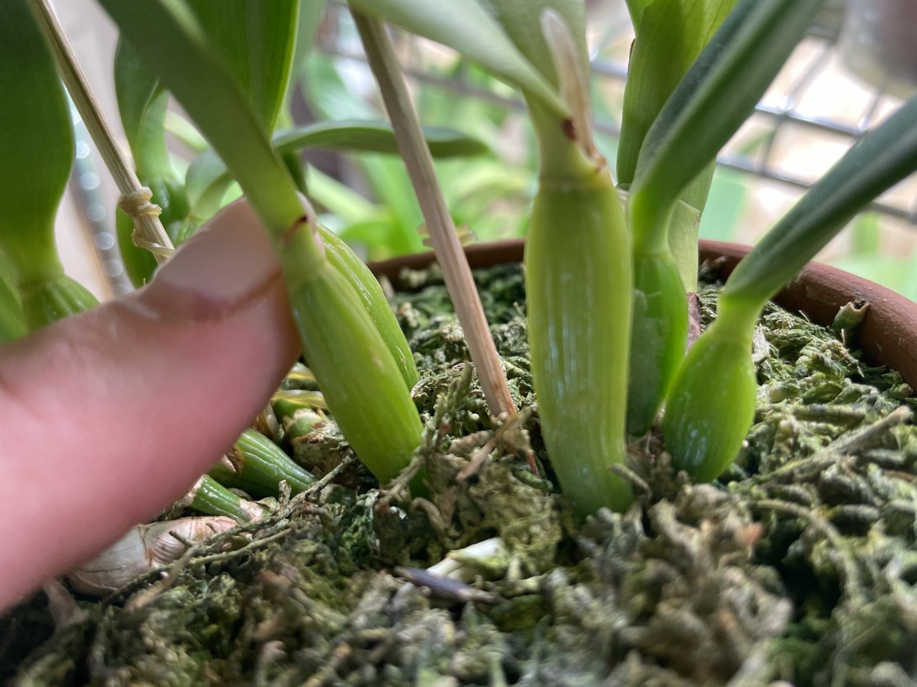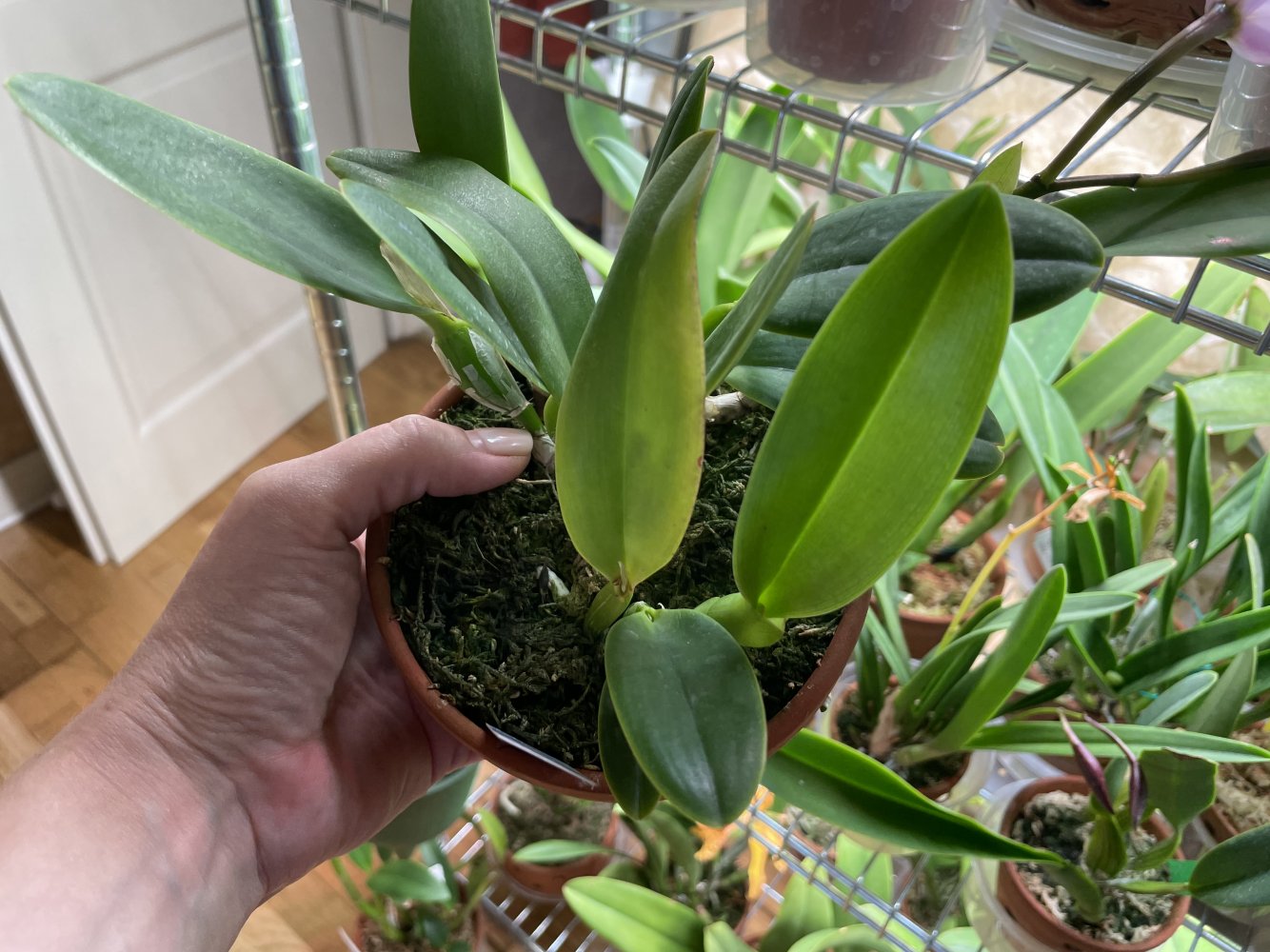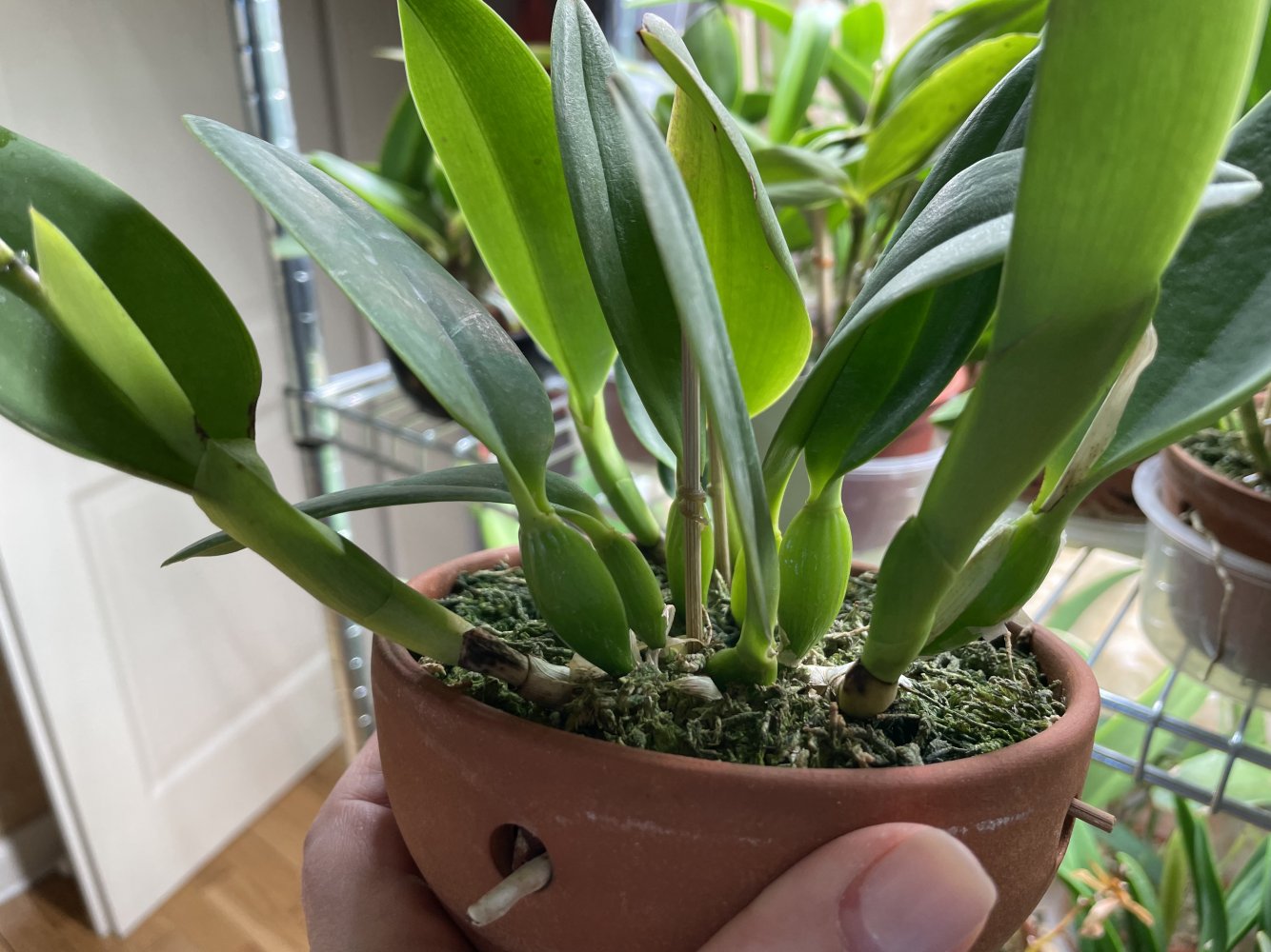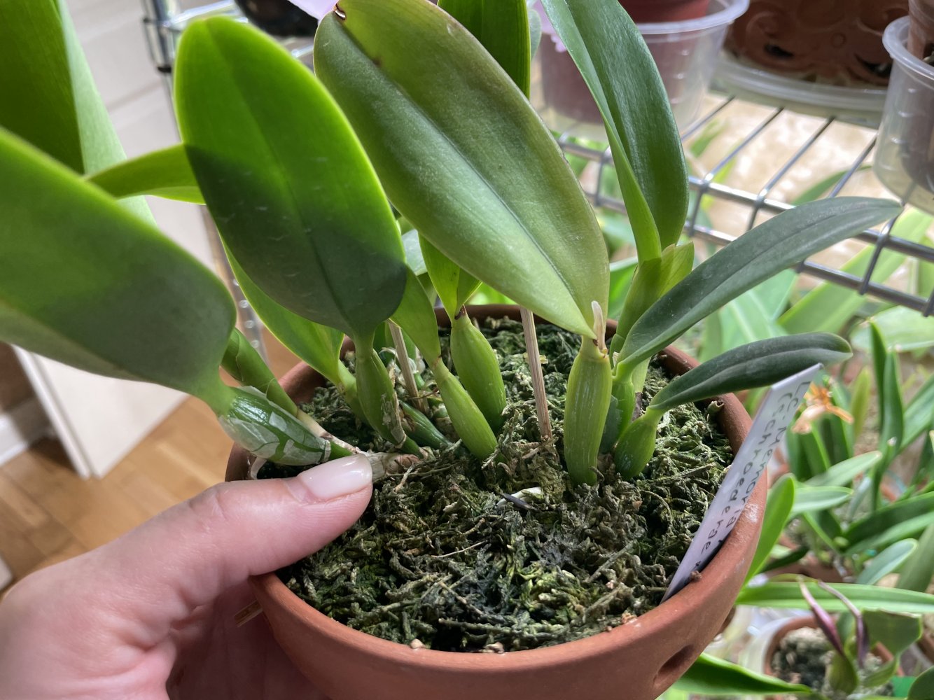 Растение с большой шапкой куртиной приобрела на Авито.У женщины на тот момент она жила уже три года,получена от Мики.Растение настолько разрослось,что не видно было горшка,бульбочки свисали до самого основания горшочка.Они были мелкие,кое-где были сухие чехлы.У женщины Каттлея цвела всего однажды.Радость покупки сменилось ступором😏Как сажать-то?Приняла решение делить.Поделила,если я не ошибаюсь,на делёнки по 9,8,7,6,5,и 4 роста.Делёнки разлетелись буквально за час))Себе оставила делёночку из 4-х)Неуверена,что смогу найти фото той делёнки.Покажу их на данный момент