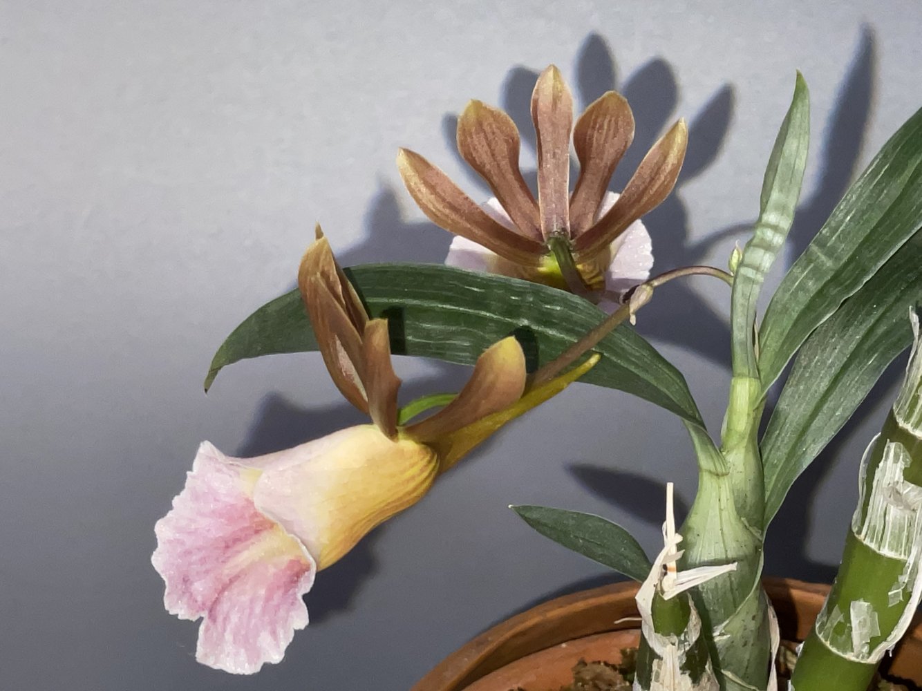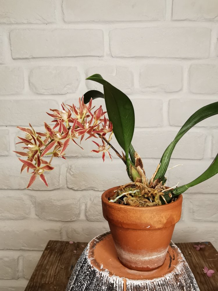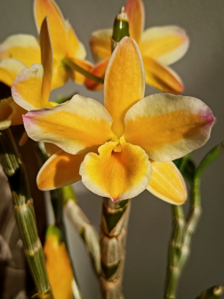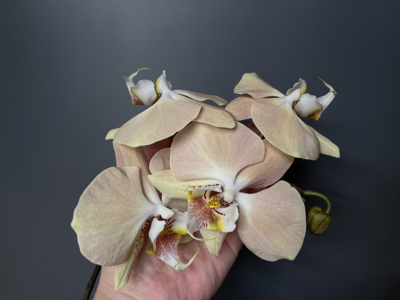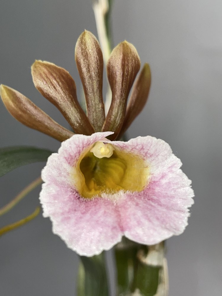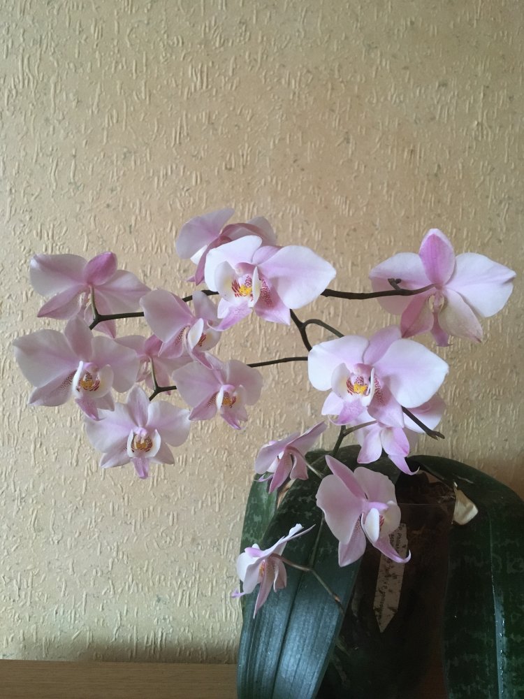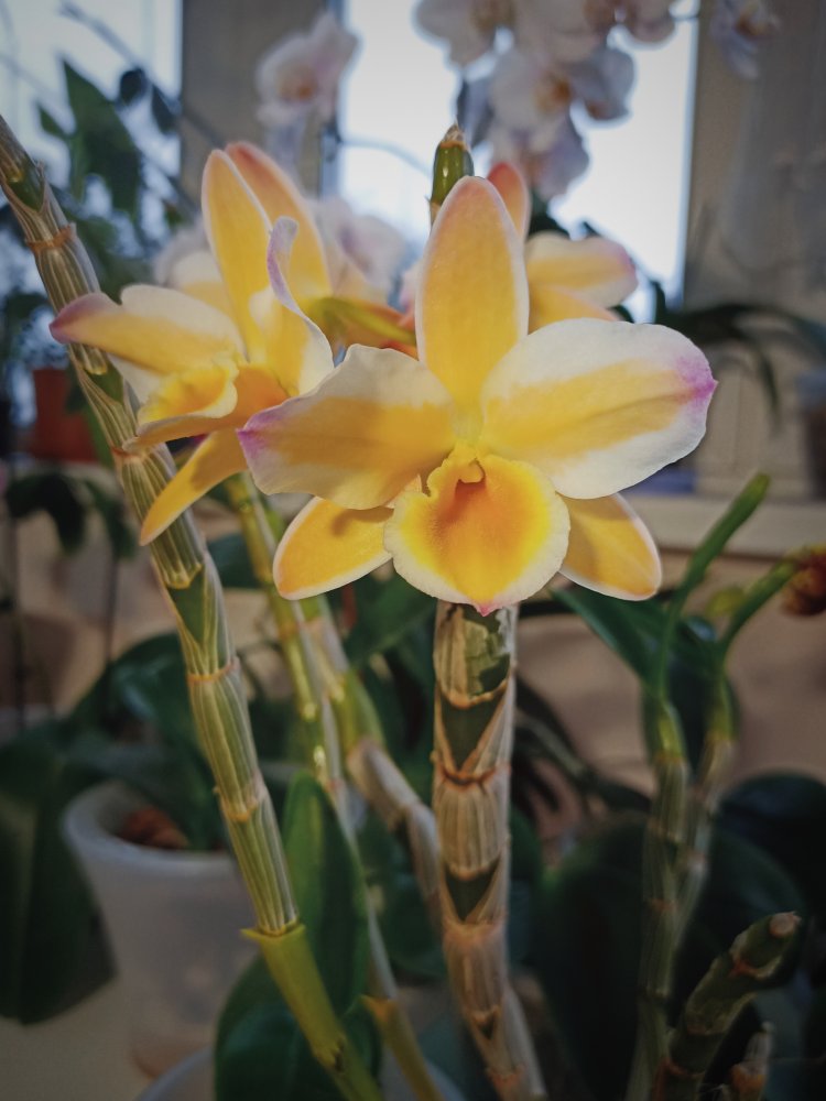 Немного истории: 7 лет назад увидела объявление о продаже 4-х летнего дендробиума Amabile. На фото был жирный в 4 крупных роста красавец с огромными около 10см тёмно-зелеными листьями. Посмотрев как он должен цвести, сразу поняла-мой))) Прежняя хозяйка сказала, что привезла его 4 года назад из Вьетнама, что растение крупное, цвести не хочет и, наверное, ему у неё плохо и пора найти новое место (жалко растень). Прибыл он ко мне в горшочке 2,5” в камнях для устойчивости, учитывая высоту ростов в 40см! Был пересажен в 3”, спустя время в 6”. Прекрасно нарастил и наращивает корневую, гонит новые росты, крупнее прежних, НО, не цветёт. Я меняла место, увеличивала/уменьшала влажность и солнце – НЕ цветёт. Спустя 7 лет смирились, итак очень красивый и мощный. За 7 лет скинул всего 4 листа и 1 старейший рост. Я никак не могла успокоиться, что не так, почему не цветём??? Еды море, рост отличный, цветоносных спящих почек на каждом росте от 5 до 7 штук.