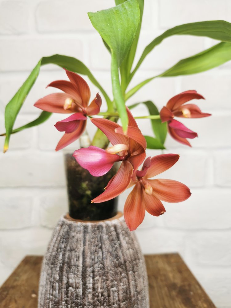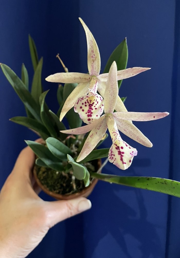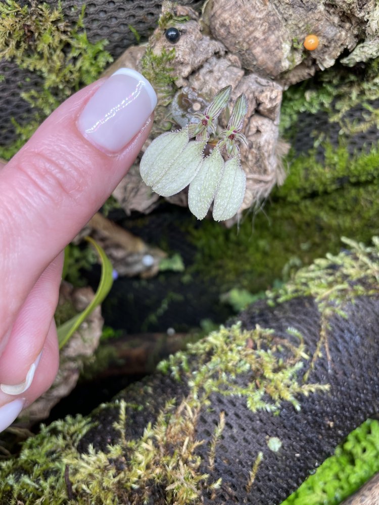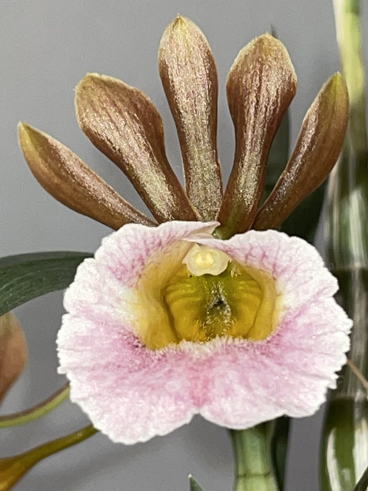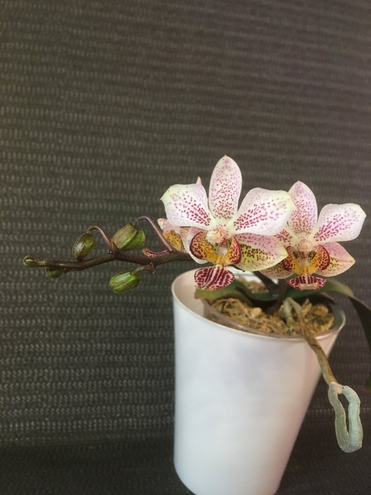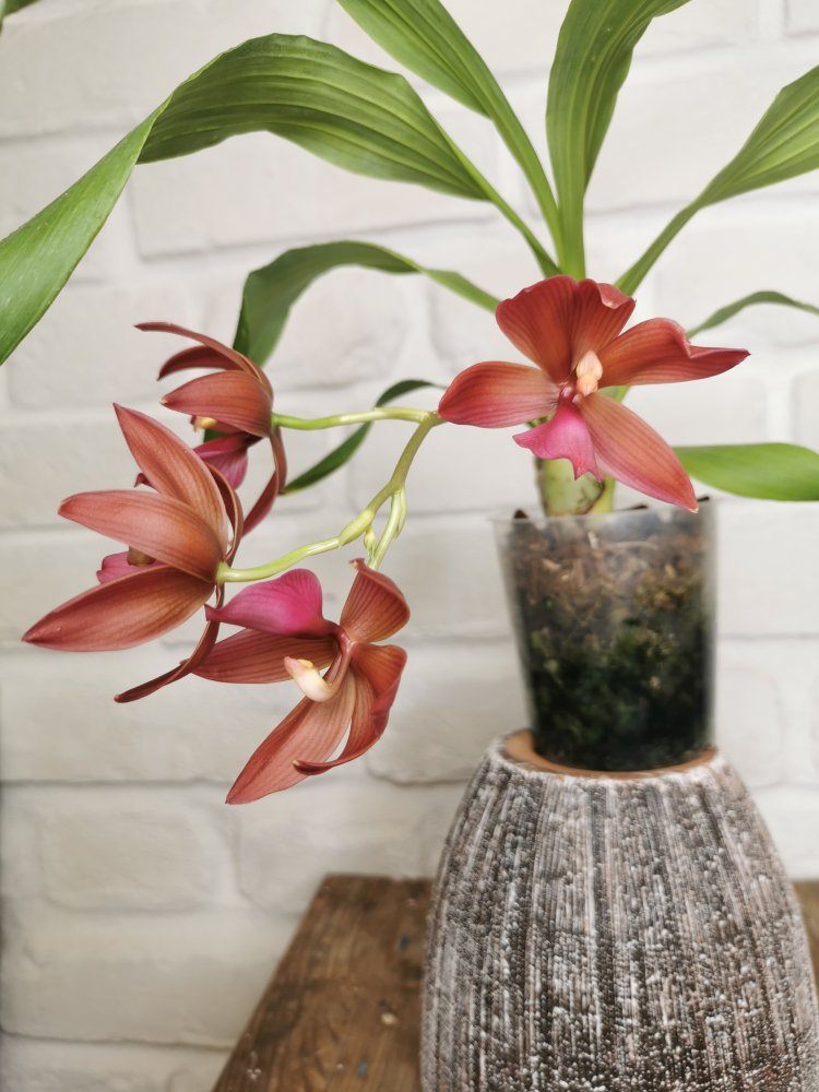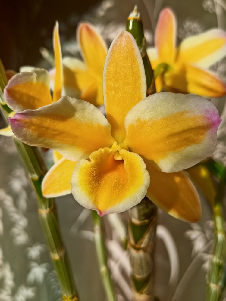 Немного истории: 7 лет назад увидела объявление о продаже 4-х летнего дендробиума Amabile. На фото был жирный в 4 крупных роста красавец с огромными около 10см тёмно-зелеными листьями. Посмотрев как он должен цвести, сразу поняла-мой))) Прежняя хозяйка сказала, что привезла его 4 года назад из Вьетнама, что растение крупное, цвести не хочет и, наверное, ему у неё плохо и пора найти новое место (жалко растень). Прибыл он ко мне в горшочке 2,5” в камнях для устойчивости, учитывая высоту ростов в 40см! Был пересажен в 3”, спустя время в 6”. Прекрасно нарастил и наращивает корневую, гонит новые росты, крупнее прежних, НО, не цветёт. Я меняла место, увеличивала/уменьшала влажность и солнце – НЕ цветёт. Спустя 7 лет смирились, итак очень красивый и мощный. За 7 лет скинул всего 4 листа и 1 старейший рост. Я никак не могла успокоиться, что не так, почему не цветём??? Еды море, рост отличный, цветоносных спящих почек на каждом росте от 5 до 7 штук.