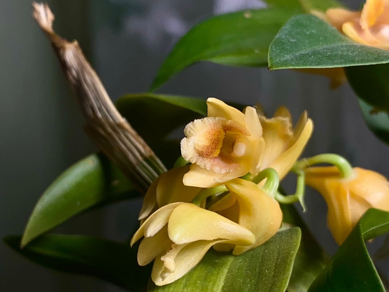 Dendrobium melaniae. Во всей своей красе. Цвет на фото в жёлтый больше отдаёт, на самом деле он более персиковый с розовинкой. Запах чайной розы вперемешку с запахом разрезанного яблока. Горлышко вглубине розовое
