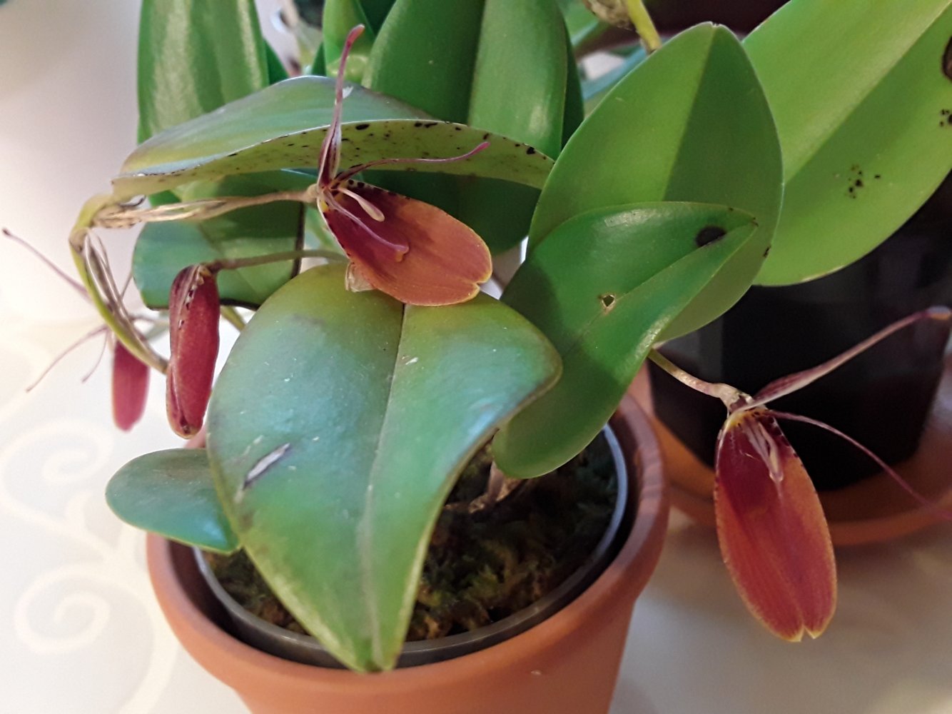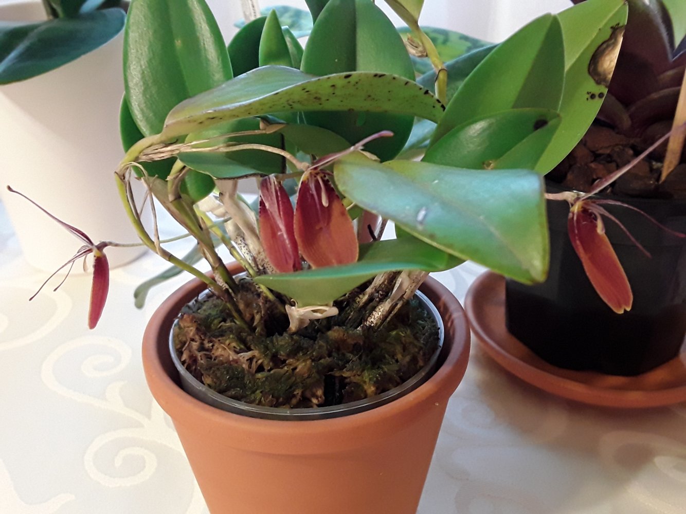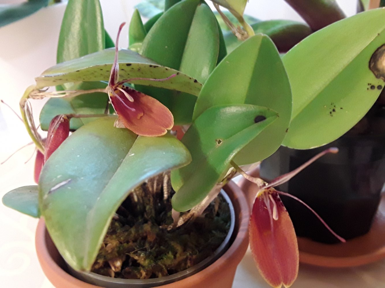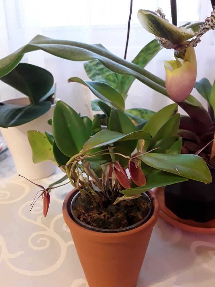 Сидит во мхе,горшочек вставлен в прозрачный стакан пластик. высокий,чтобы дольше держать влажность.Пересыхать не даю.Кормлю как и всех,Peters 20-20-20.