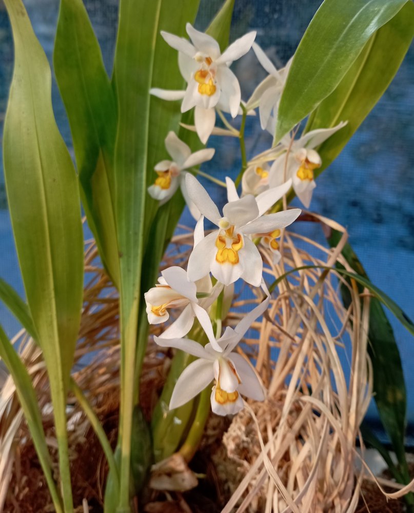 Coelogyne nitida. Получила осенью, она зацвела не успев адаптироваться и бульбы налить. Очень ароматная, днем на все помещение ароматит, что-то медово-цветочное )