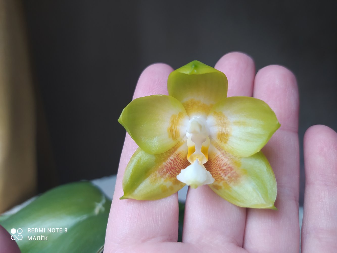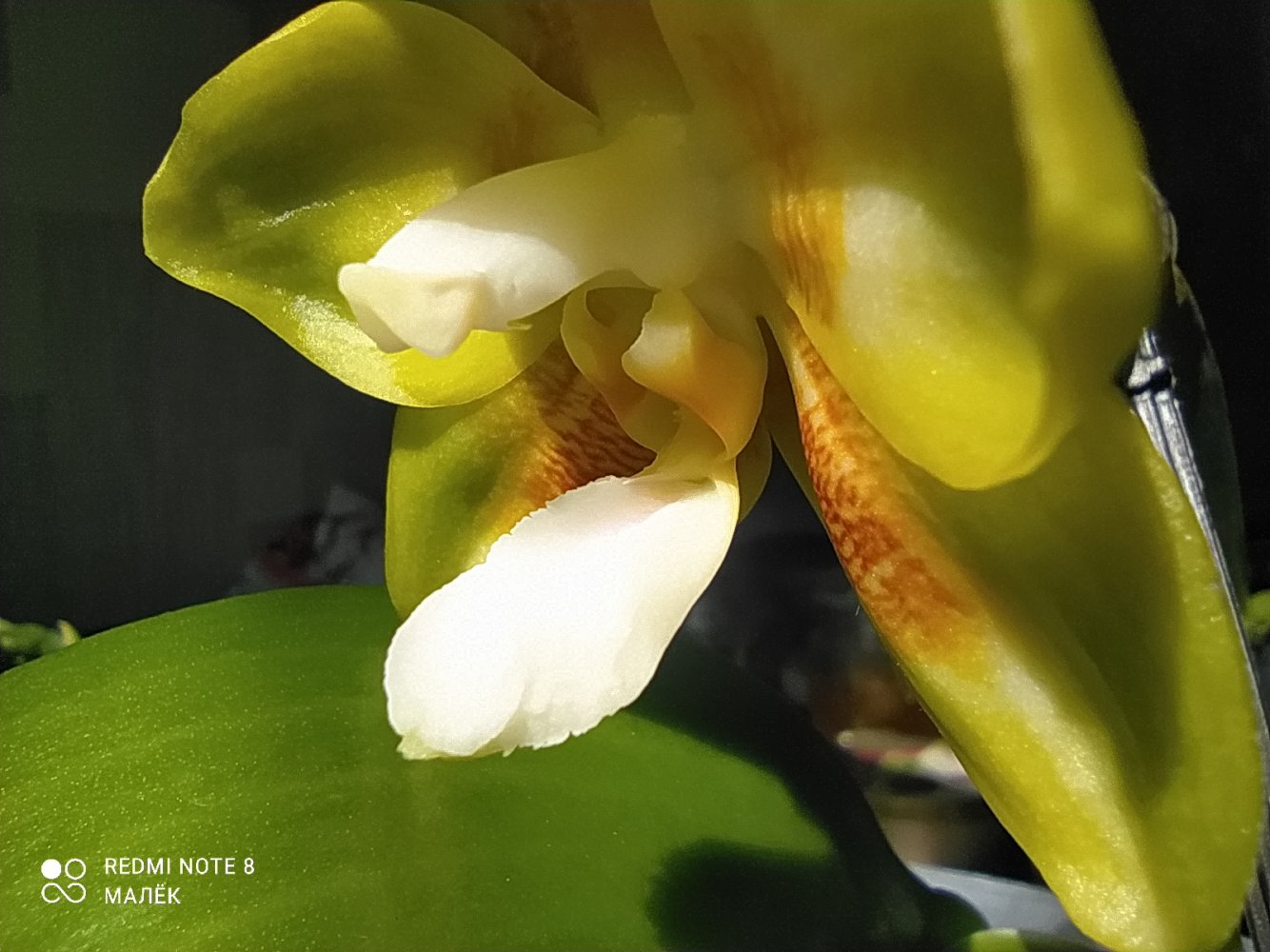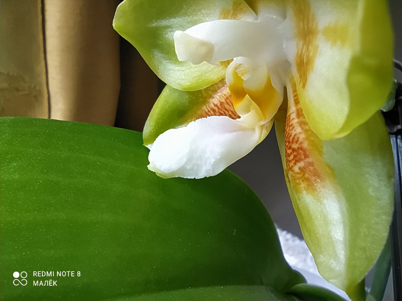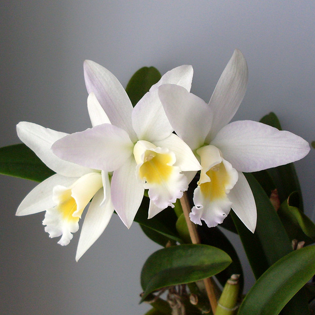 Cattleya hybrid. Когда бутоны только раскрываются, лепестки имеют цвет мякоти зелёного яблока, спустя время они становятся искрящимися белыми, а иногда с пурпурным румянцем. Яркое желтое пятно внутри губы, обрамленное рюшами, так и манит сунуть в него нос. Тогда любопытство будет вознаграждено тонким ароматом с анисовыми нотами.
