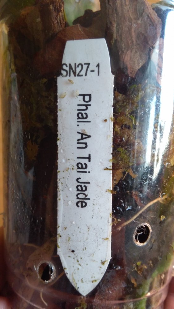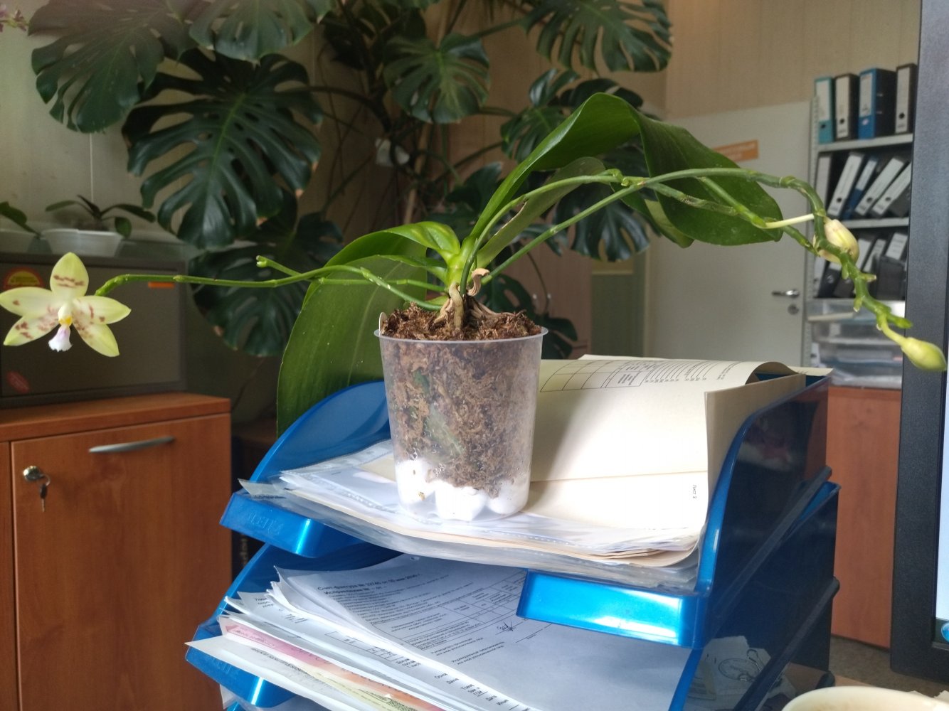 Phalaenopsis Zheng Min Colorization заполнила корнями весь горшок, в котором приехала с фермы, и после