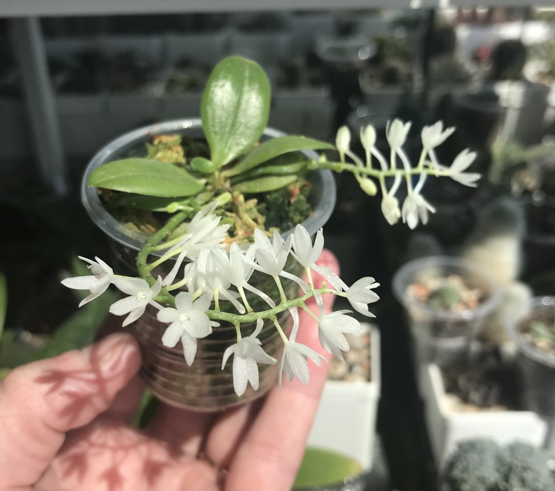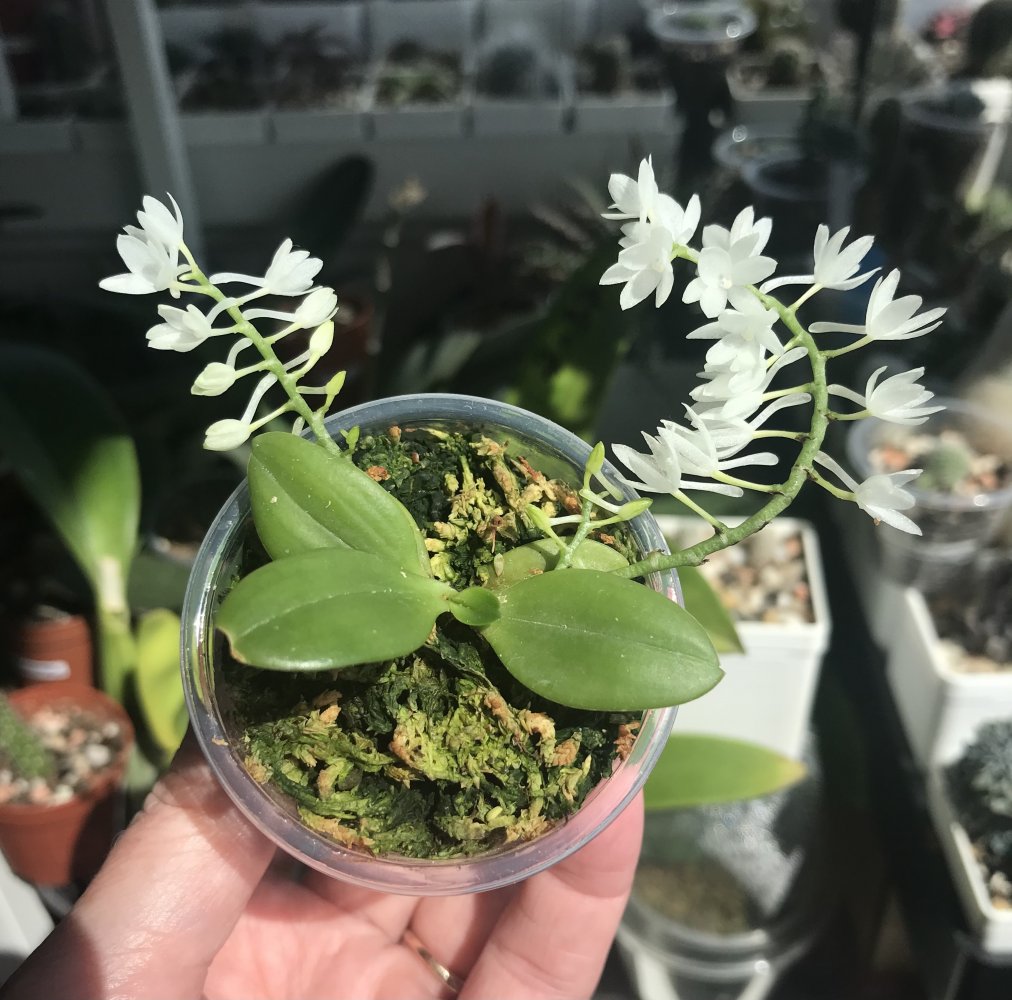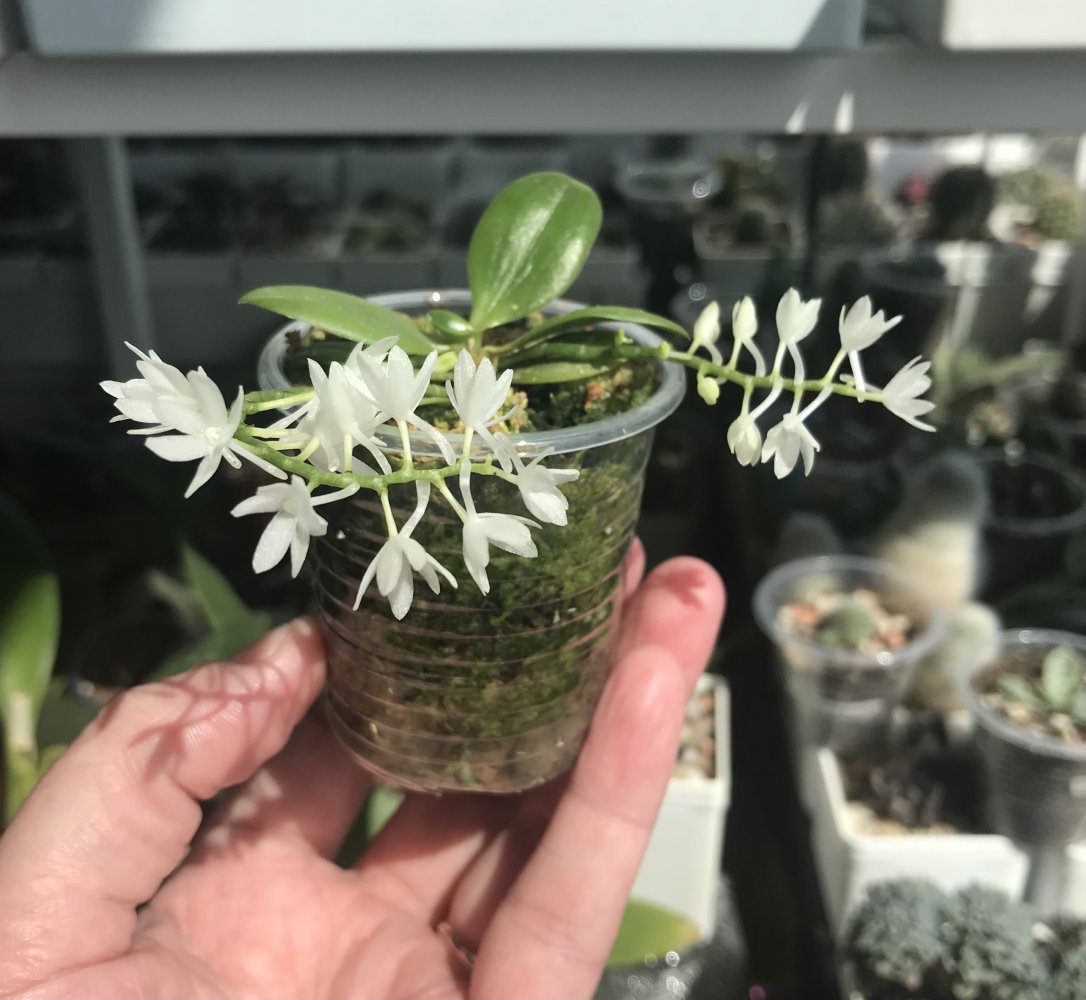 Такой кроха. и уже весь в цвету! Прелесть просто.. А запах наличествует, у нежнятины?))Aerangis hyaloides. Пока распустились два цветоноса, скоро третий. Нежнятина прям