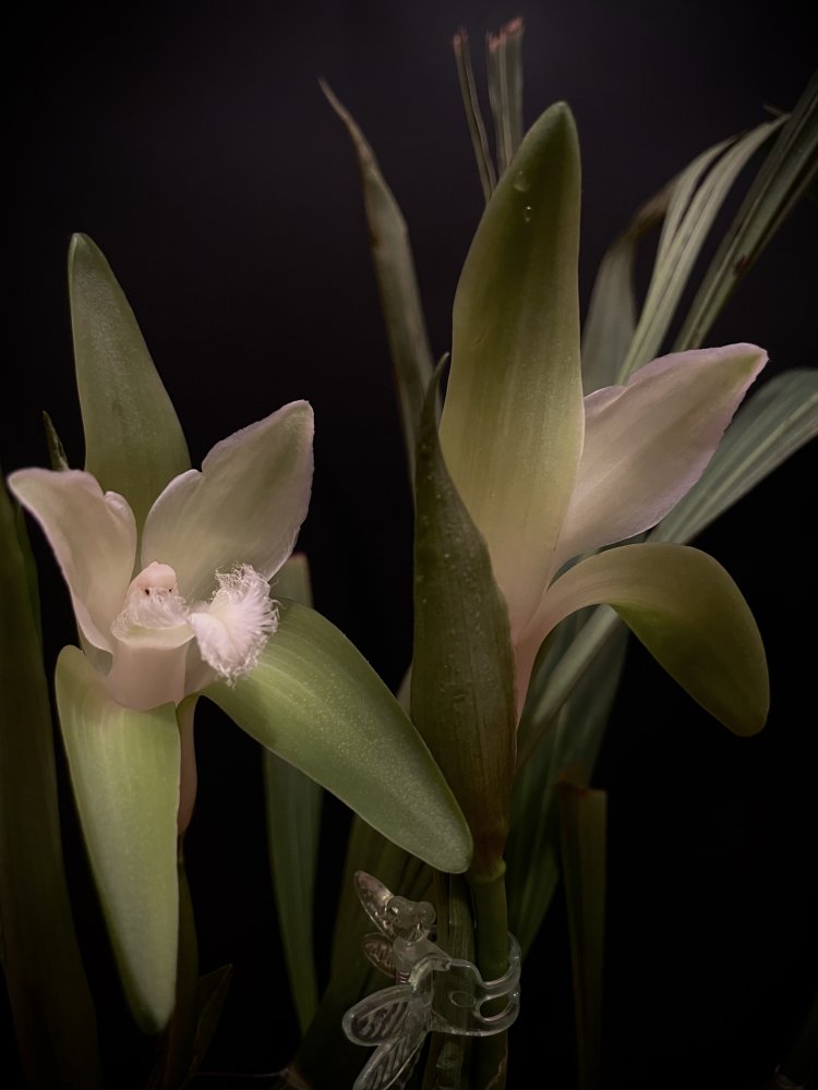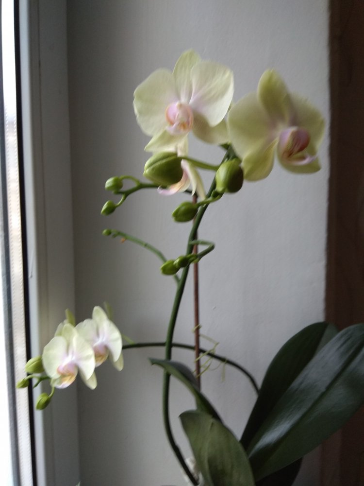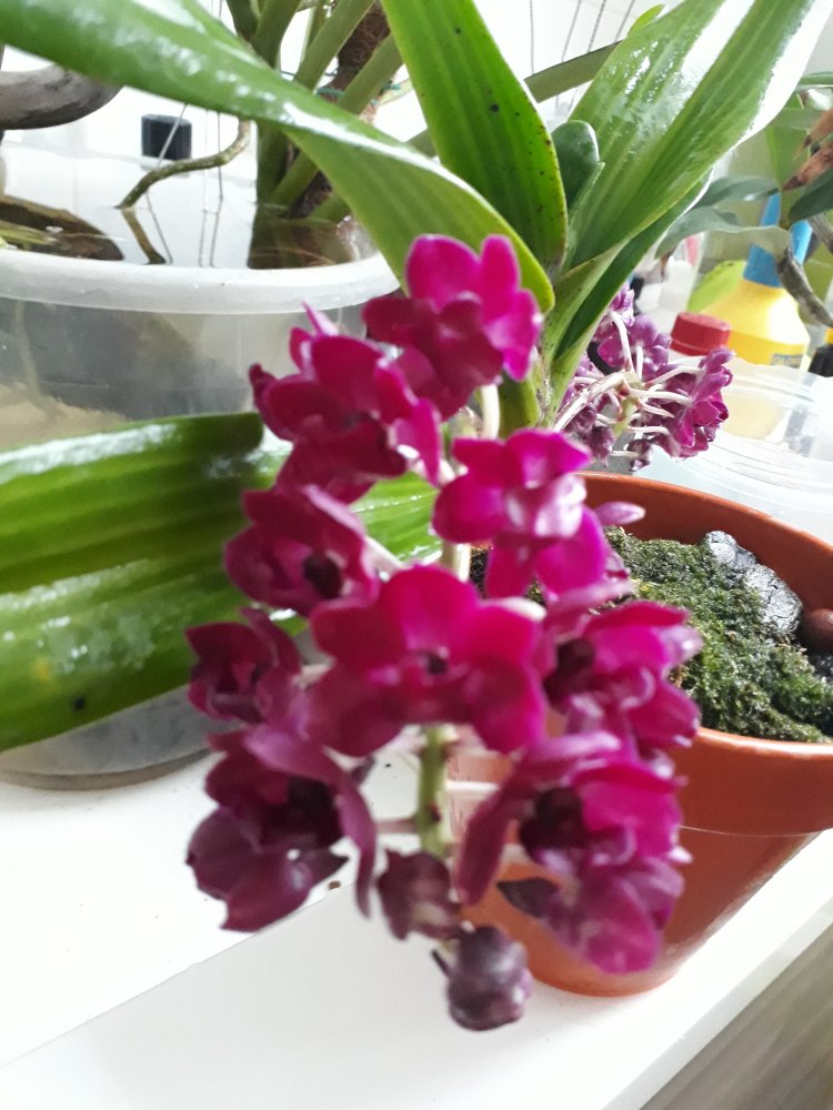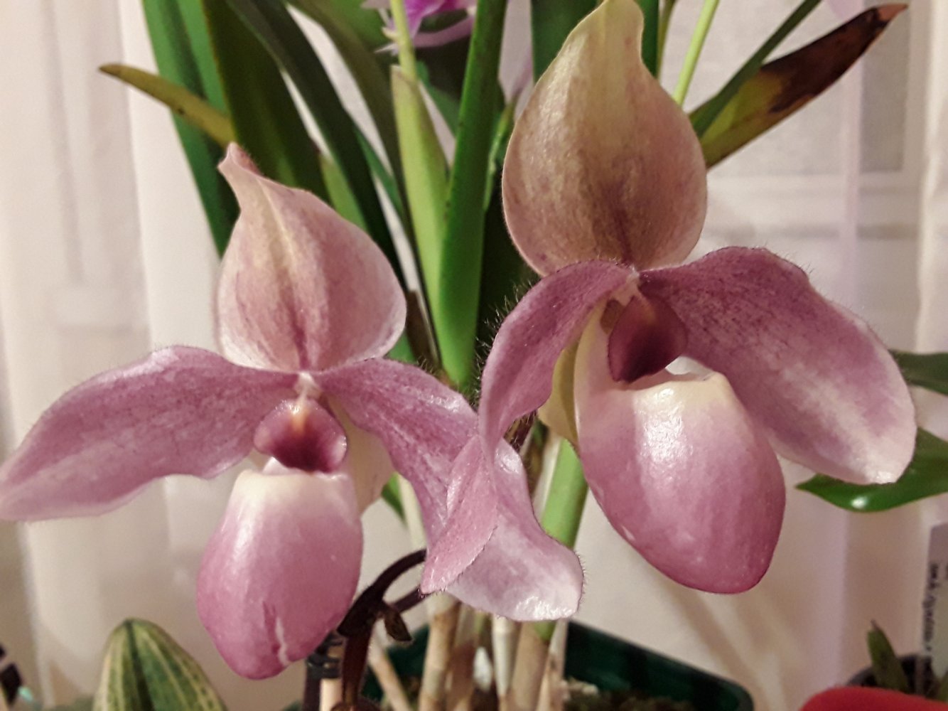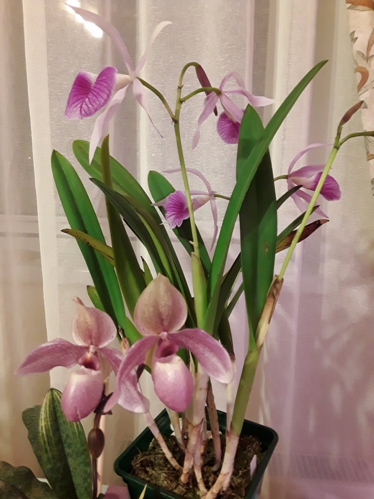 Bl. Morning Glory 'Valentine kiss' в этом году не успела расцвести на Новый год, потому что растит поочередно 4 цветоноса с новых ростов (в прошлые годы растила по 2 новых роста за сезон). Беспроблемнная и ежегодно цветущая крупными ароматными цветами красавица. Сейчас часто можно встретить в продаже Bl. Morning Glory x B. nodosa - это уже будет совсем другое растение (было у меня). Тоже красивое, но оно другое совсем, хотя фото цветения при продаже выставляют именно 'Valentine kiss'. И раскрыл второй цветок Paph. Delophillum (на очереди третий).