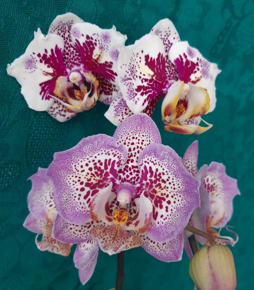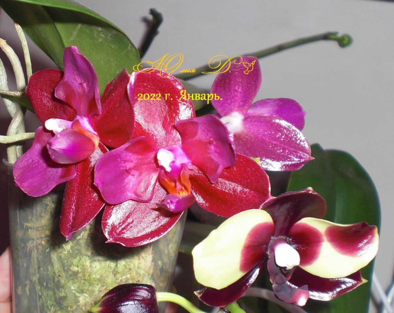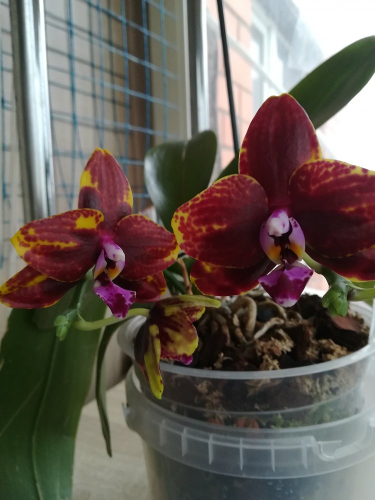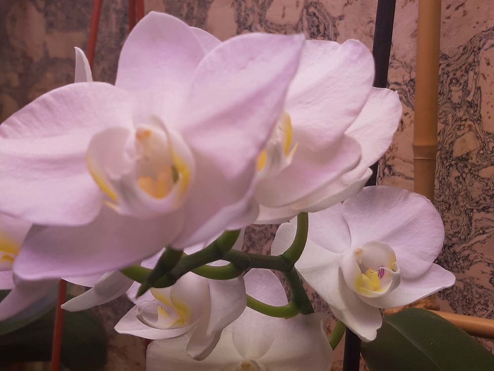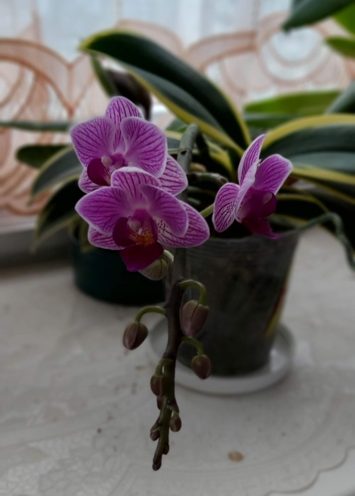 так она цвела в октябре . Лето видимо выдалось очень ей по вкусу - цветы были по 21 см ( только представьте ) в размахе. Но ростов дала много, декабре цвела с роста без чехла ( я думал с ней такого не бывает , но нет- бывает) а сейчас ( о боже ) последние два ( с чехлами) роста снова цветут