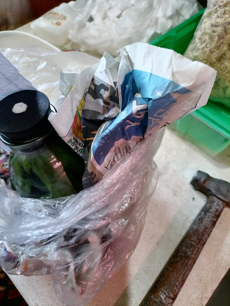 Далее осматриваю фласку. Сеянцы в ней большие, листочки доросли до пробки и размывать такую не получится, только разбивать. Оборачиваю дно фласки в газету и в пакет. Аккуратно ударяю молотком IMG_20220611_144513.jpgпо дну колбы, чтоб не травмировать осколками растенияIMG_20220611_144630.jpg