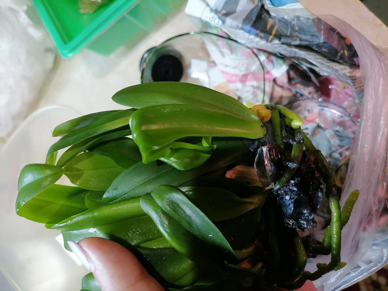 Вынимаю содержимое разбитой фласки и под проточной водой промывают от питательного геля, осколков стекла, опавших или сгнивших листиков, бережно разделяю корни растений IMG_20220611_144807.jpg замачиваю их на 15-20 минут в 0,1% растворе Превикура. Осматриваю каждое растение, кисточкой смываю с корней гель, ножничками отрезаю чешуйки от от павших листьев, чёрные "попки" или гнилые корешкиIMG_20220611_145544.jpgIMG_20220611_151225.jpg