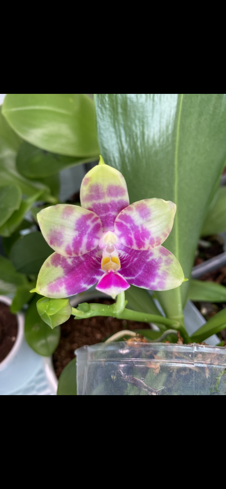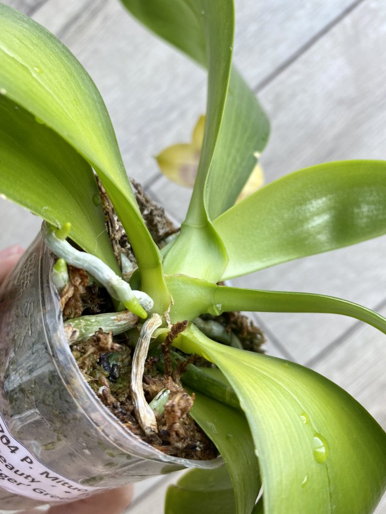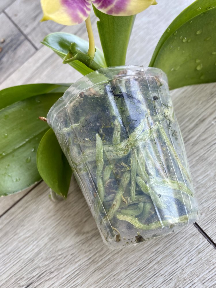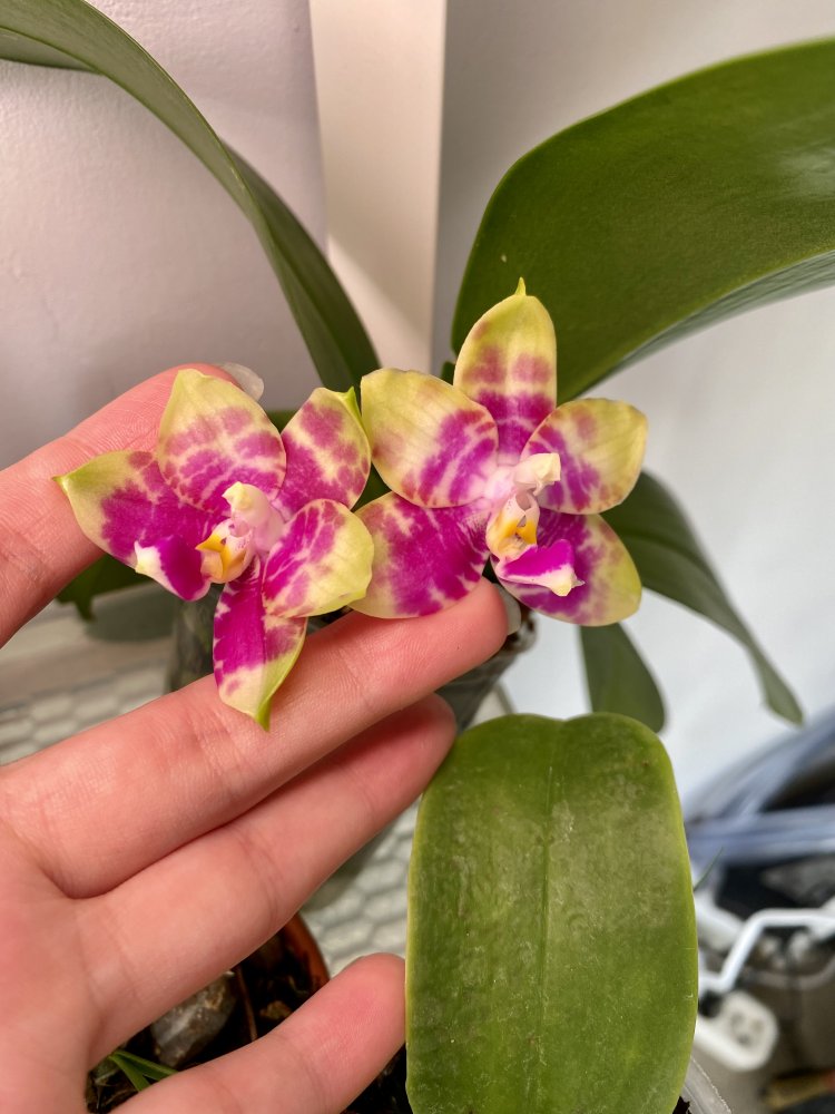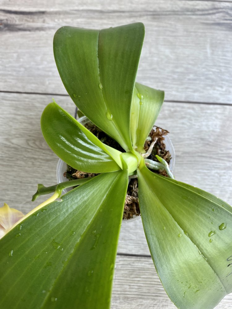 У меня год, корешки все моего выращивания, цветение на фото ее. Сейчас не цветет. Растит новый лист. Цветочки с запахом) Размер почти 3,5, пора пересаживать. На листе механика от когтей кота, давнишняя, не вредит растению)