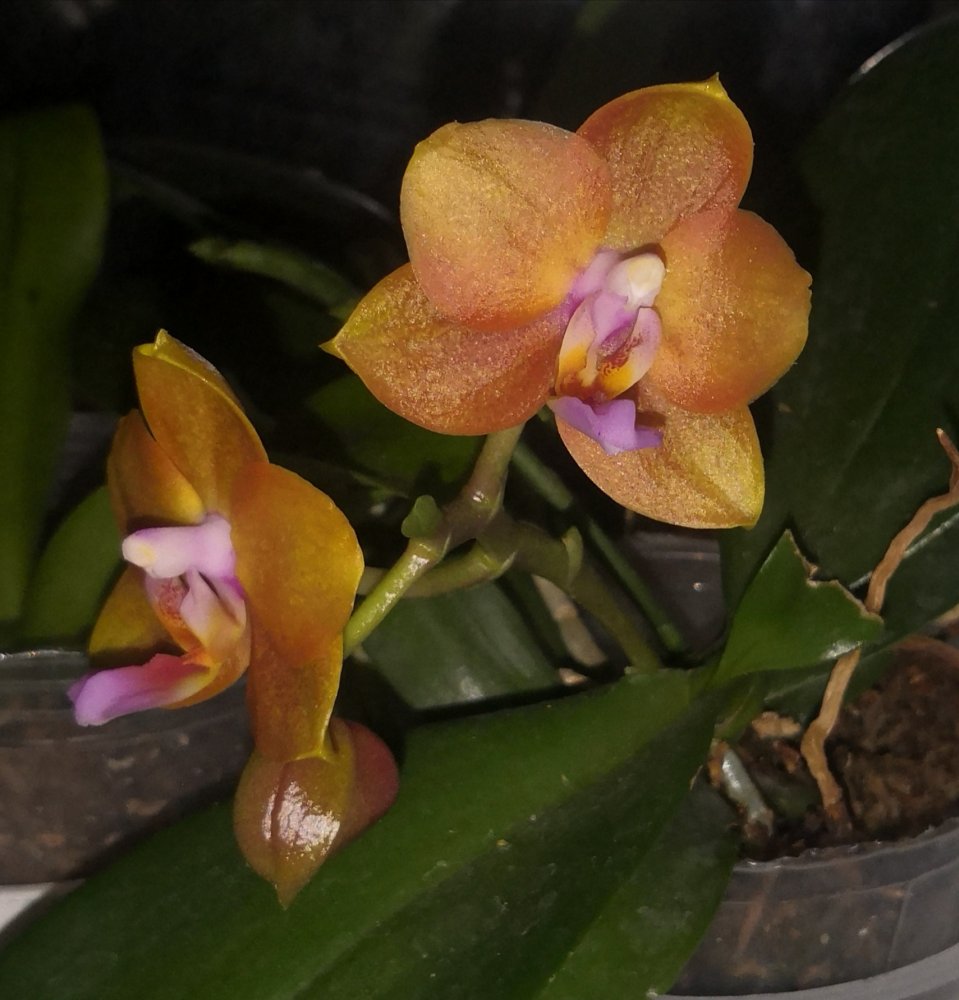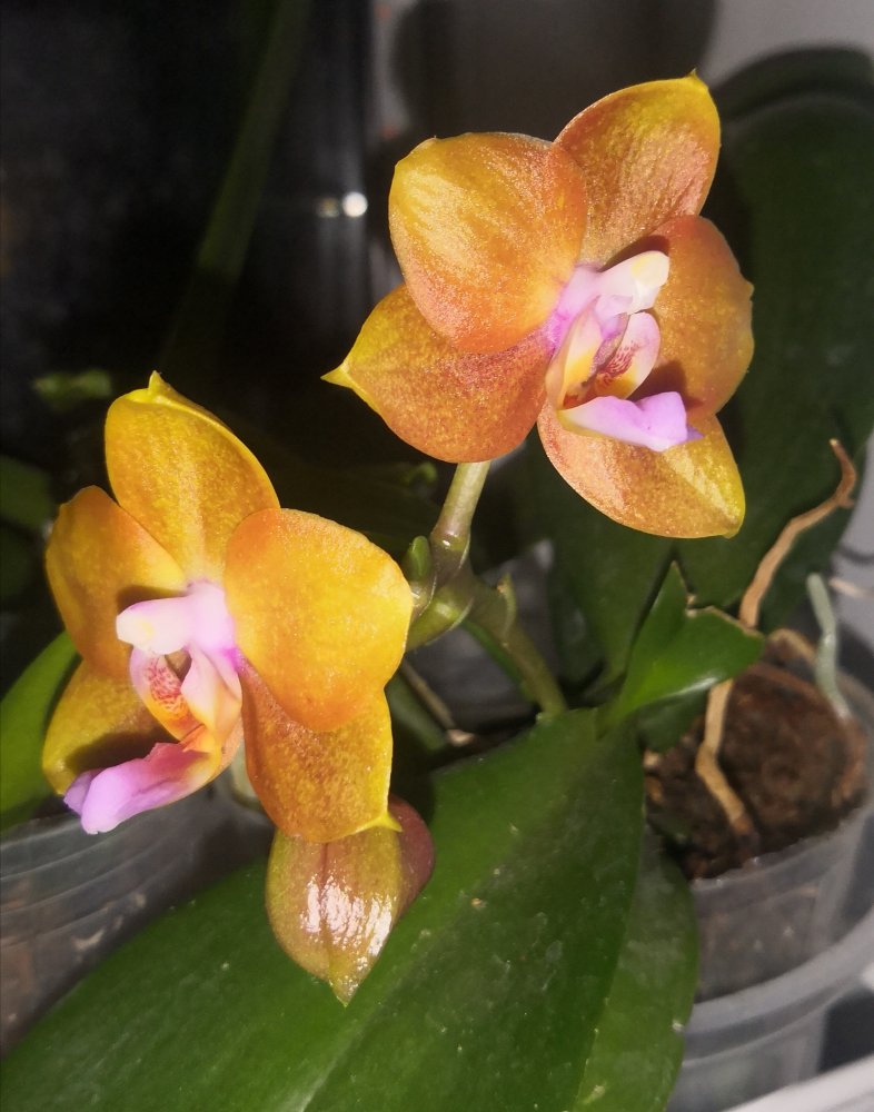 Цветет рыжик от Яфона. Mituo champion king 68-1 SM/toga. Пришел в июне прошлого года уже взрослым и ранее цветшим. Цветочки не большие 4,5см, в зависимости от угла и освещения, меняется оттенок - желтая подложка с терракотовым напылением и нежно-розовые колонка и губа. Ароматный.