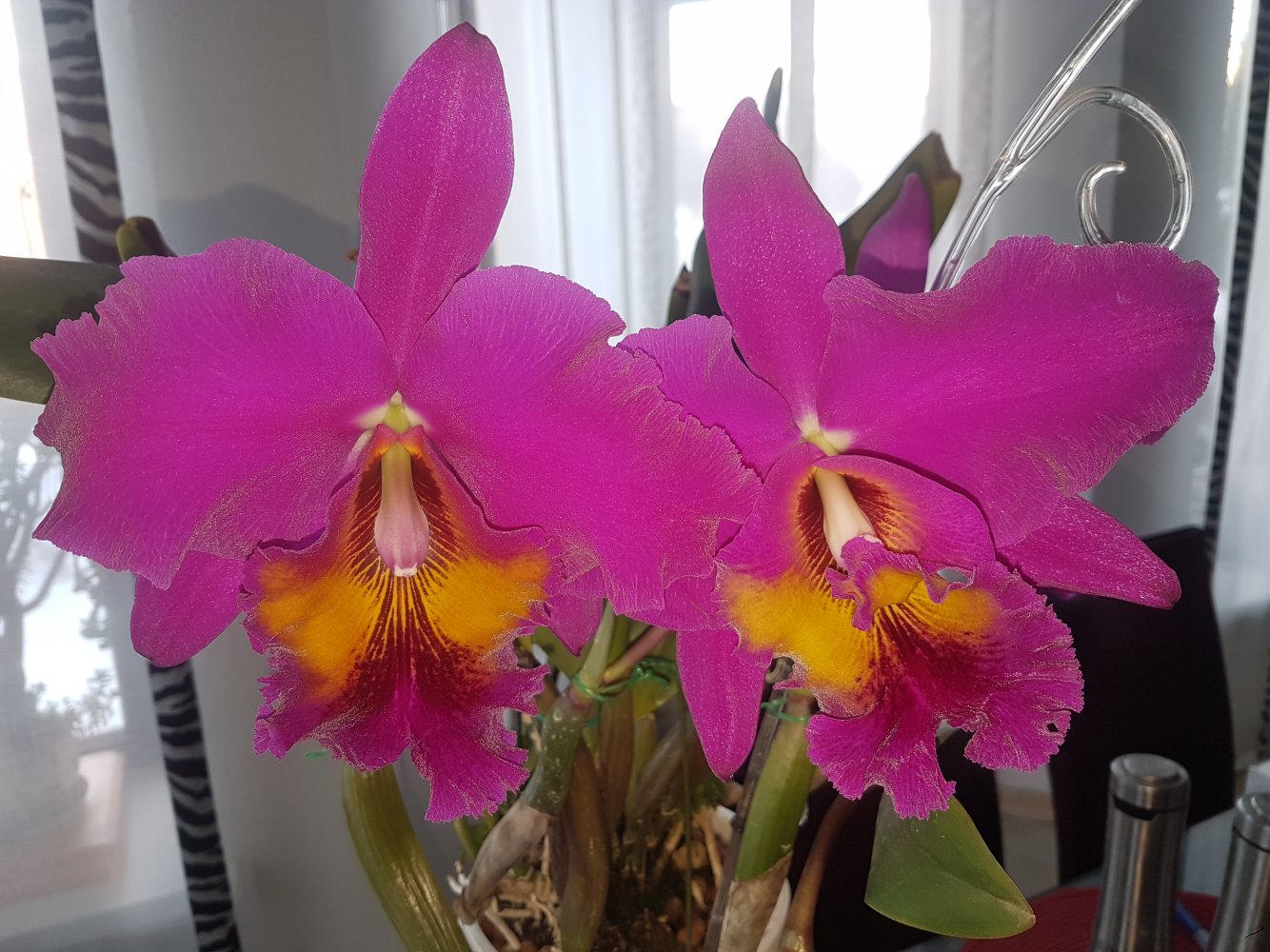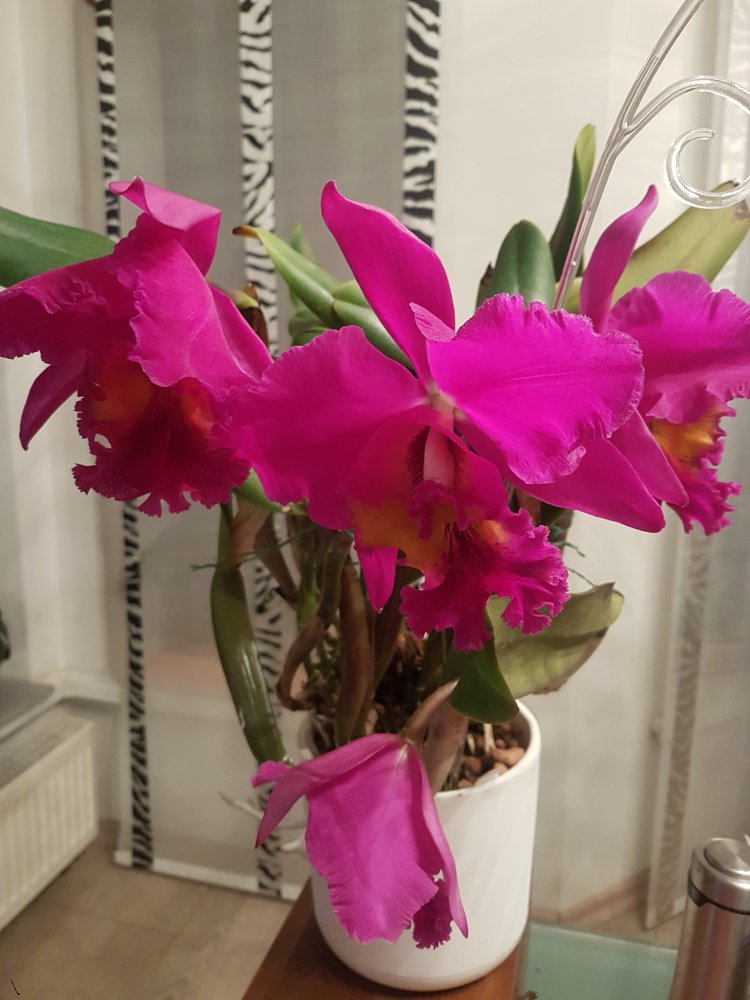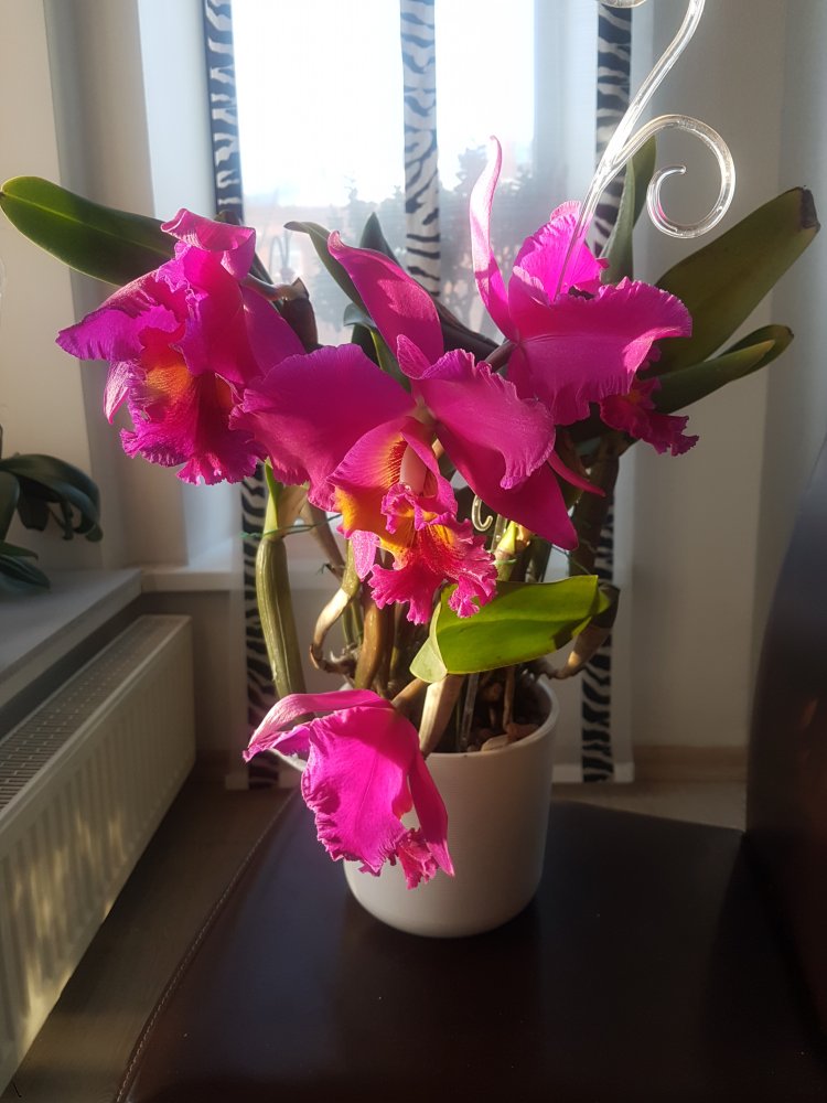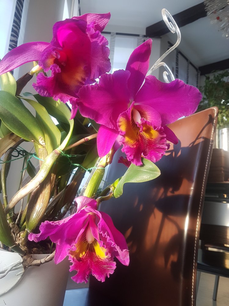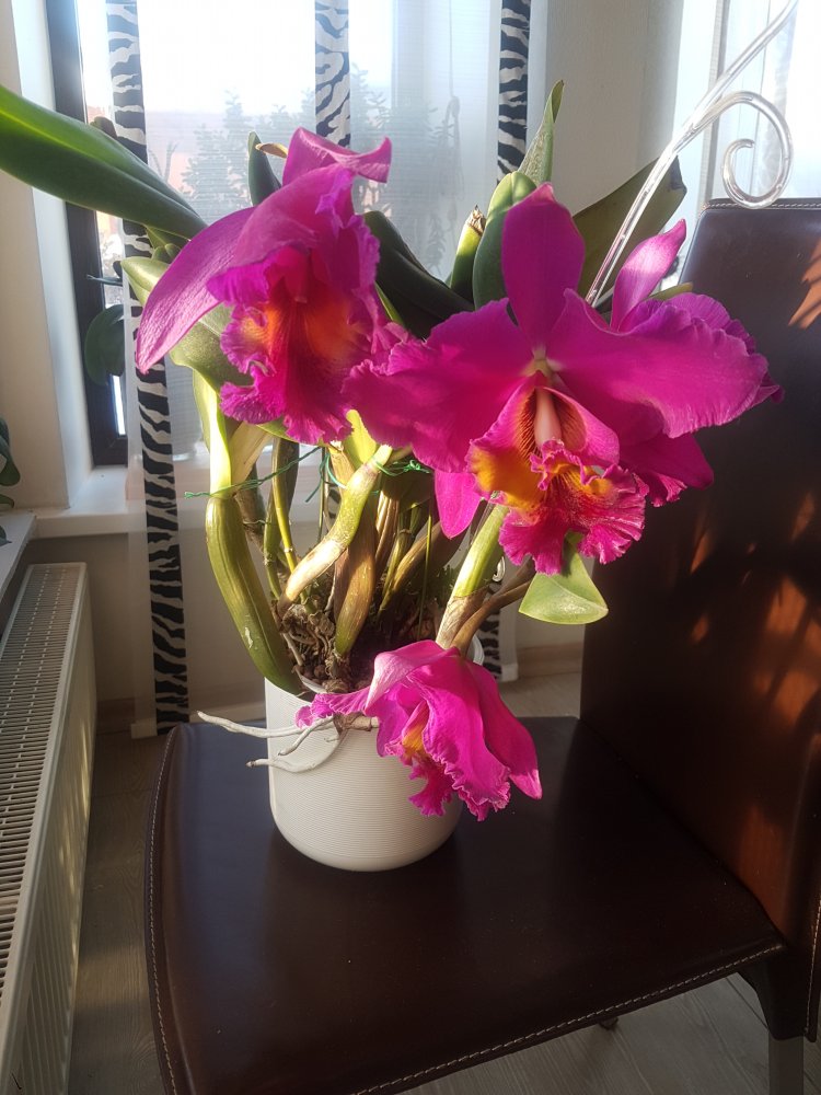 Все цветет моя красавица blc. The King of Tailand. Сейчас уже цветут одновременно все 4 цветка. Правда, первый немножко подустал.20230113_112547.jpg20230115_222612.jpgIMG_2023_01_16_15_07_52_7038770674573549247707.jpgIMG_2023_01_16_15_08_42_747680951192130248449.jpgIMG_2023_01_16_15_09_47_3596905673473994262480.jpgIMG_2023_01_16_15_10_38_1241790751089289228273.jpg Огромные цветы ( около 22 см!), сильный аромат, долгое цветение. Само растение, правда, тоже большое-высота листьев от уровня грунта-50 см, места требует много. Не помещается на полке стеллажа с подсветкой, стоит на подоконнике южном, подсветки не получает, цветет исправно, с каждого нового роста. В этом году после цветения думаю пересадить. Еще не решила, поделю или попробую сохранить большой размер, чтобы наслаждаться пышным цветением.