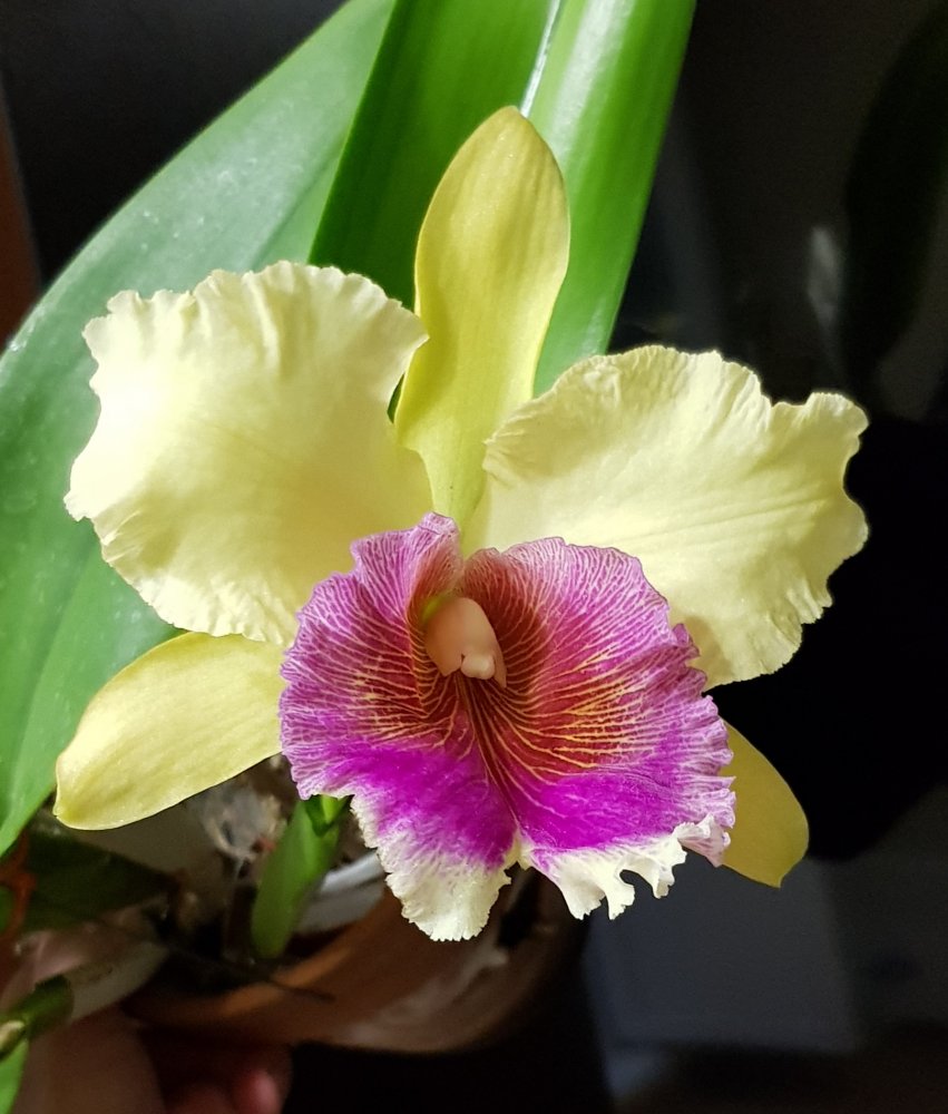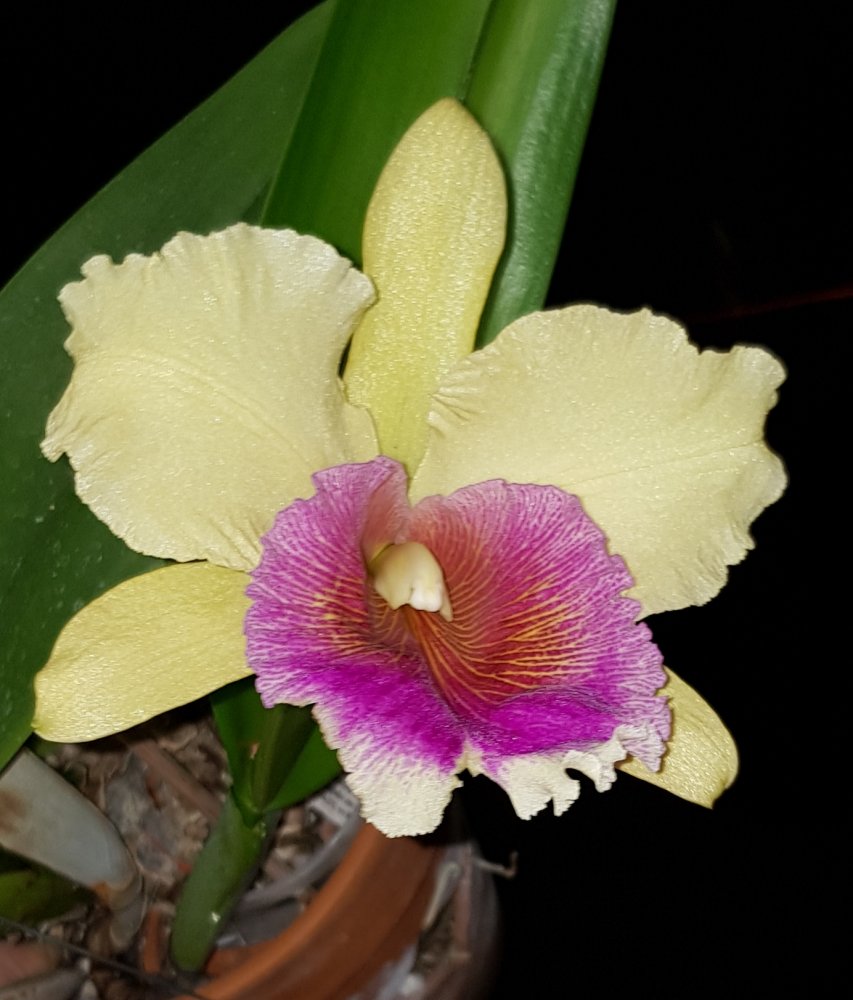 Приехал он ко мне от Мики в 2014г взрослым, очень взрослым растением. Цветения долго ждать не пришлось и через пару месяцев появился цветонос, а потом и первые цветы-крупные 8-9см, бархатные, даже объемные, с кружевным краем. Сам цветок богатого винного оттенка, а кайма бледно лимонная. Хорош неимоверно!